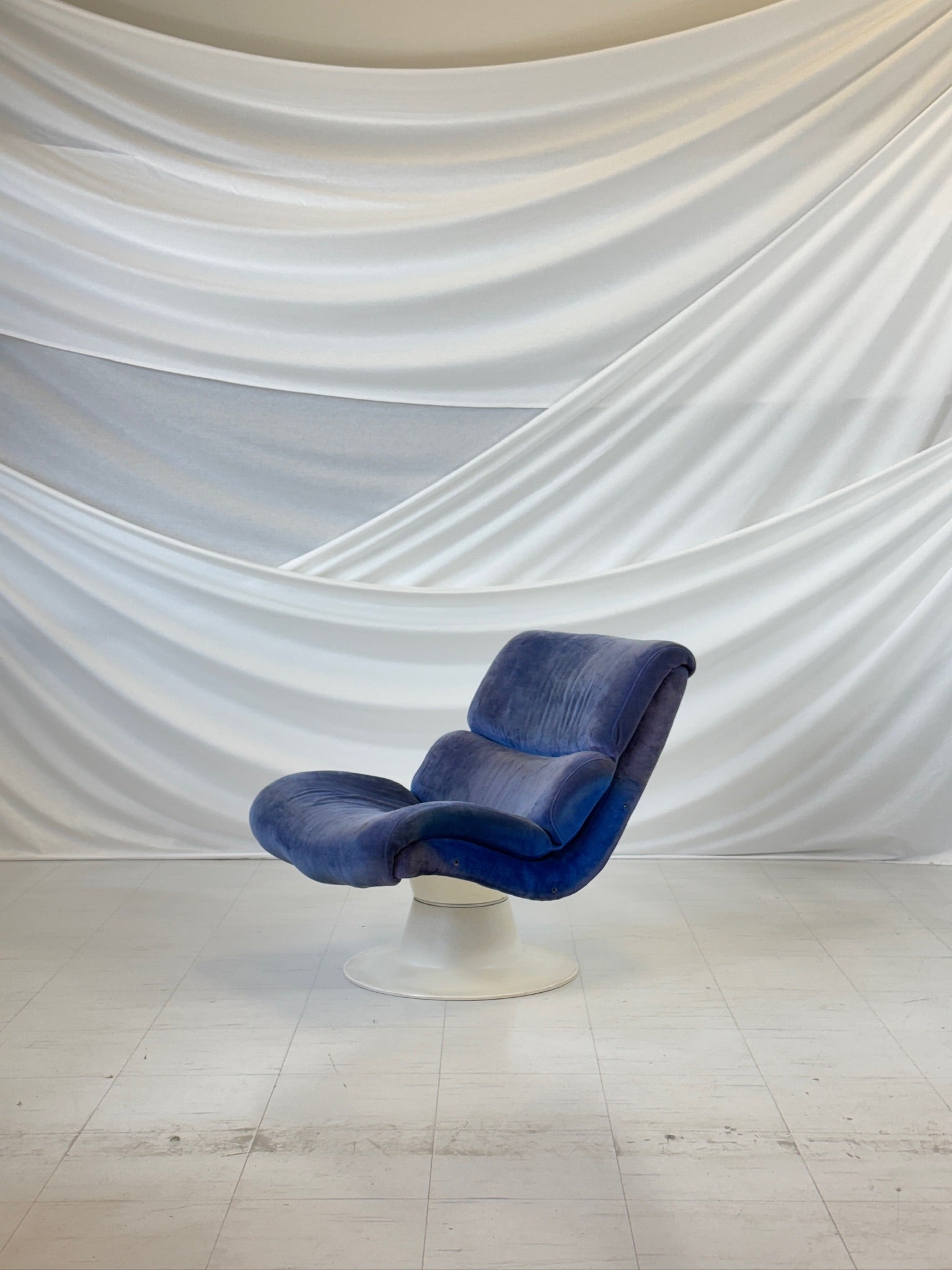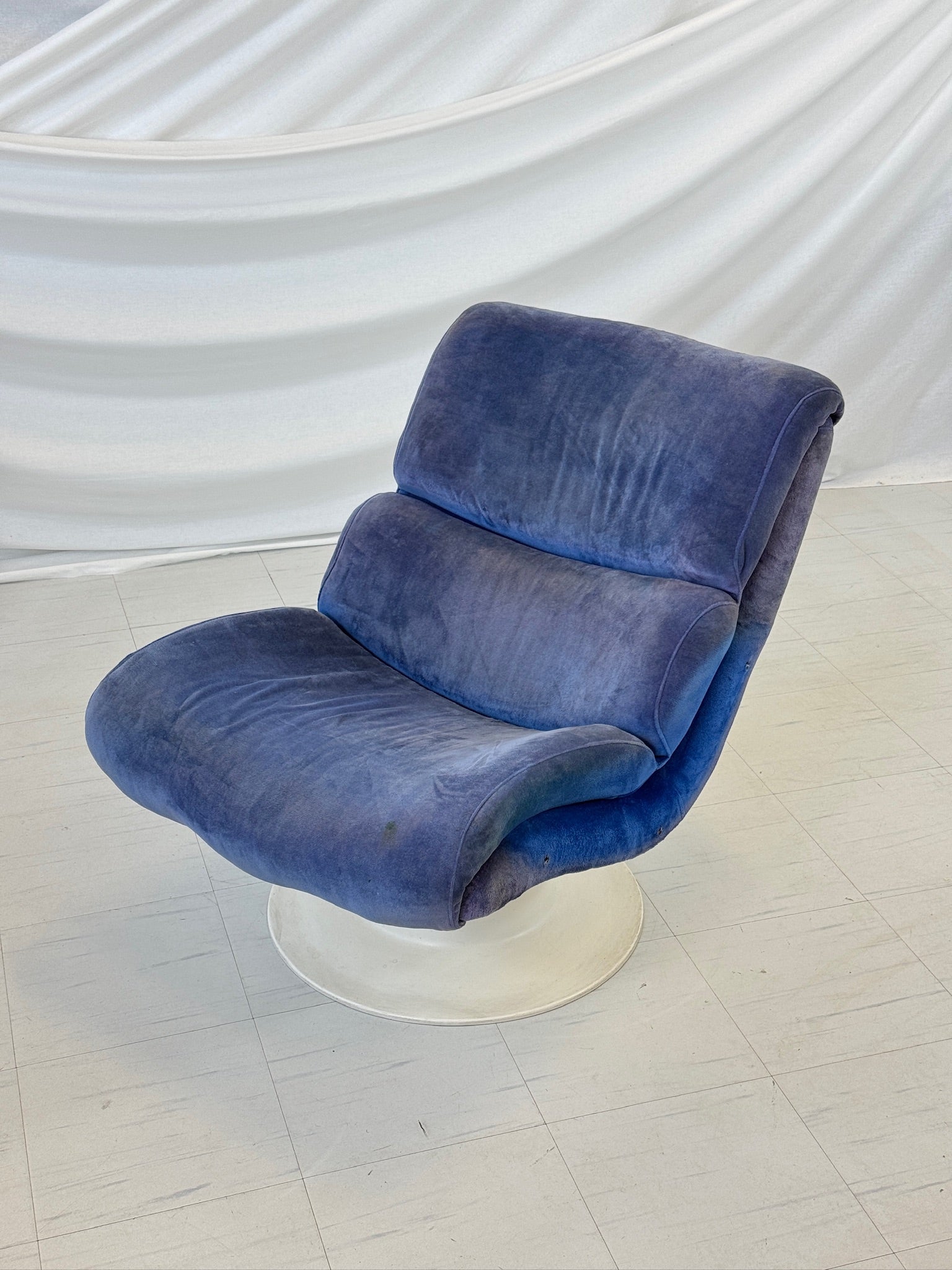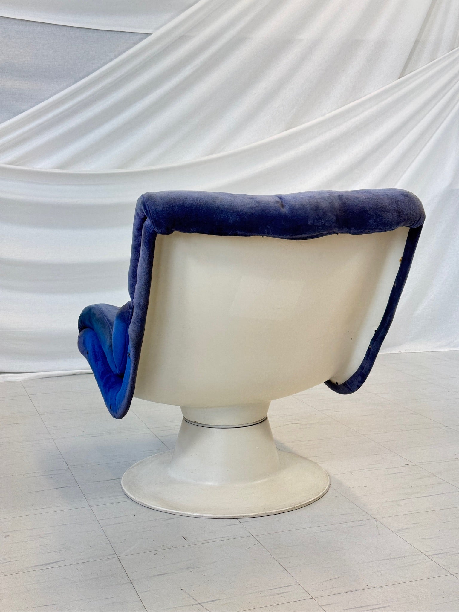 大胆なブルーのベルベットの張り地が白いグラスファイバーのシェルと美しく調和し、1970 年代にクッカプロがハイミのために手がけた作品に典型的な印象的なコントラストを生み出しています。