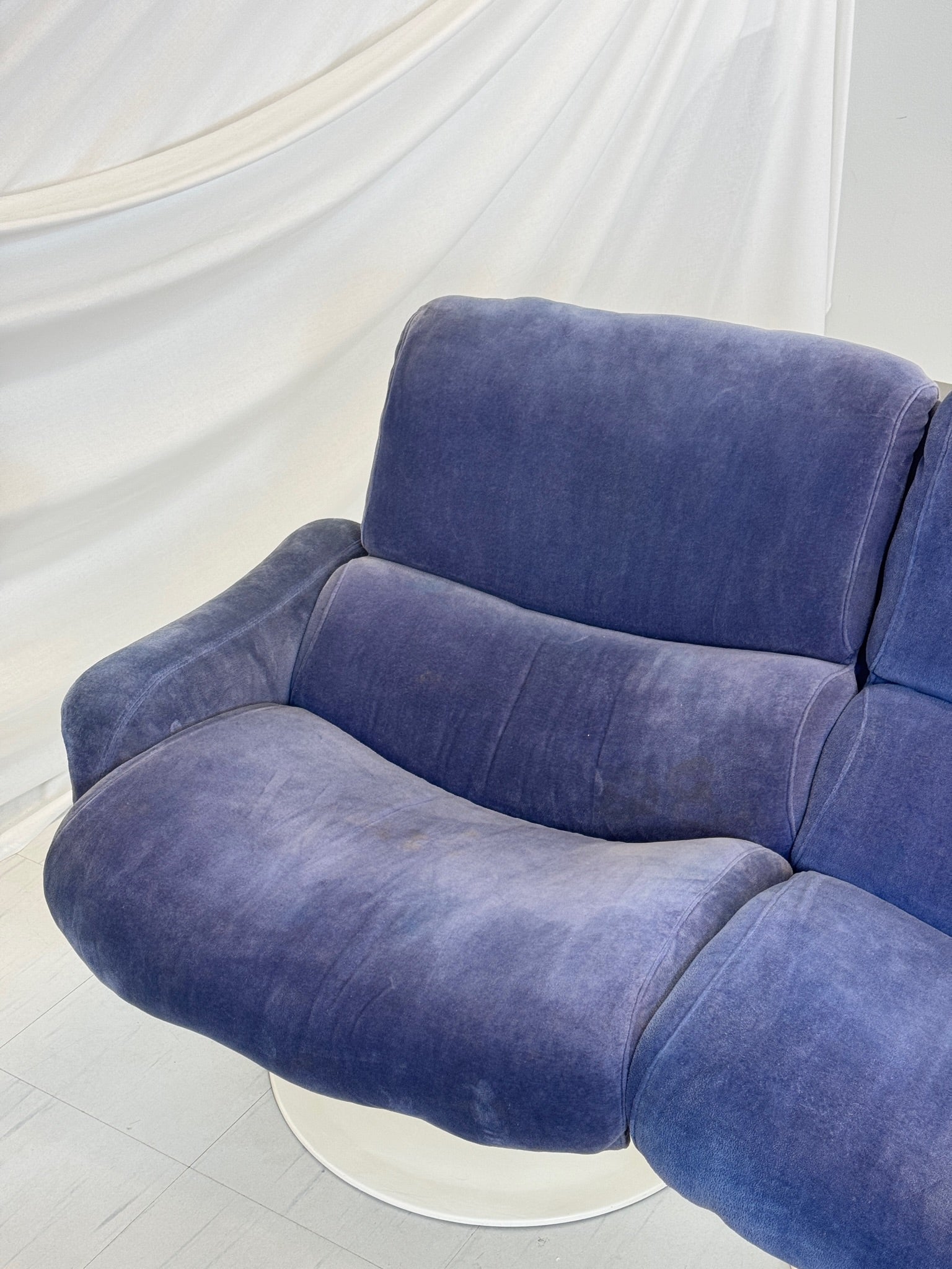このソファはヴィンテージとして良好なコンディションを保っており、経年変化と使用に伴う軽い摩耗が見られます。ベルベットの張地には古色が出ています。白いベースは良好な状態です。構造的にもしっかりとしており、快適です。
