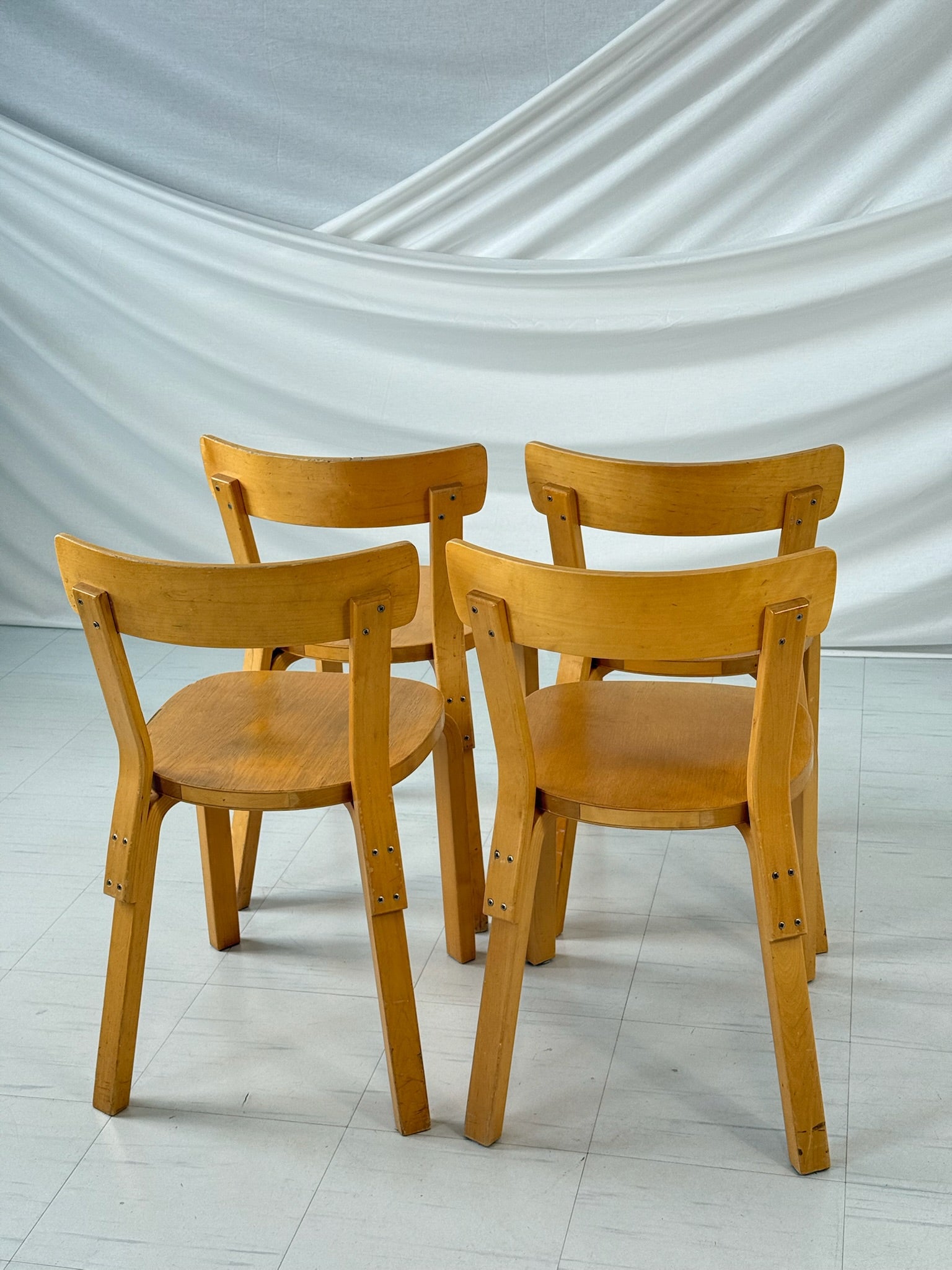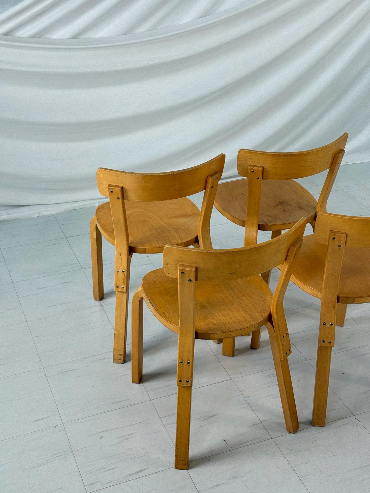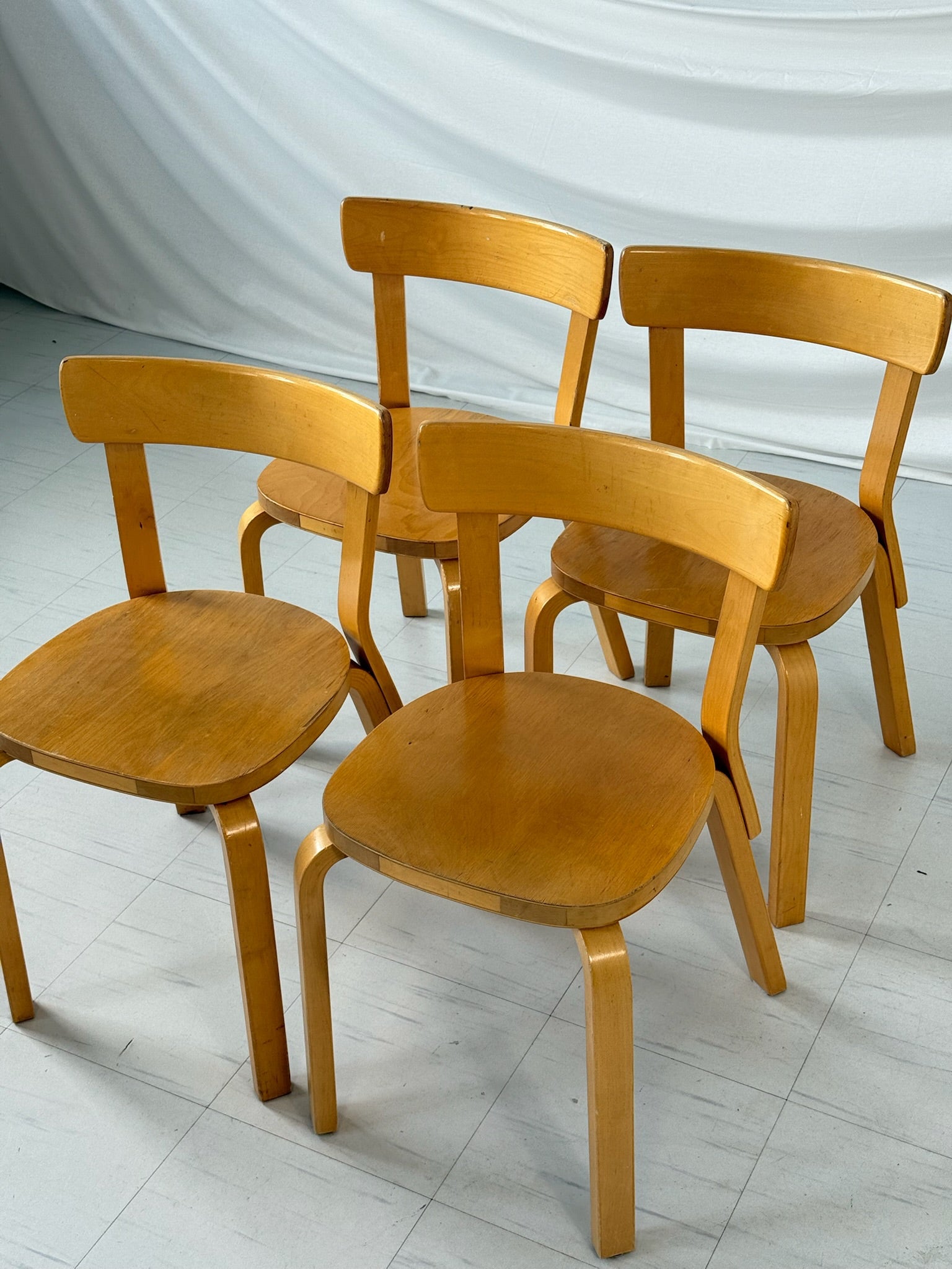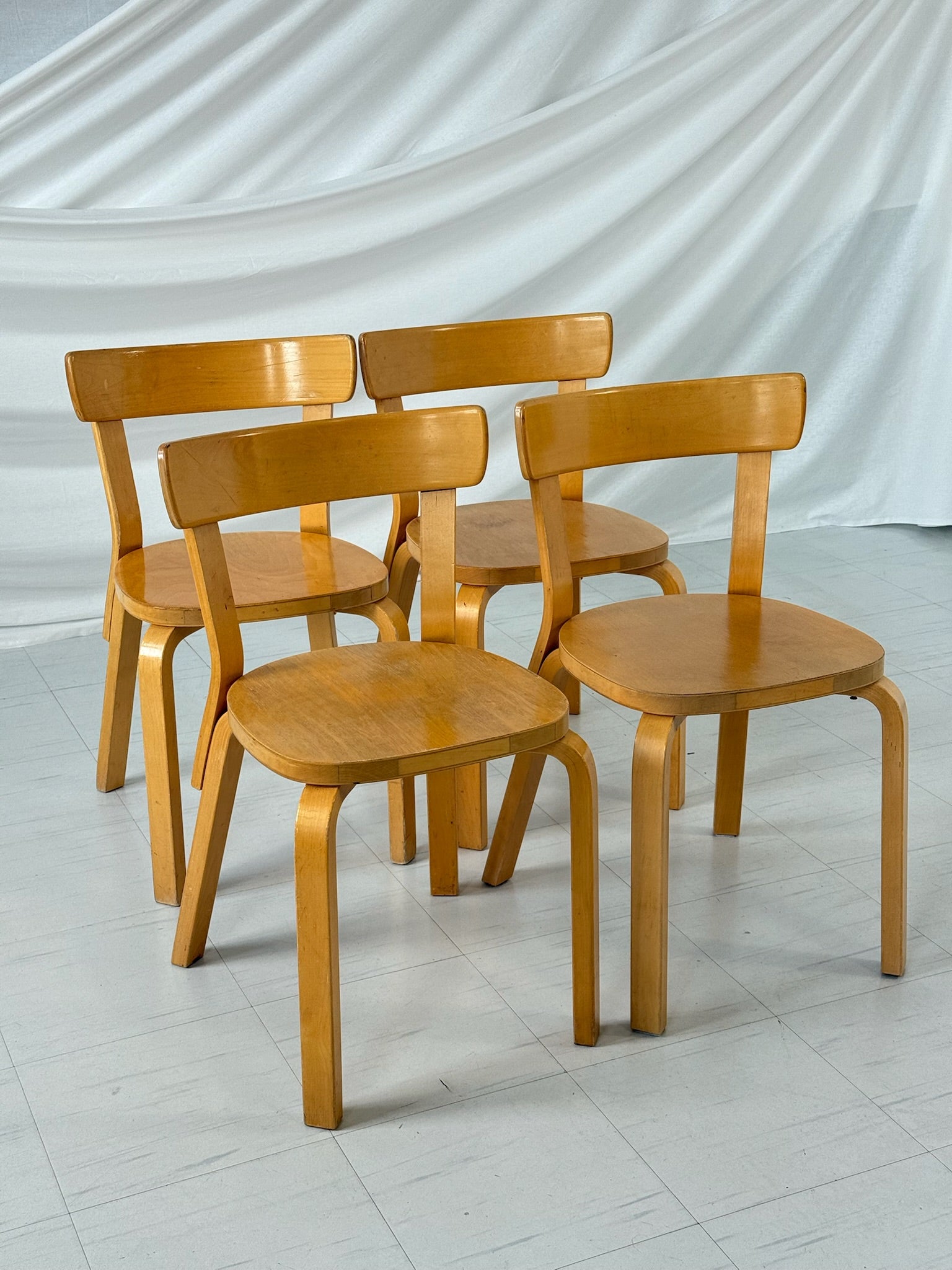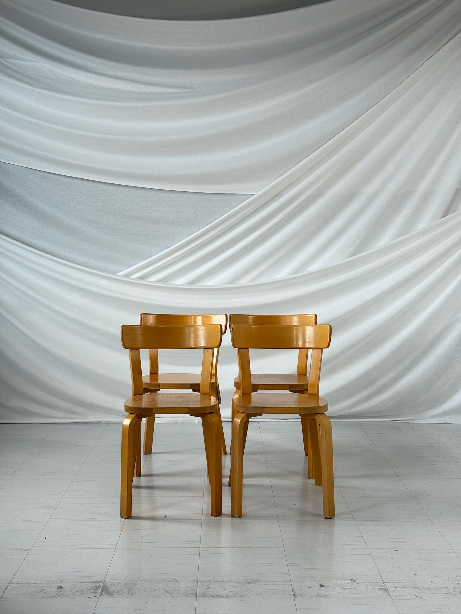 알바 알토가 1935년 처음 디자인한 69번 의자는 그의 가장 사랑받고 실용적인 의자 디자인 중 하나입니다. 시그니처 L자형 다리 구조, 곡선형 자작나무 등받이, 그리고 넉넉한 좌석을 갖춘 이 의자는 독특한 건축적 형태로 일상의 편안함을 선사합니다. 이 4개 세트는 은은한 고풍스러움이 느껴지는...