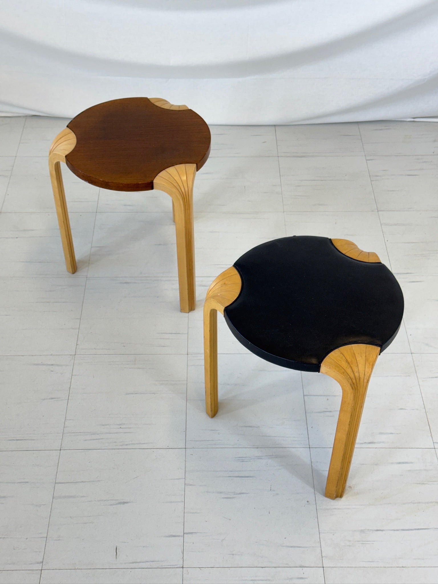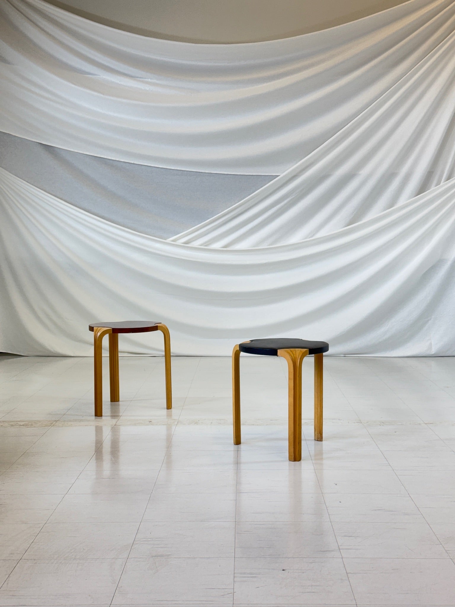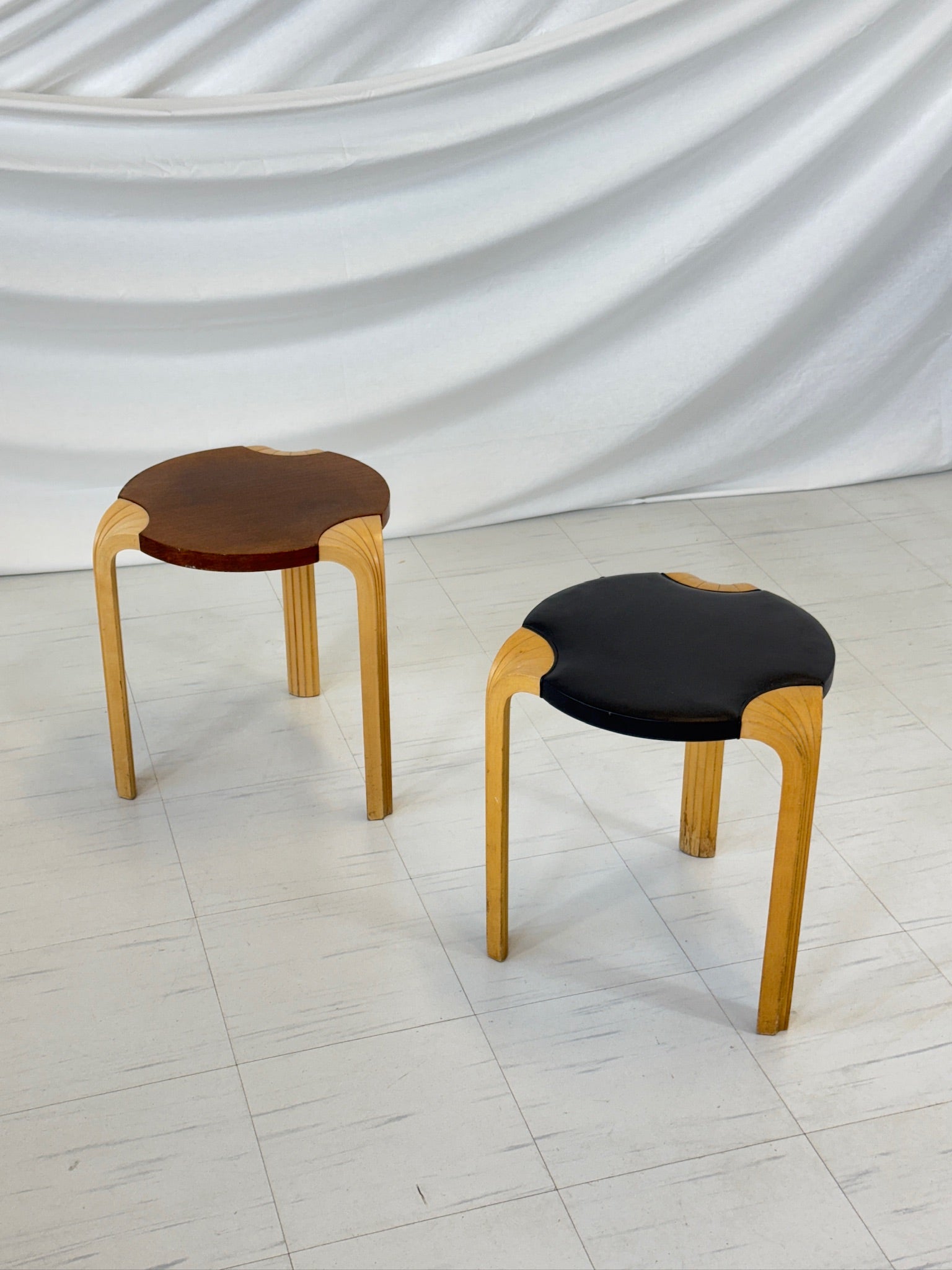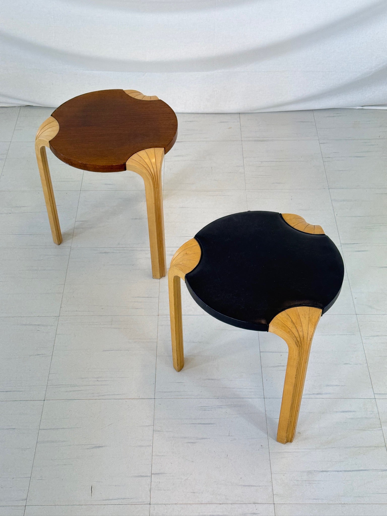 알바 알토의 시그니처 "부채 다리" 구조를 특징으로 하는 희귀한 빈티지 아르텍 스툴입니다. 다리와 좌석 사이의 조각적인 접합부는 유기적인 형태와 혁신적인 합판 기법에 대한 알토의 헌신을 잘 보여줍니다. 하나는 짙은 원목, 다른 하나는 무광 블랙 가죽으로 제작되었으며, 두 스툴 모두 아름다운 자작나무 부채꼴 디테일을 자랑합니다.