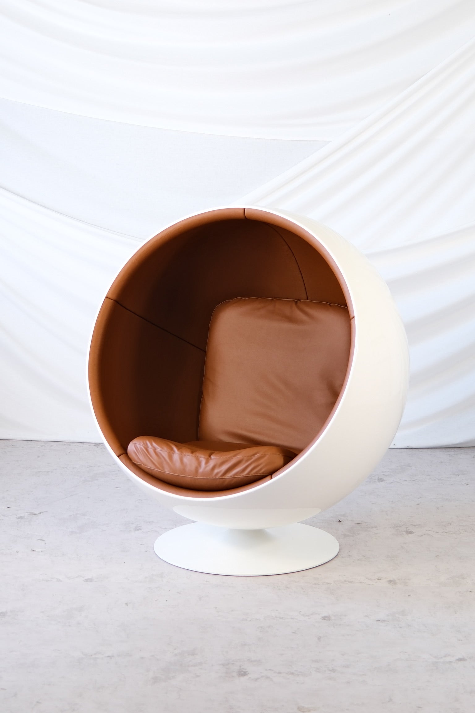 The Ball Chair, designed by Eero Aarnio in 1963, is one of the most iconic pieces of Finnish design. Produced by Eero Aarnio Originals, this version features a glossy white fiberglass shell and brown leather upholstery inside. The spherical form creates a private, cocoon-like space while still making a bold statement in any interior.