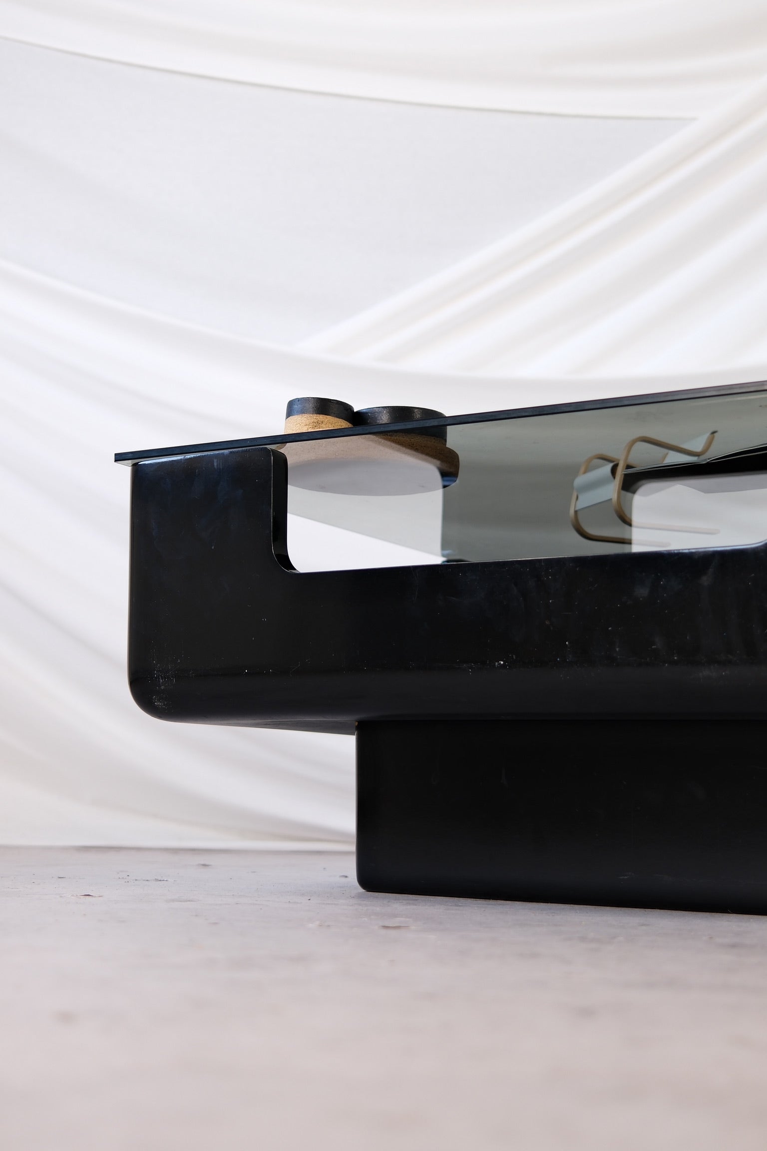 Designed by Finnish designer Eero Aarnio, this sculptural coffee table captures the playful futurism that defined his work in the 1960s and 70s. The bold geometric form, molded from glossy black fiberglass, features integrated open storage on all sides, topped with a thick smoked glass surface.