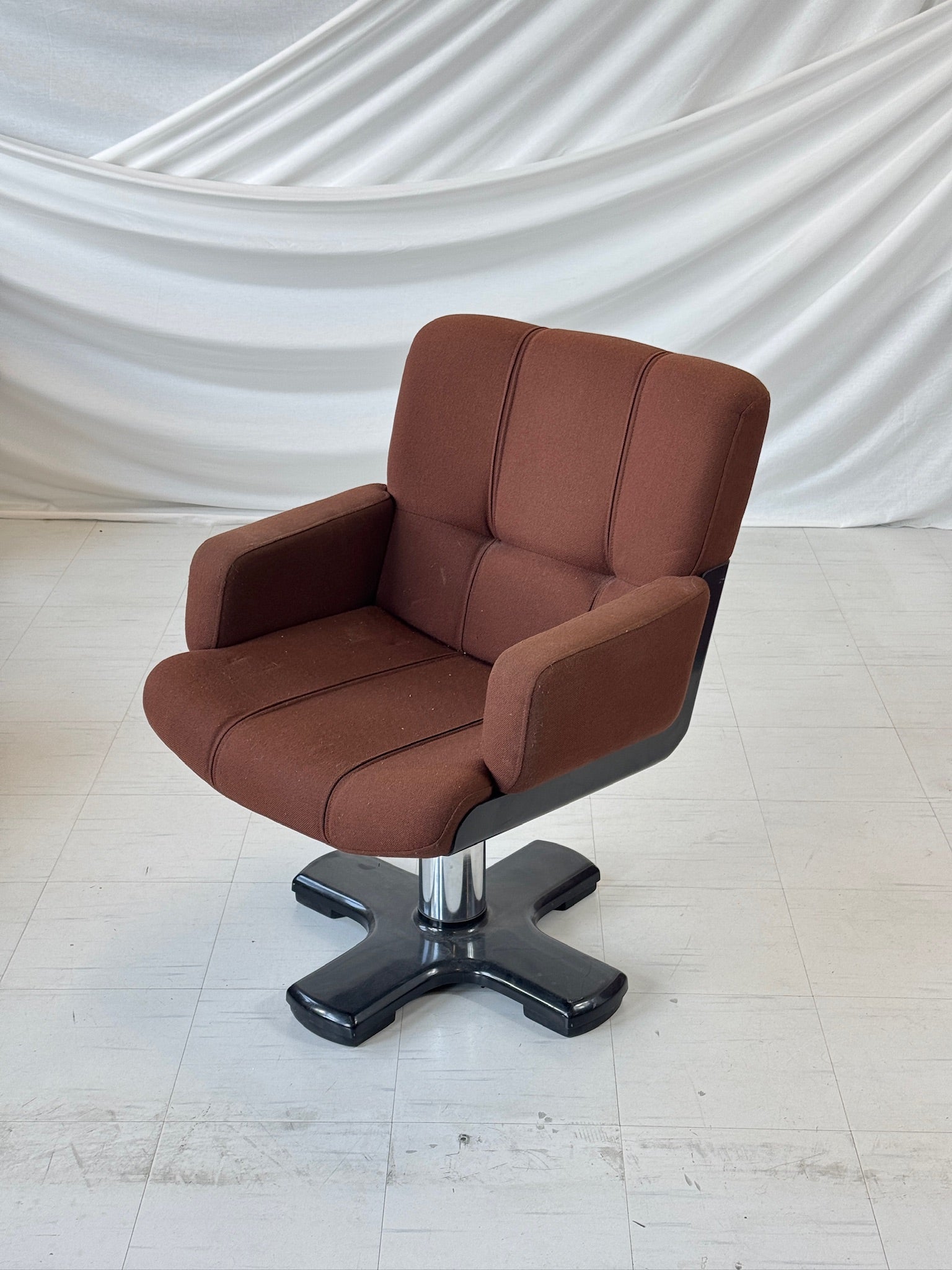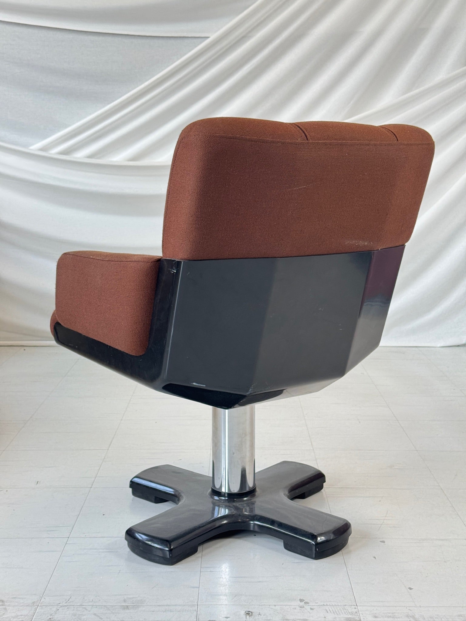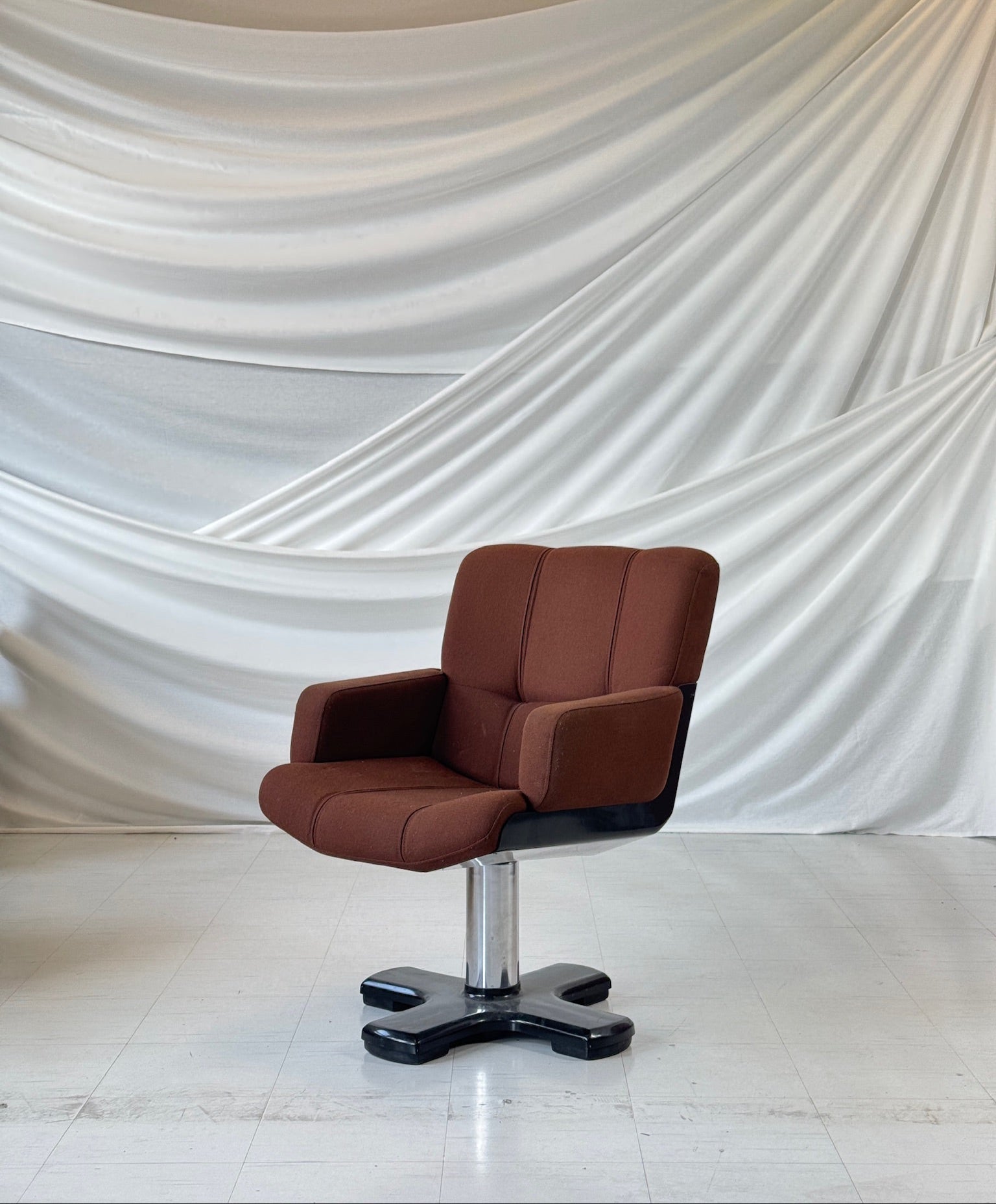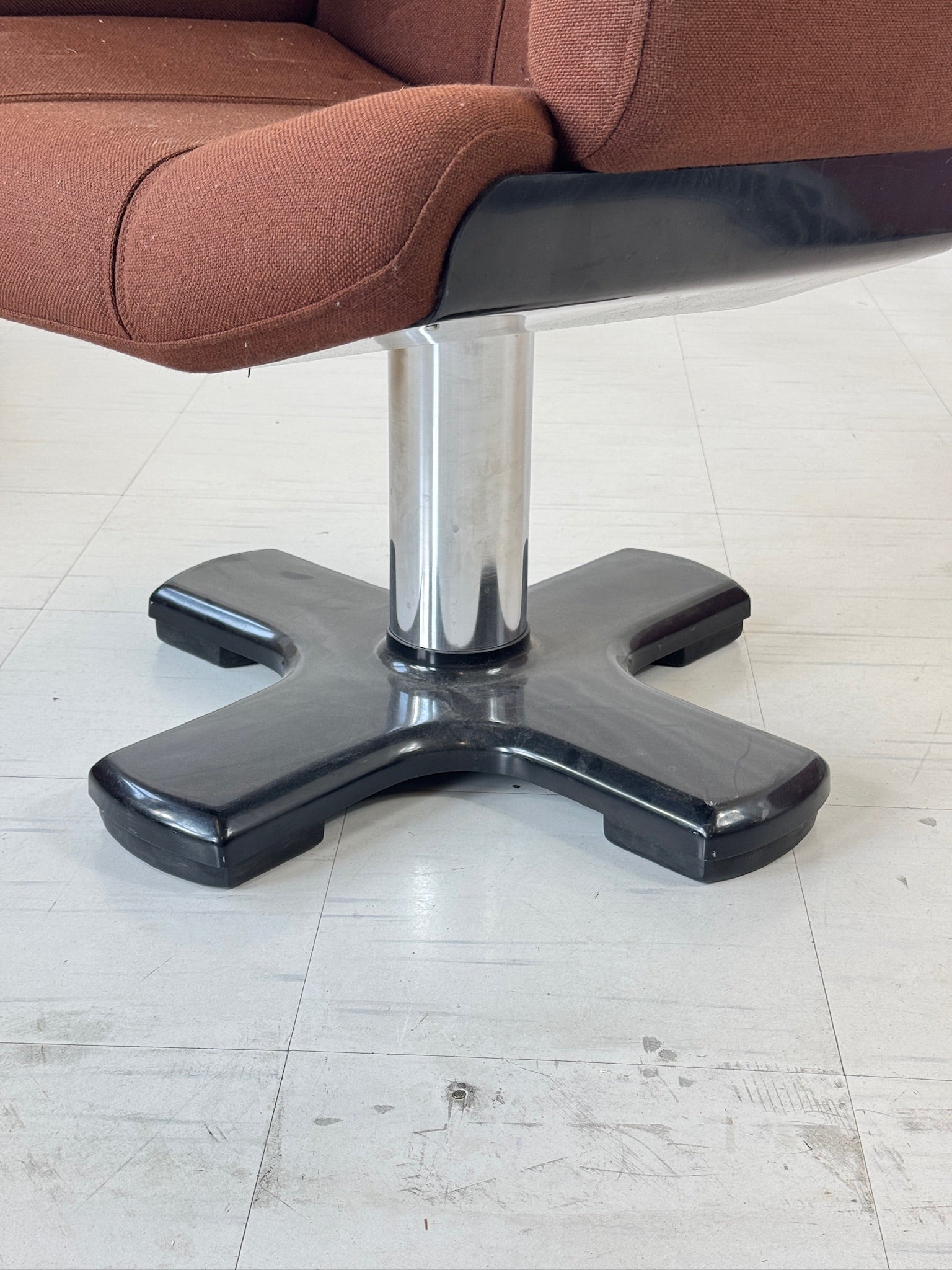1970년대 카리-페카 발로린타가 디자인한 노틸러스 의자는 당대의 미래적인 분위기를 담아낸 대담하고 조형적인 작품입니다. 넉넉한 좌석, 각진 팔걸이, 그리고 광택이 나는 크롬 기둥이 돋보이는 검은색 플라스틱 네 별 모양의 받침대가 특징입니다.