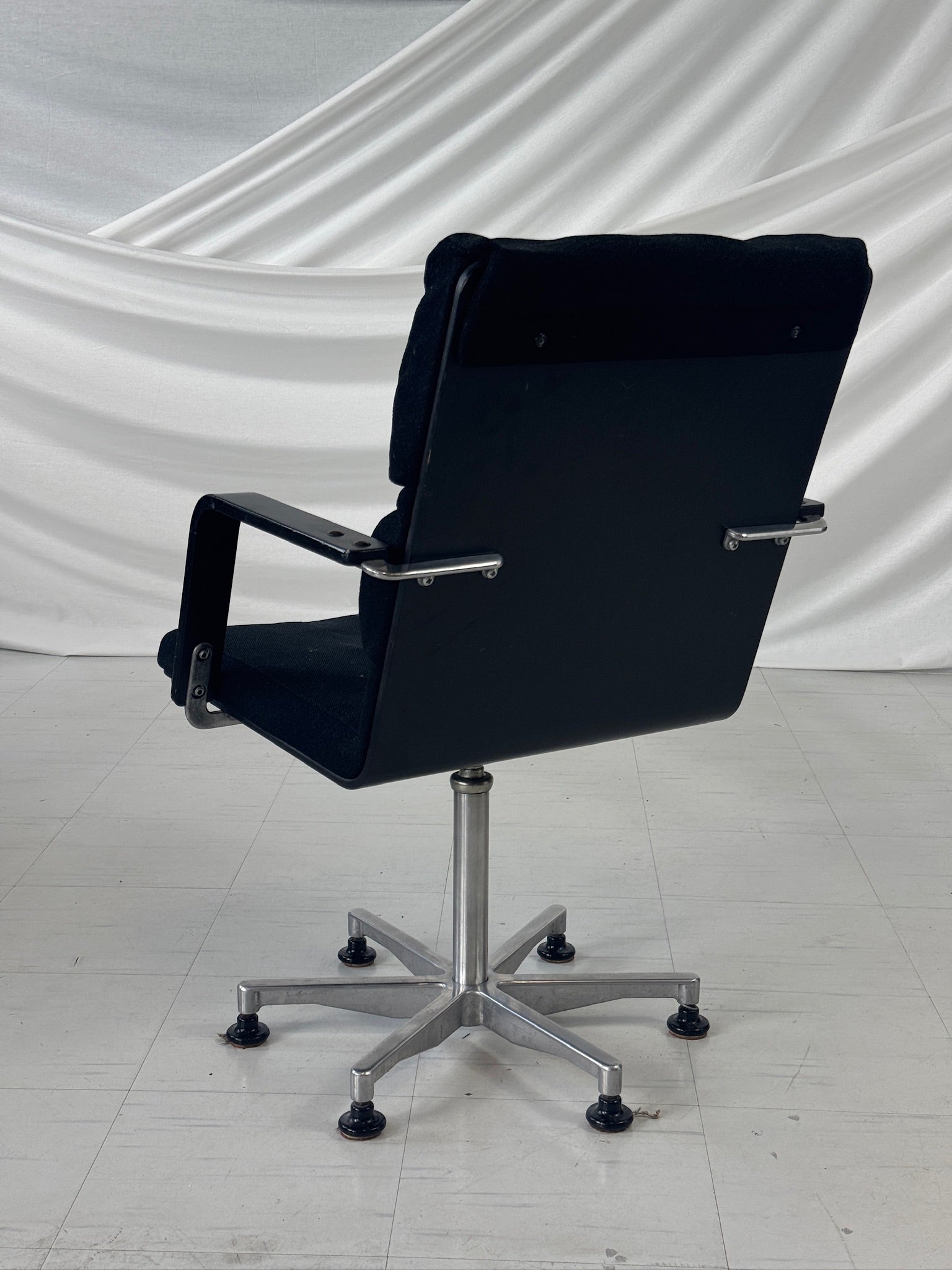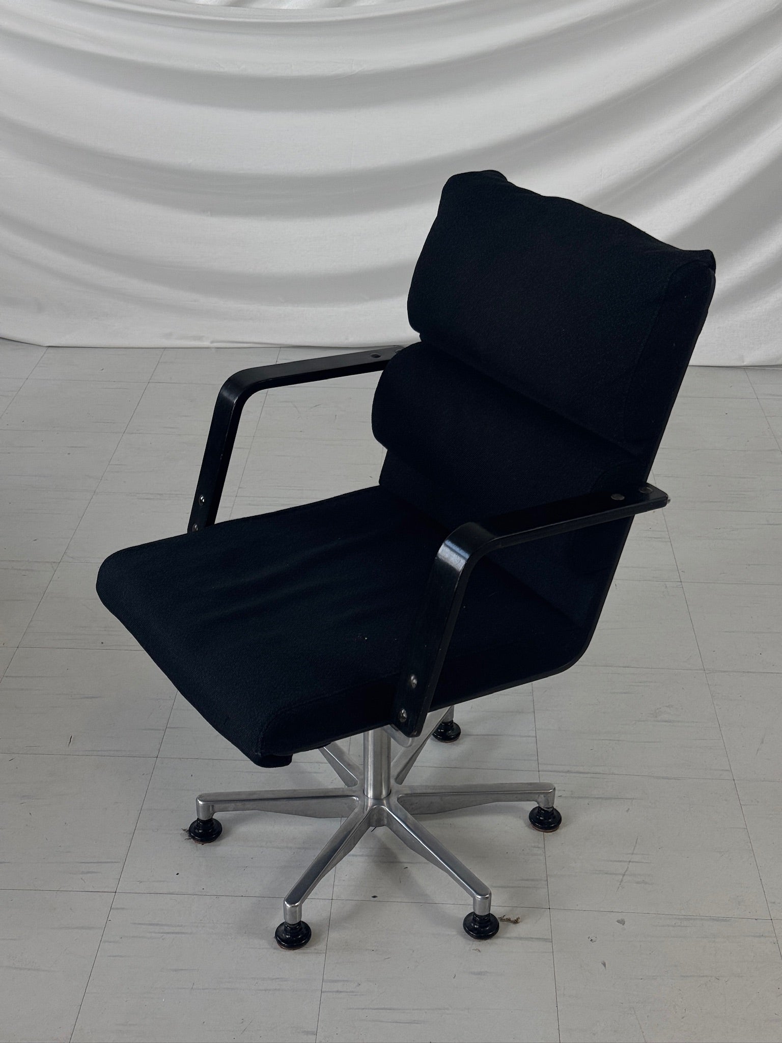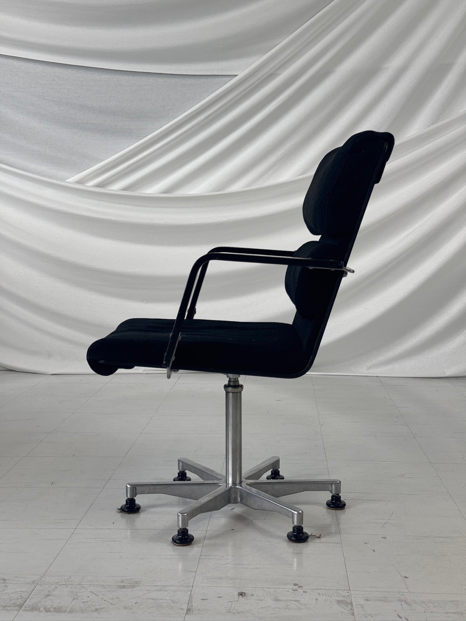프레임은 광택 처리된 알루미늄으로 제작되었으며, 5스타 베이스, 조절 가능한 글라이드, 그리고 검정색 팔걸이가 특징입니다. 의자는 오리지널 검정색 원단으로 마감되었으며, 넉넉한 쿠션감의 좌석과 등받이는 하루 종일 편안함을 선사합니다. 사무실, 스튜디오 또는 모던한 인테리어의 포인트 의자로 사용하기에 이상적입니다.