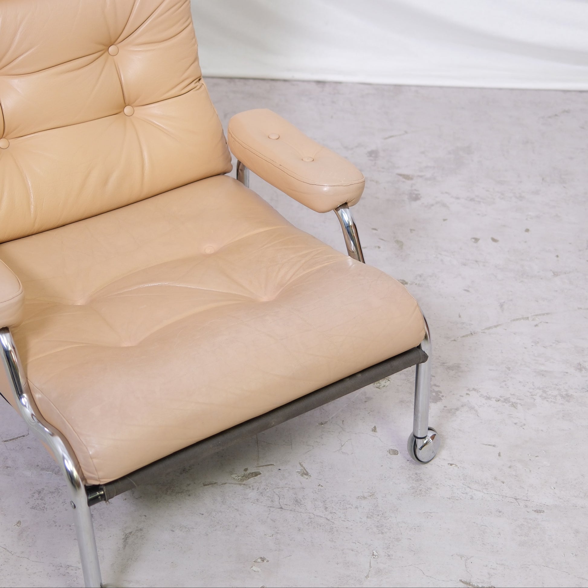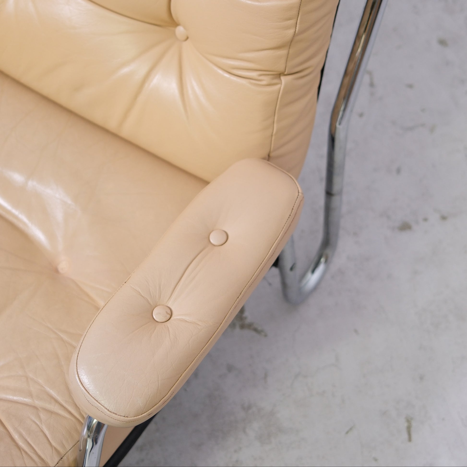 A classic Danish lounge chair with a relaxed, low profile that works especially well in living rooms and reading corners. The chrome frame keeps it visually light, and the beige leather brings warmth and softness to the look.