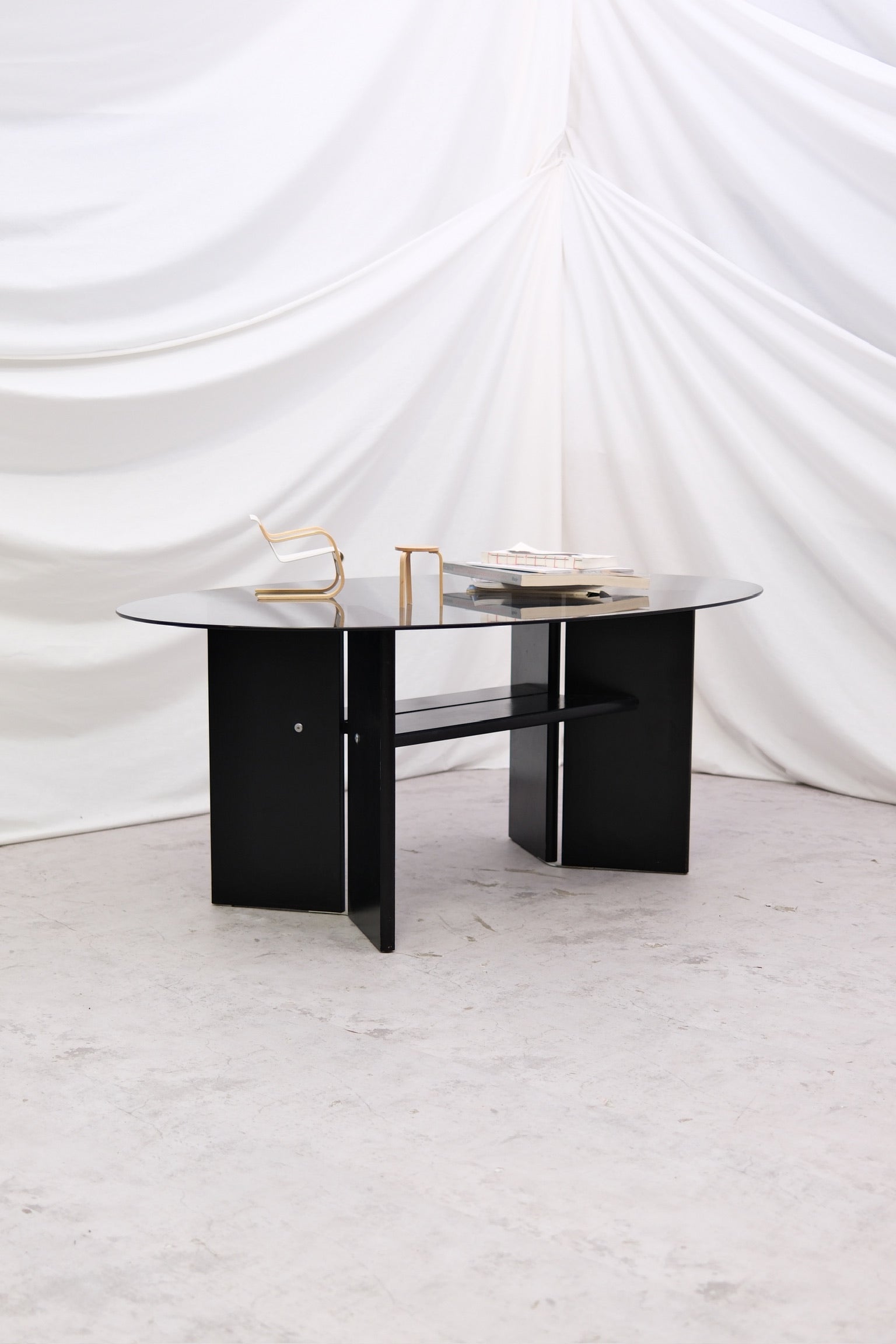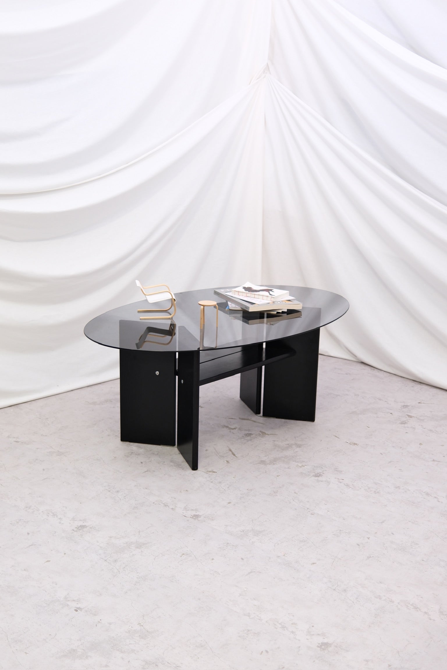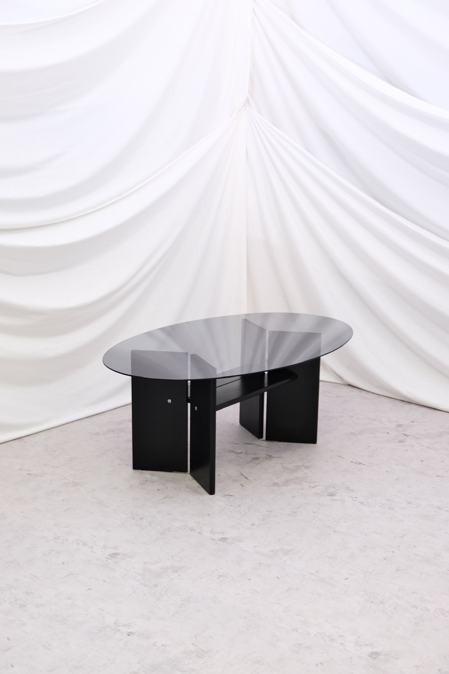 모던한 우아함과 시대를 초월한 매력이 완벽한 조화를 이루는 눈길을 사로잡는 빈티지 이탈리아 커피 테이블입니다. 타원형 스모크 유리 상판과 조각 같은 검은색 원목 받침대가 어우러져 대담하면서도 세련된 실루엣을 완성합니다. 깔끔하고 기하학적인 선과 세련된 소재가 어우러져 미니멀리스트 인테리어, 중세풍 분위기, 다양한 빈티지...