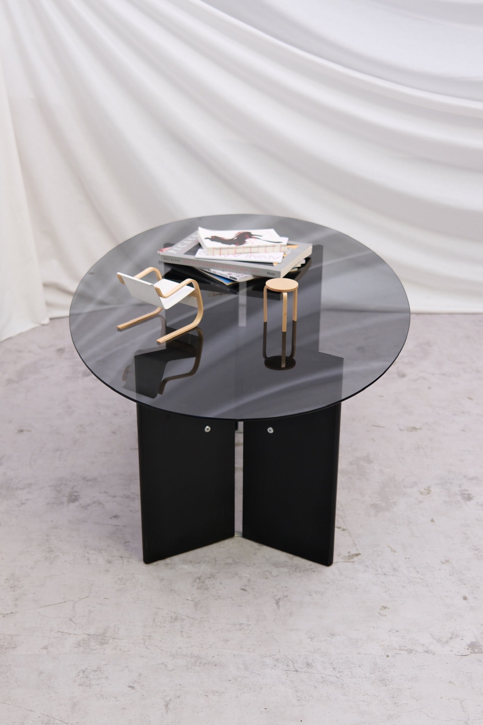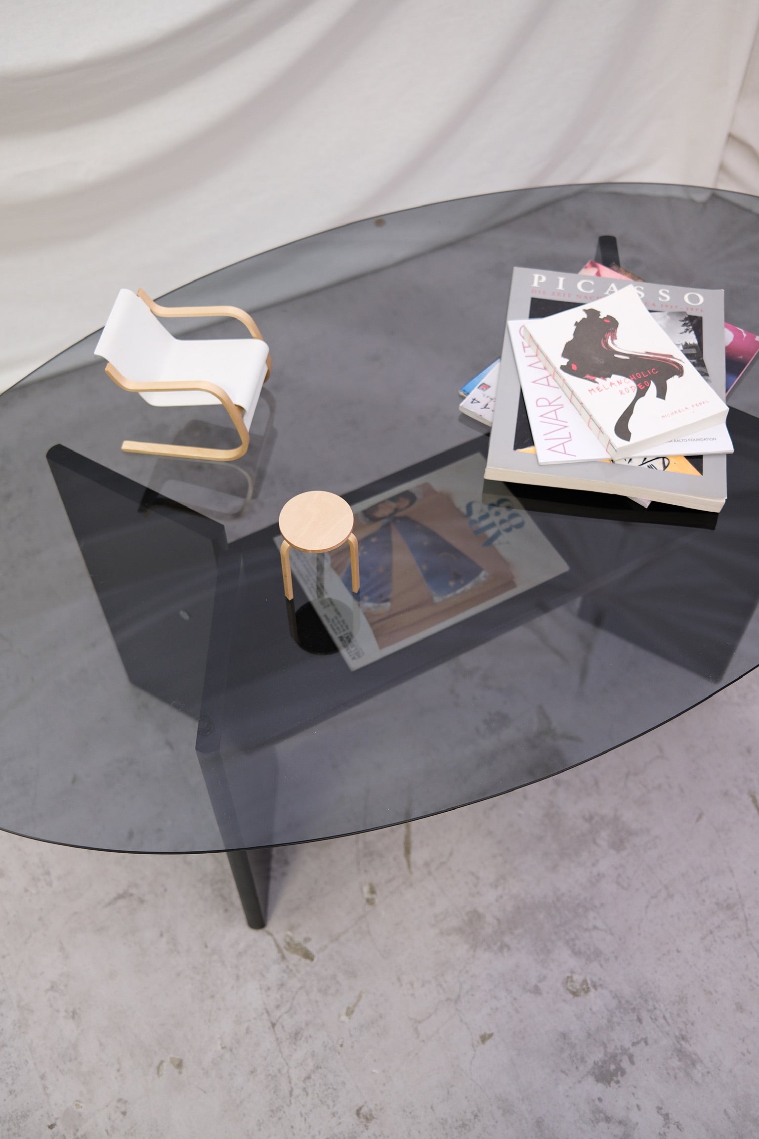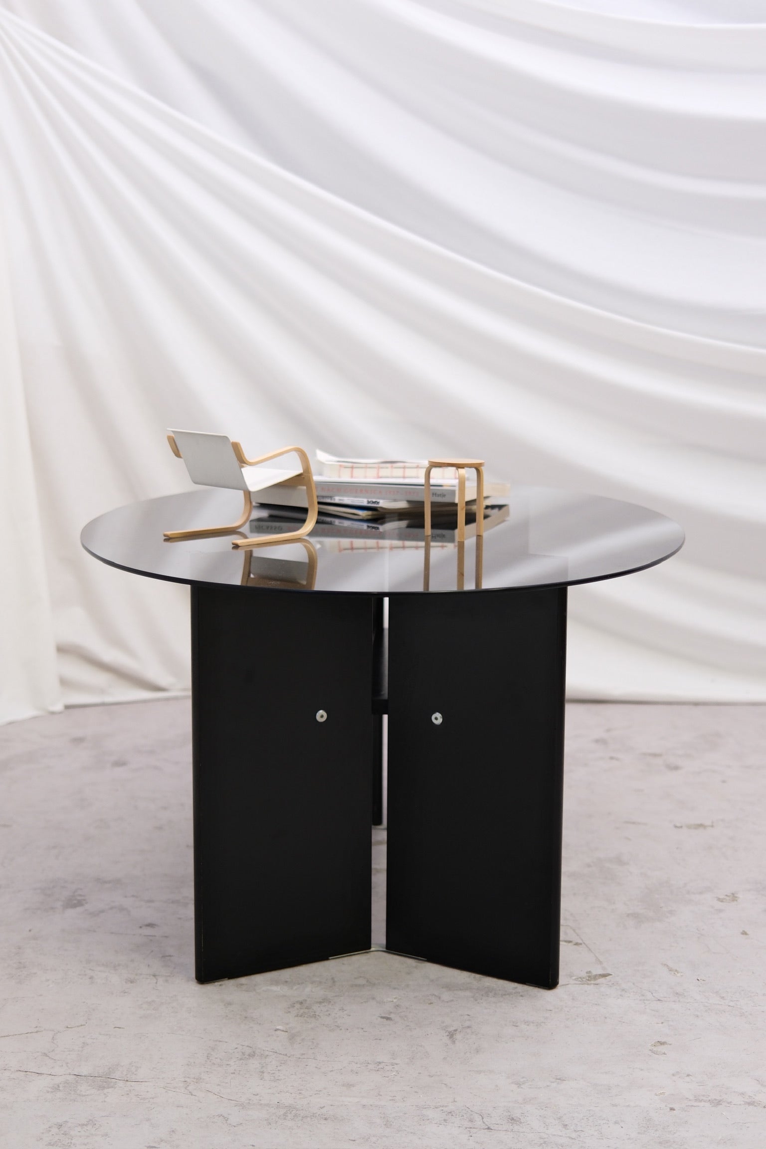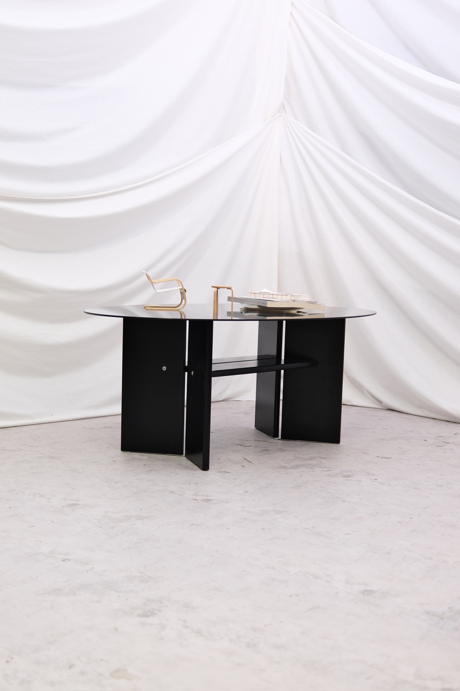 모던한 우아함과 시대를 초월한 매력이 완벽한 조화를 이루는 눈길을 사로잡는 빈티지 이탈리아 커피 테이블입니다. 타원형 스모크 유리 상판과 조각 같은 검은색 원목 받침대가 어우러져 대담하면서도 세련된 실루엣을 완성합니다. 깔끔하고 기하학적인 선과 세련된 소재가 어우러져 미니멀리스트 인테리어, 중세풍 분위기, 다양한 빈티지...