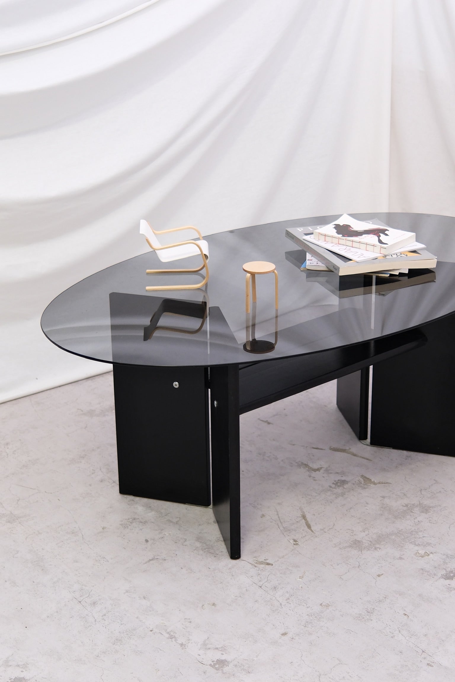 모던한 우아함과 시대를 초월한 매력이 완벽한 조화를 이루는 눈길을 사로잡는 빈티지 이탈리아 커피 테이블입니다. 타원형 스모크 유리 상판과 조각 같은 검은색 원목 받침대가 어우러져 대담하면서도 세련된 실루엣을 완성합니다.