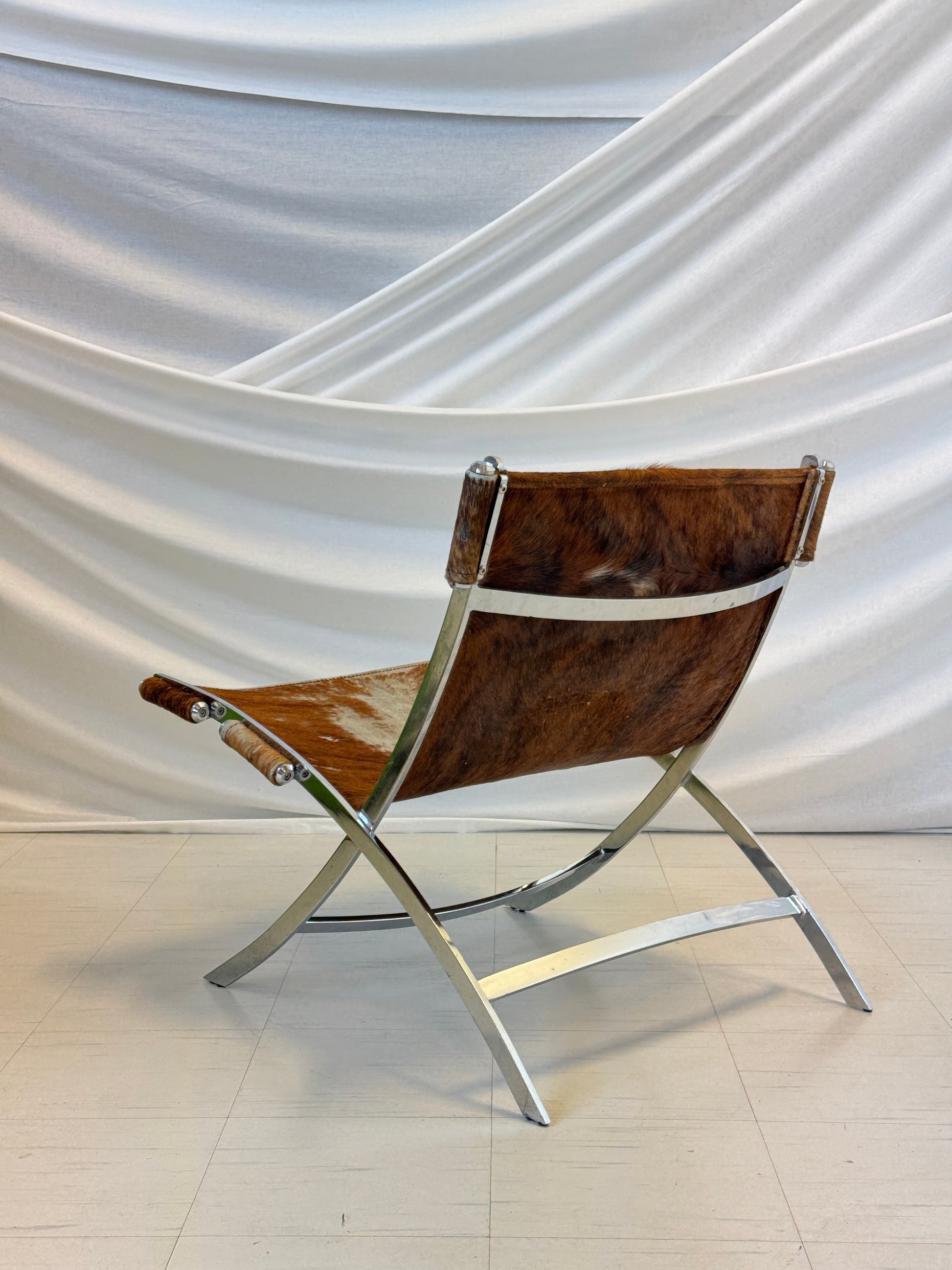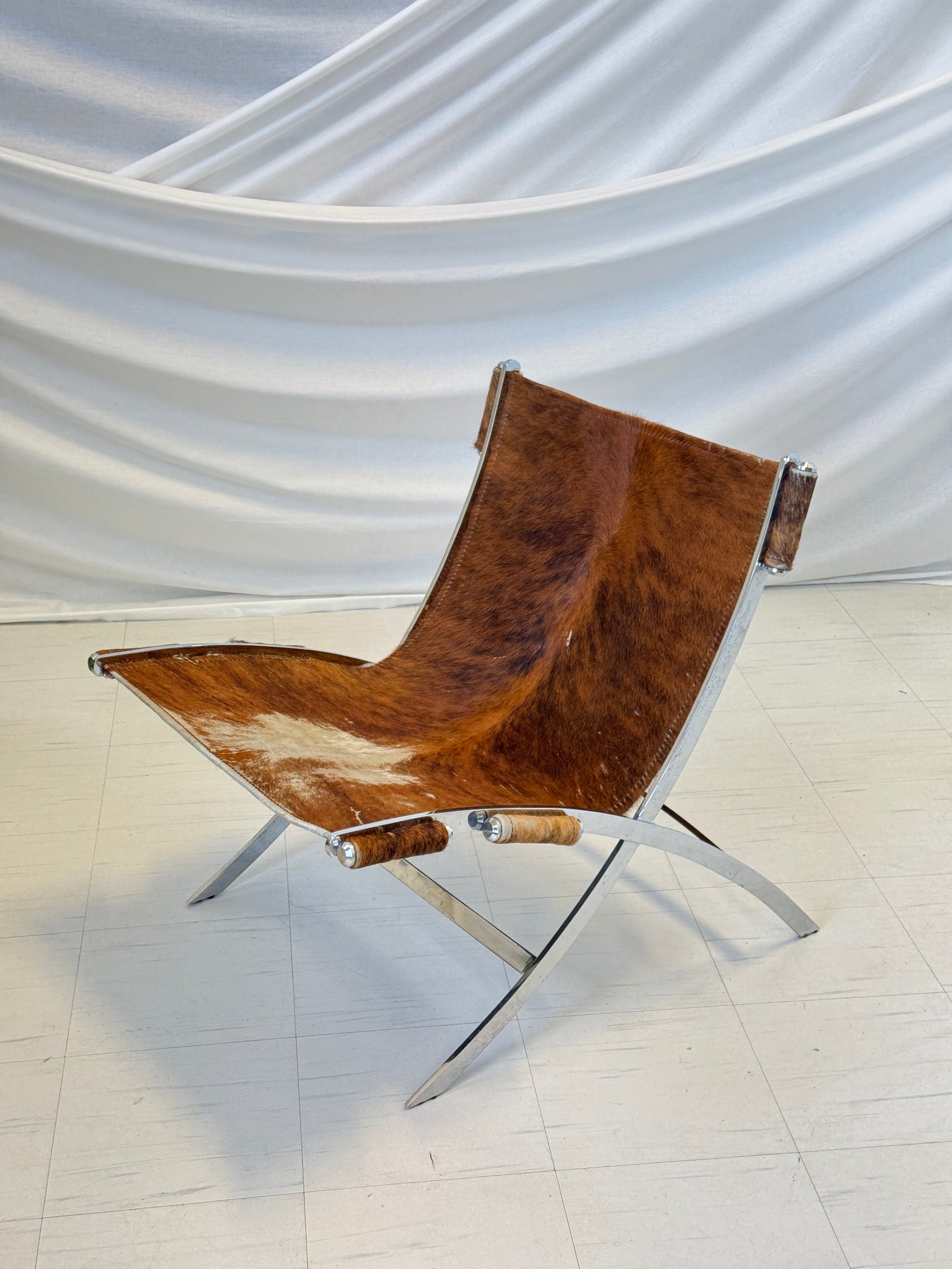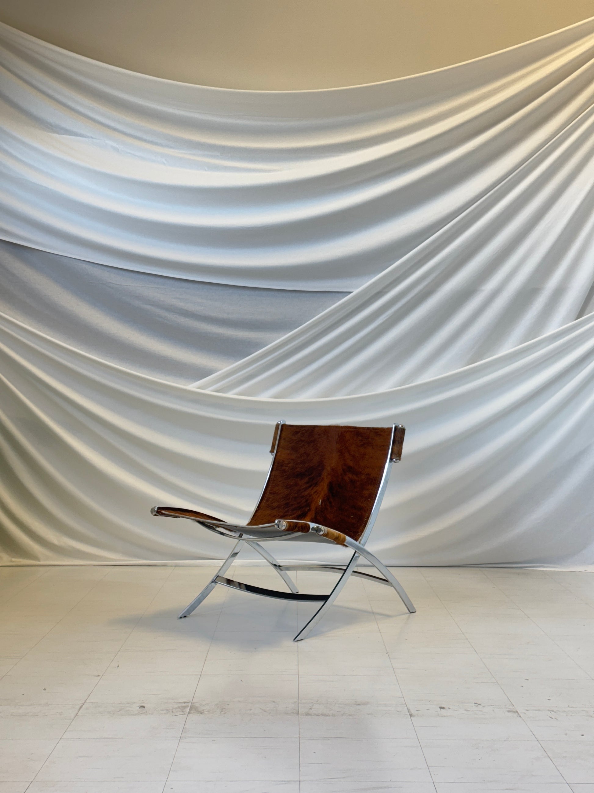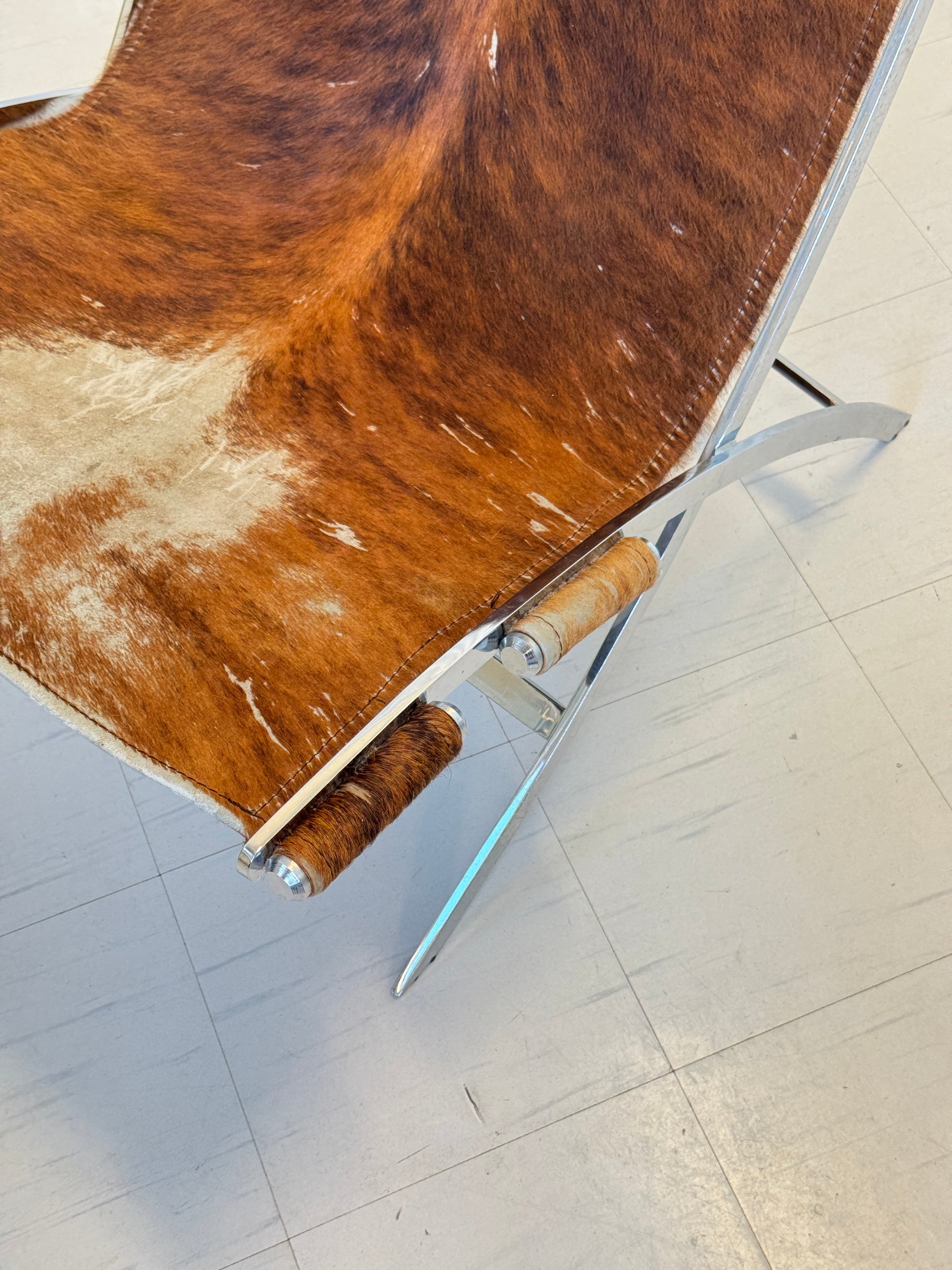 야생적인 형태, 최소한의 프레임. 이 조각적인 슬링 체어는 대담한 윤곽의 실루엣과 예상치 못한 소재의 조합, 즉 천연 소가죽과 광택 크롬의 만남을 선보입니다. 넓게 펼쳐진 X자 모양의 받침대는 슬링 가죽 시트를 지지하여, 원초적이면서도 정교한 느낌을 주는 낮고 편안한 자세를 만들어냅니다. 가죽에...
