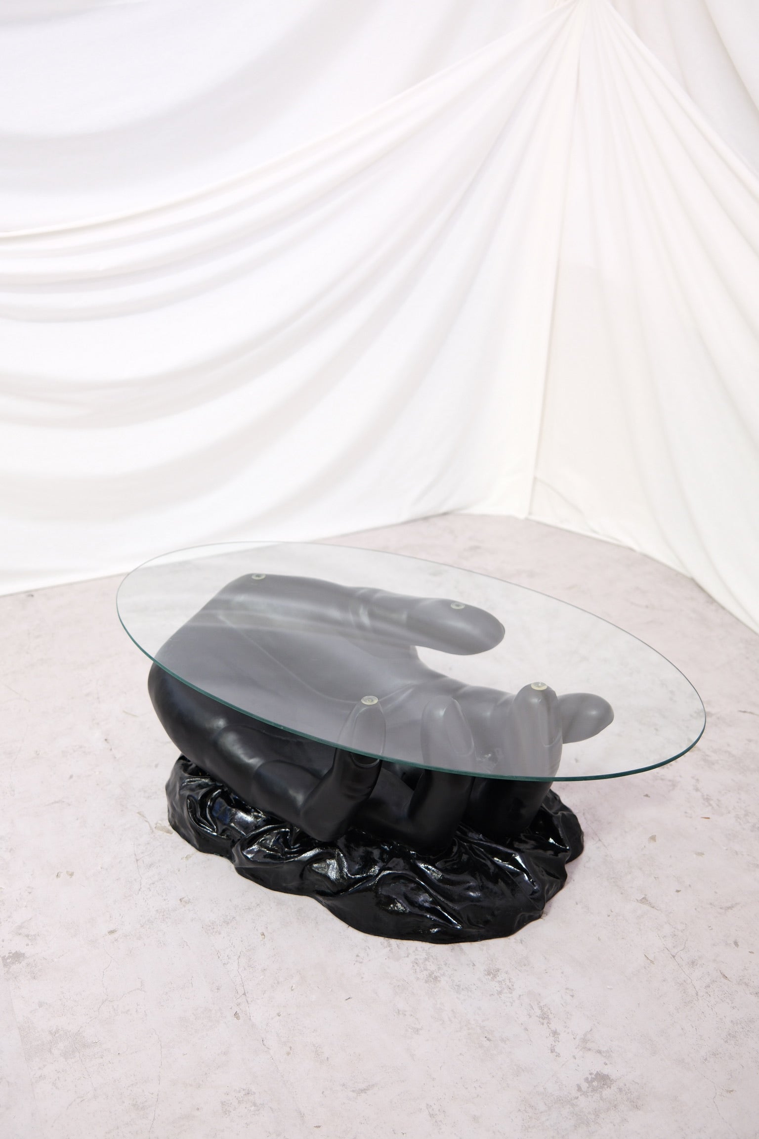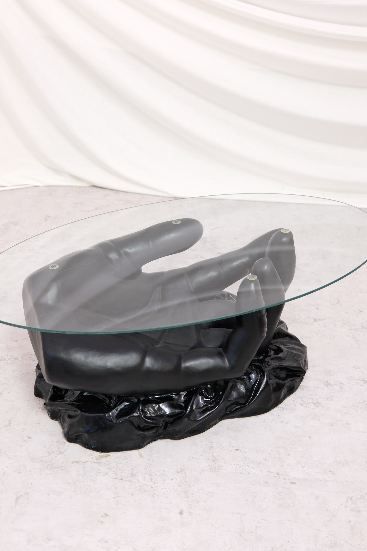 The solid black hand-shaped base supports an oval clear glass top, creating a powerful contrast between heavy sculptural form and light transparent surface. This table works beautifully in modern living rooms, creative studios, gallery-style interiors, and spaces where furniture is meant to be noticed and appreciated as art.