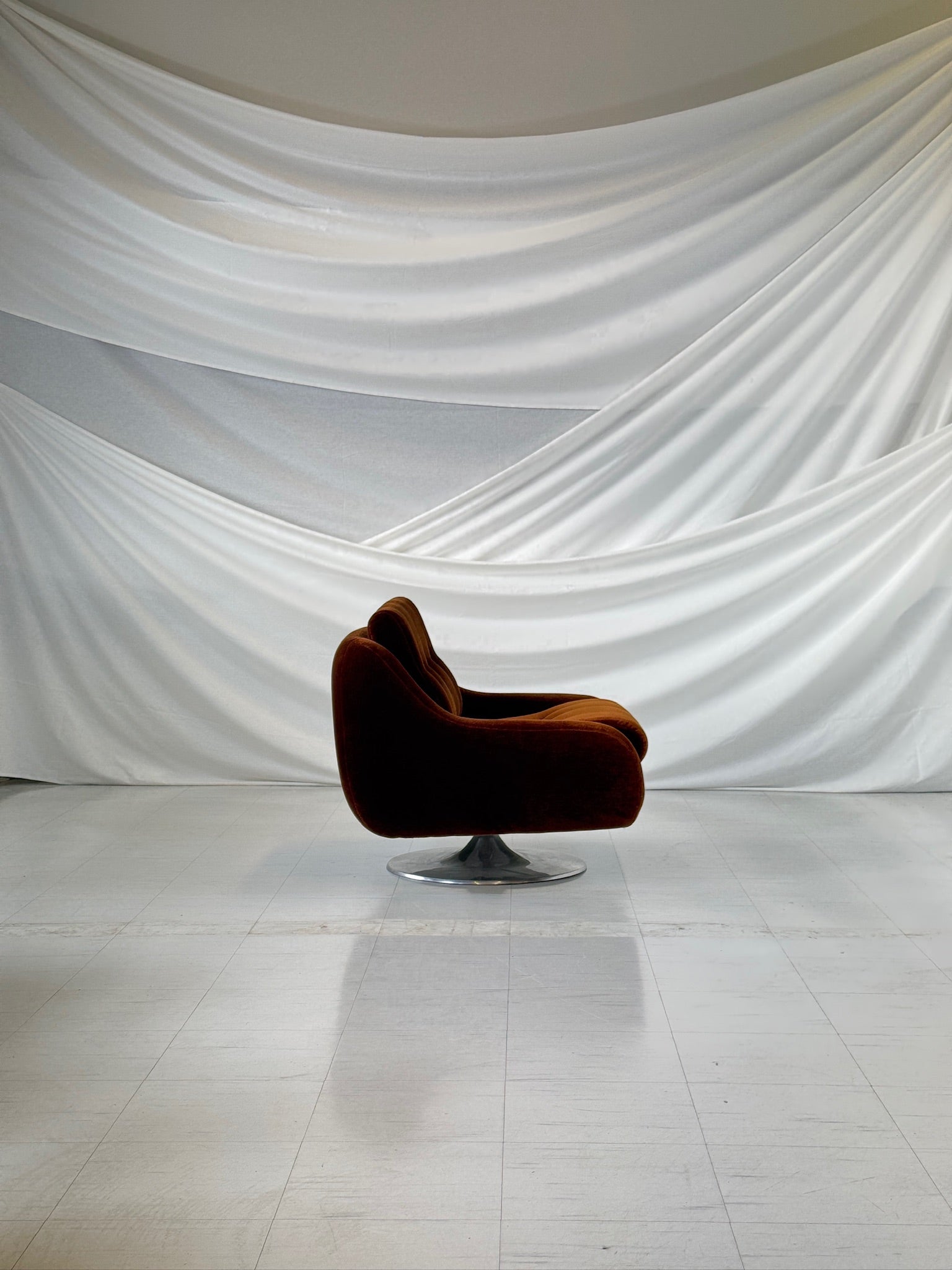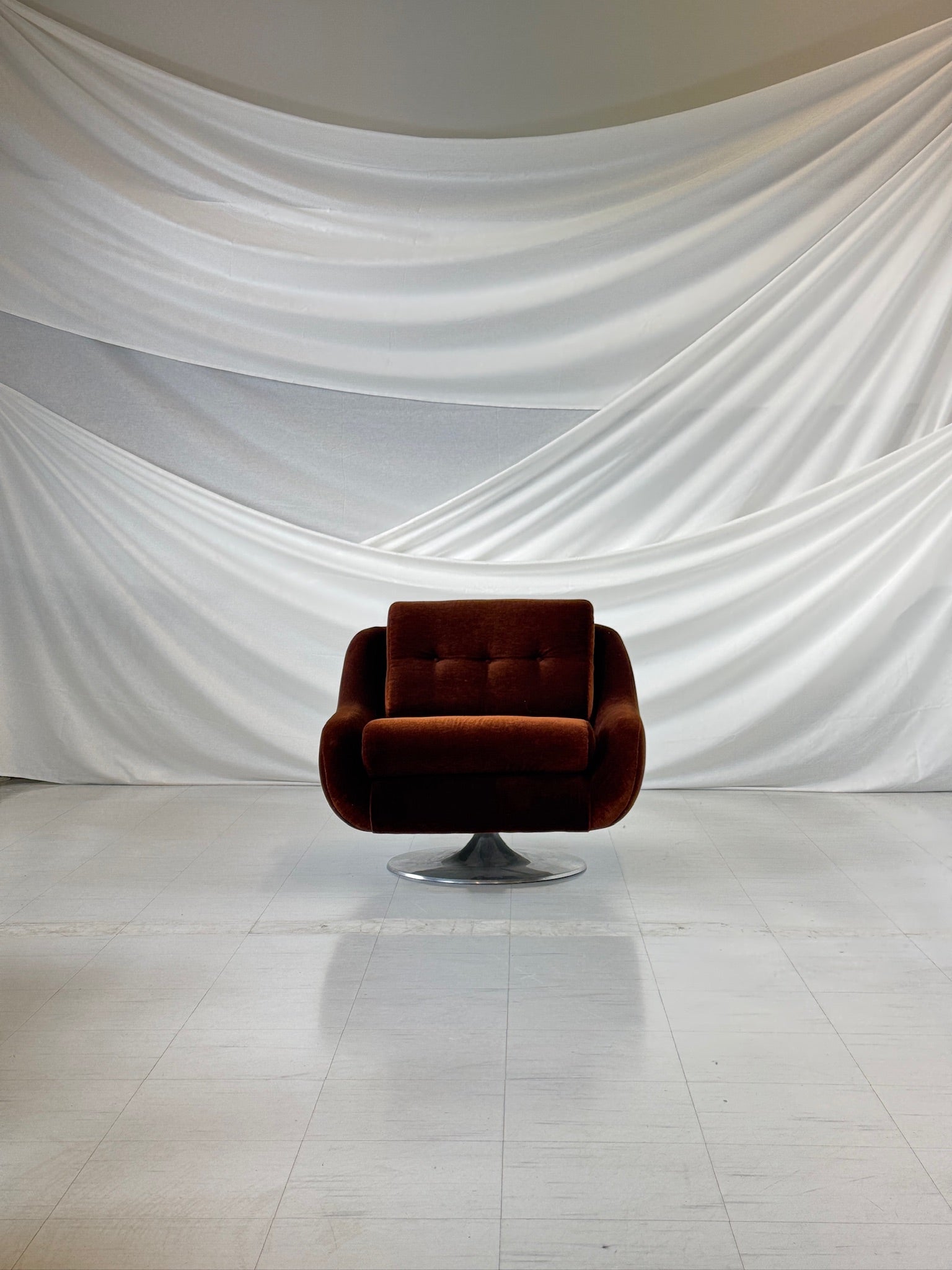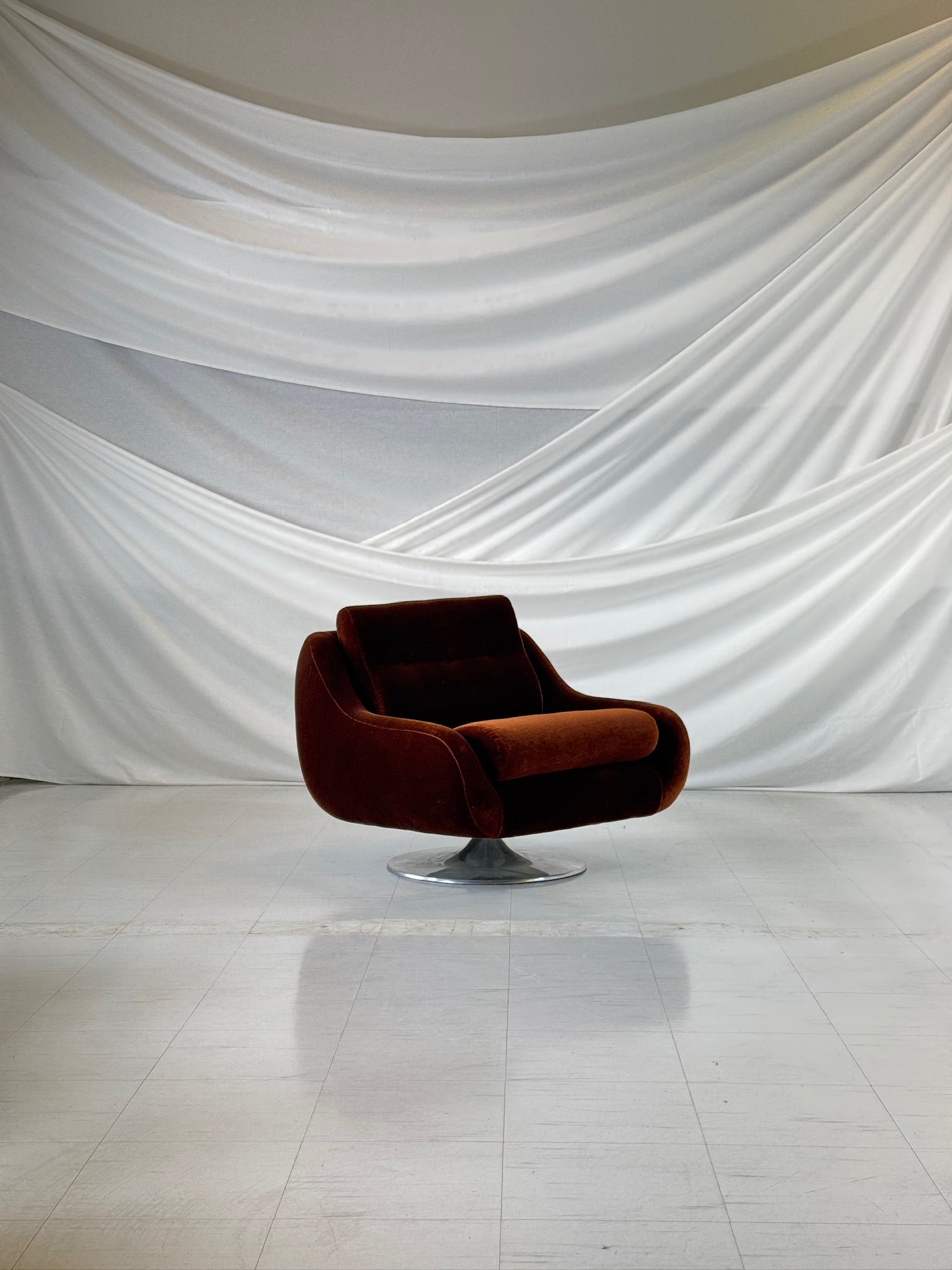 풍부하고 짙은 갈색 벨벳으로 마감된 조각품 같은 미드센추리 회전 안락의자입니다. 유기적이고 흐르는 듯한 형태는 광택이 나는 크롬 튤립형 받침대를 통해 360도 회전이 가능합니다. 넓은 좌석과 둥근 윤곽은 넉넉한 착석감을 제공하며, 부드러운 벨벳은 시각적, 촉각적 매력을 더합니다.