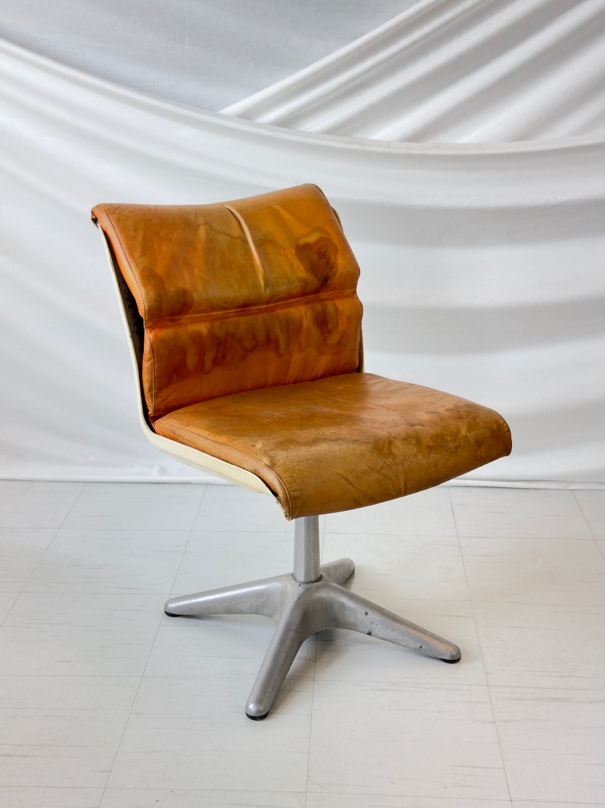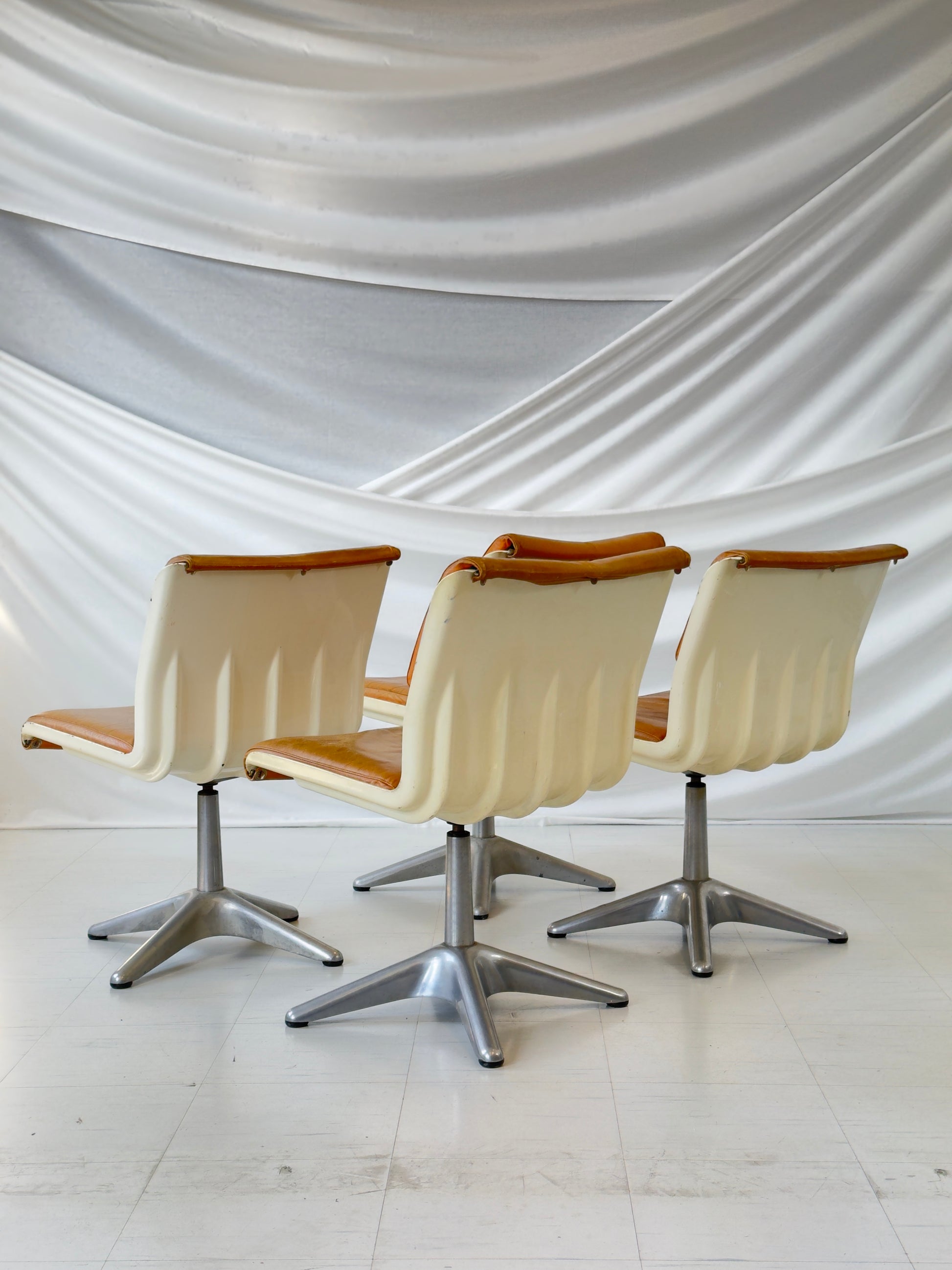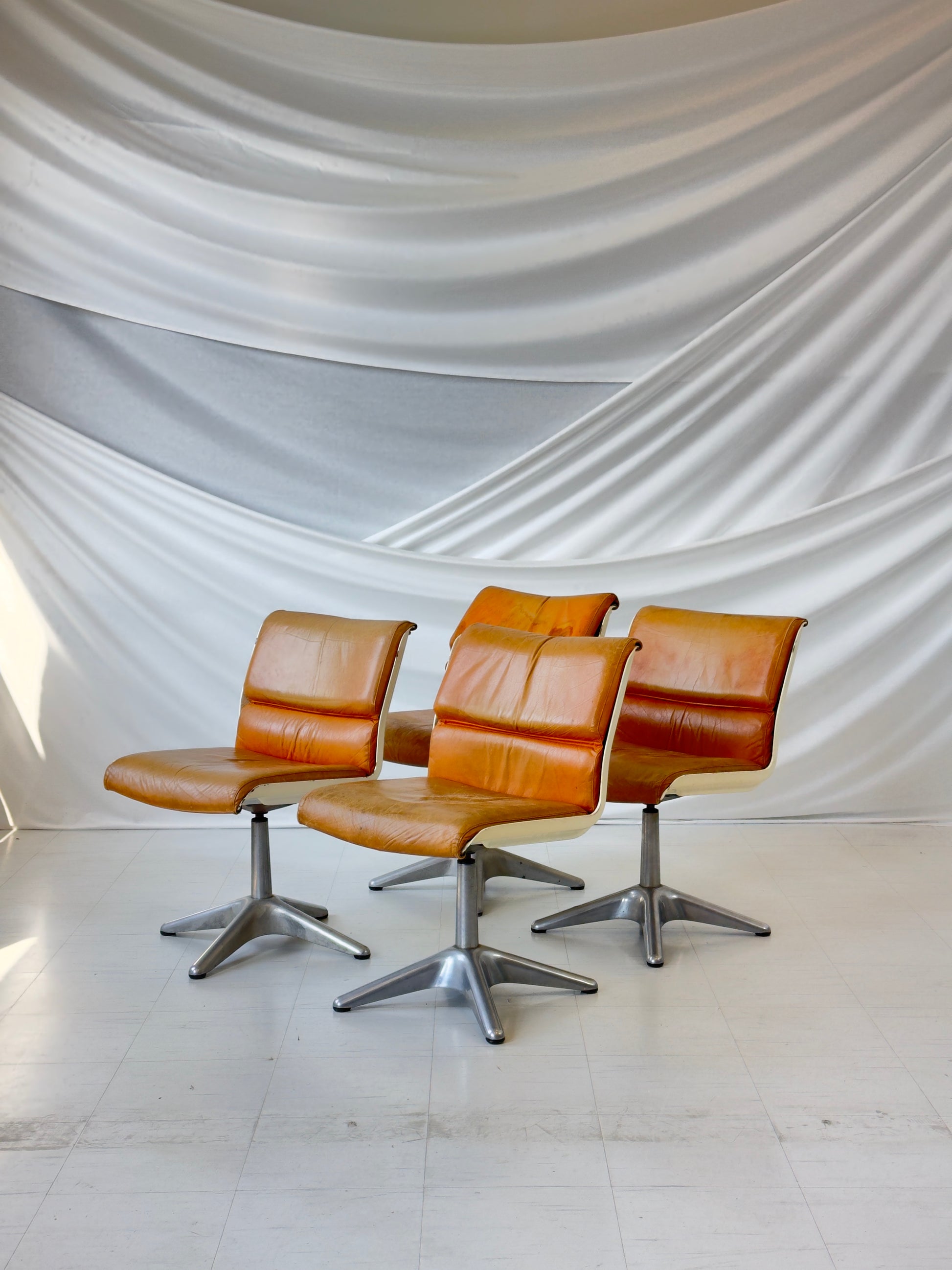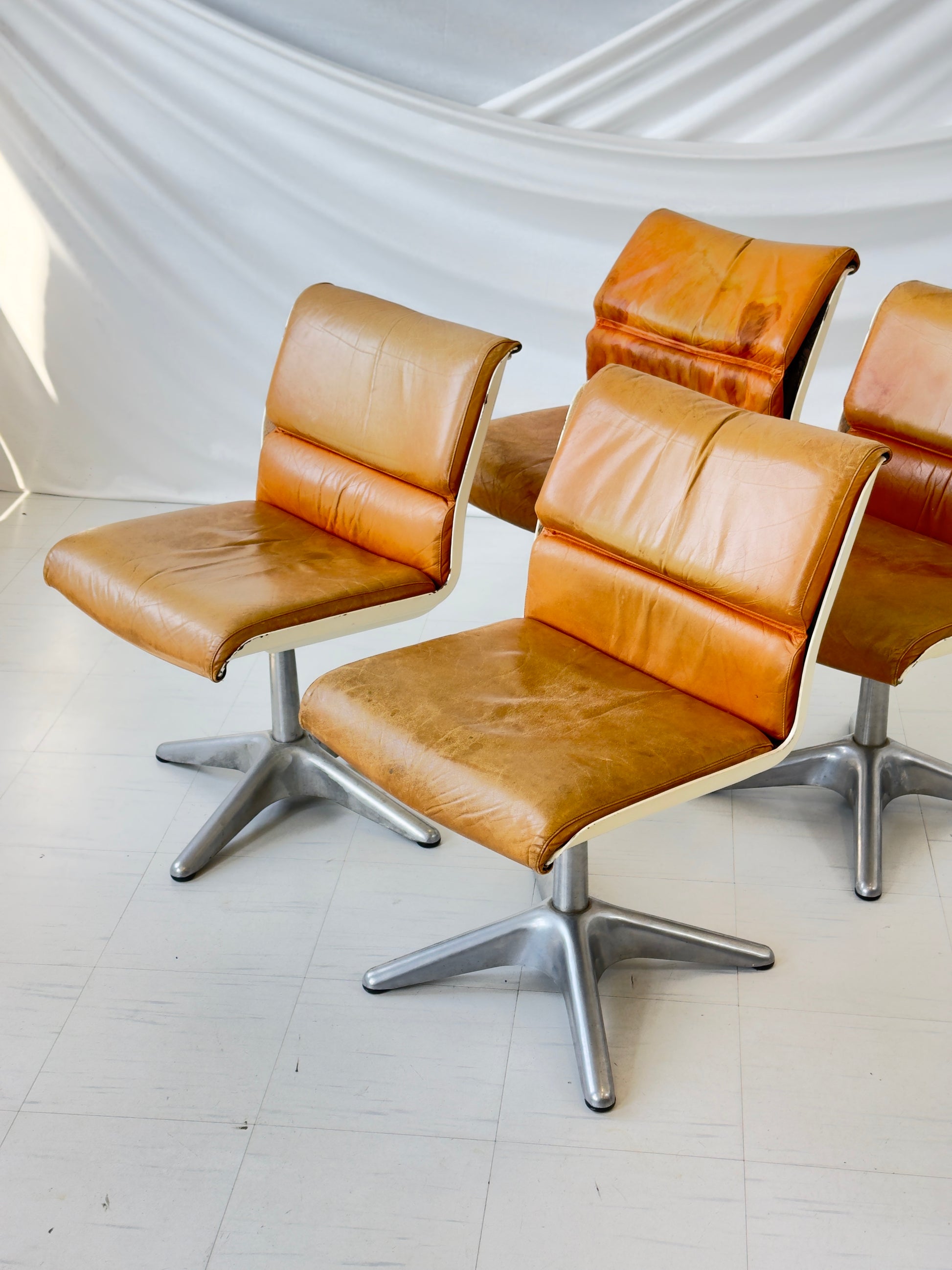 이 의자들은 좋은 빈티지 상태입니다. 가죽에는 세월의 흔적이 남아 있으며, 특히 4번째 의자(사진 참조)에는 세월의 흔적이 보입니다. 알루미늄 받침대는 약간 긁힌 자국이 있지만 깨끗합니다. 모든 의자는 부드럽게 회전합니다.