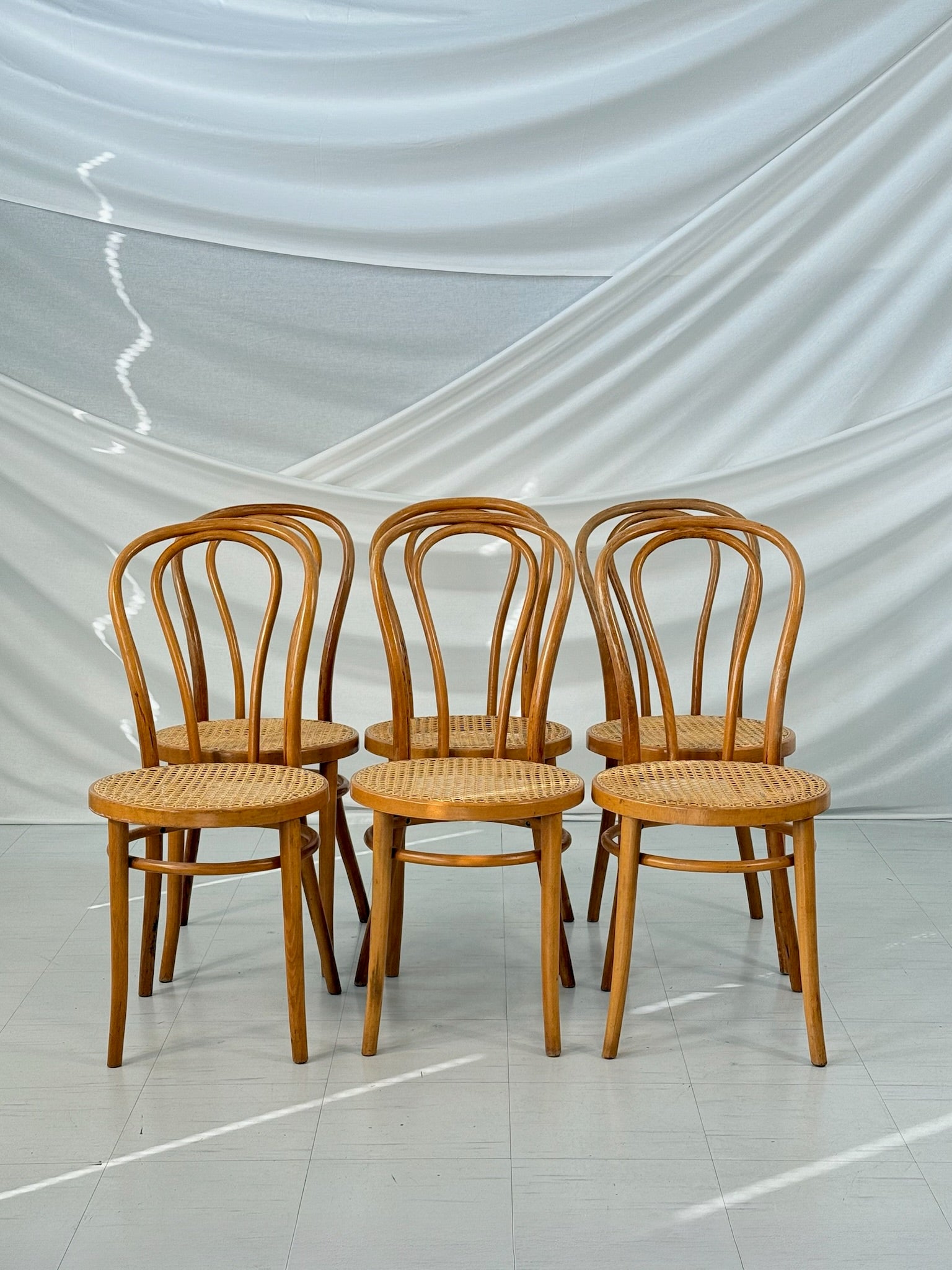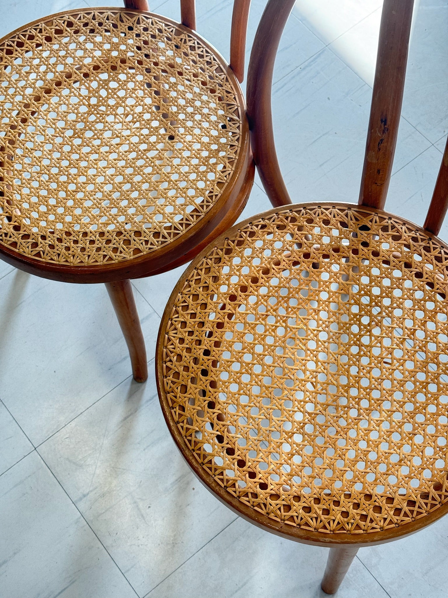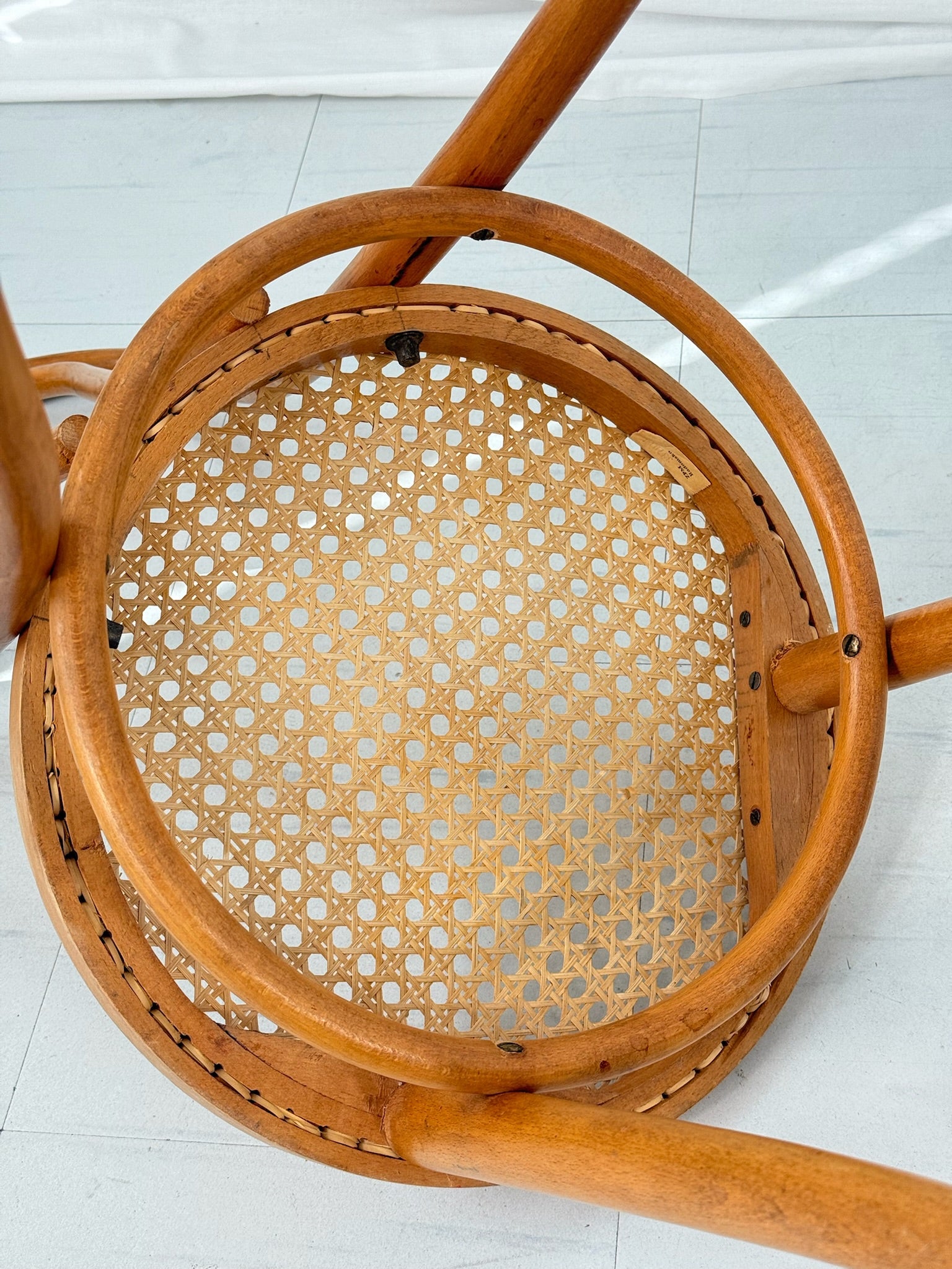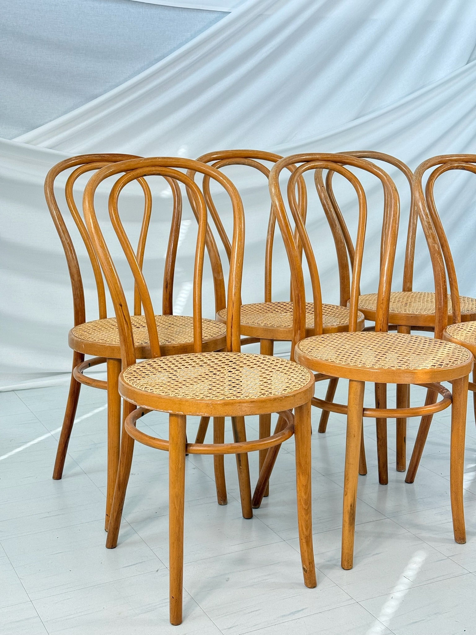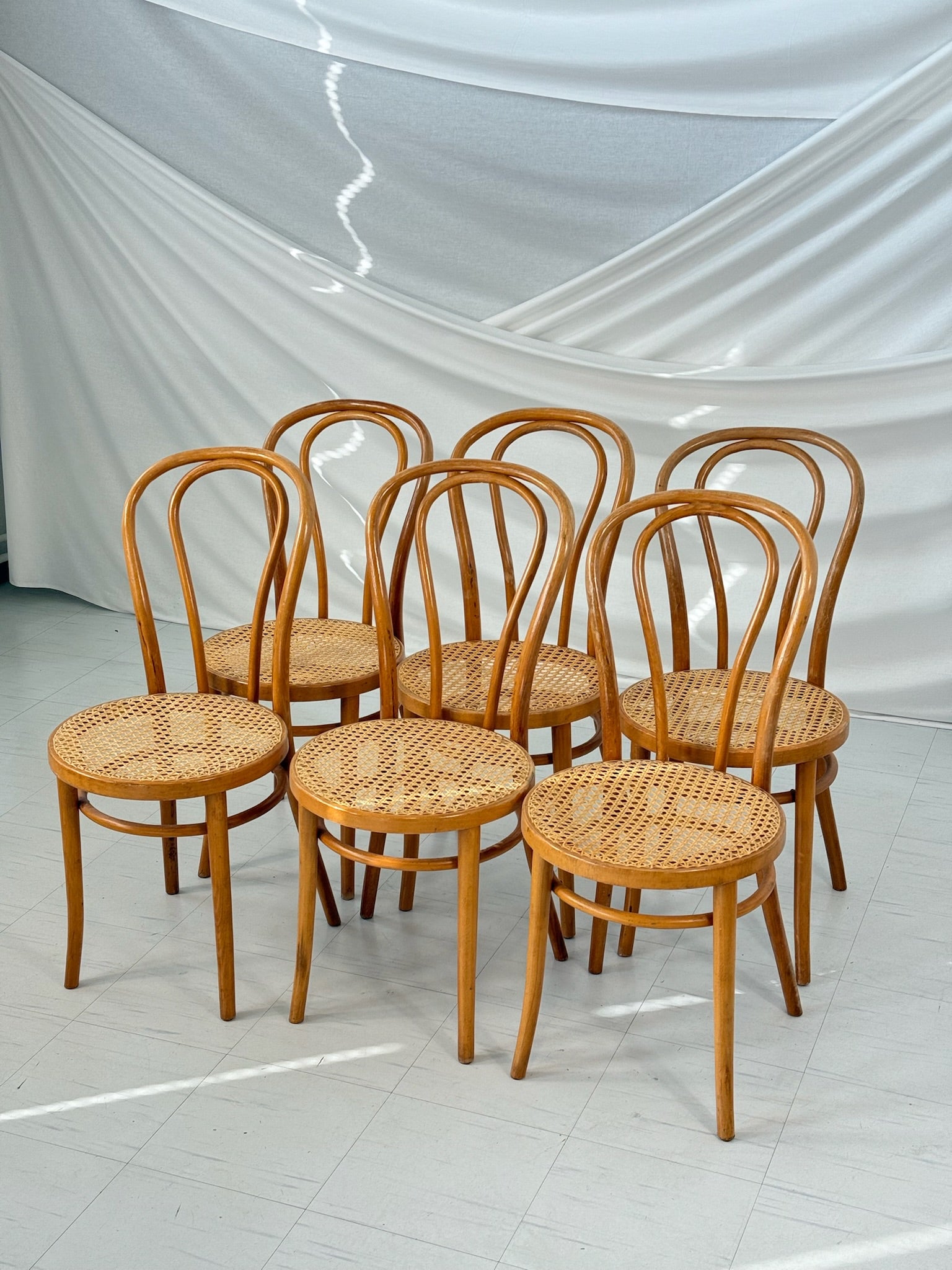 ZPM 라돔스코(ZPM Radomsko)에서 제작한 클래식한 벤트우드 의자 6개 세트입니다. 토넷(Thonet)의 상징적인 No.14 전통을 따라 우아한 곡선과 가벼운 구조, 그리고 손으로 엮은 등나무 시트가 조화를 이룹니다. 다이닝룸과 카페 공간 모두에 이상적입니다.