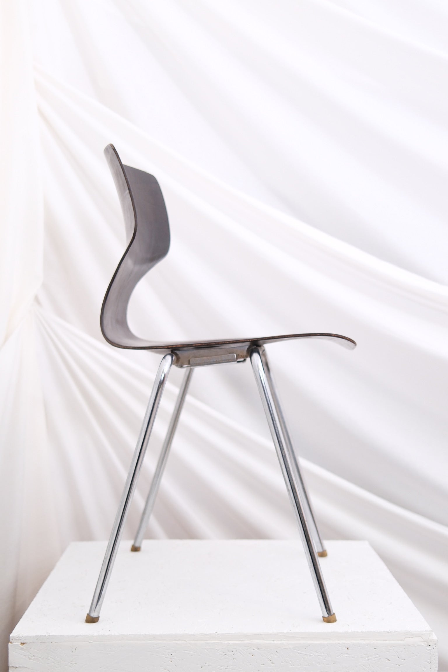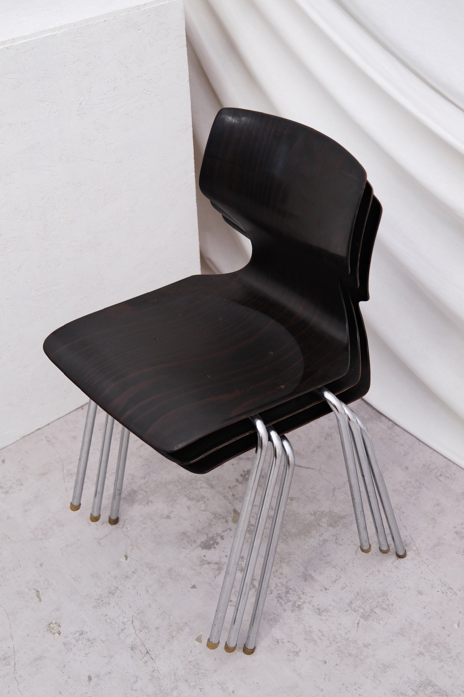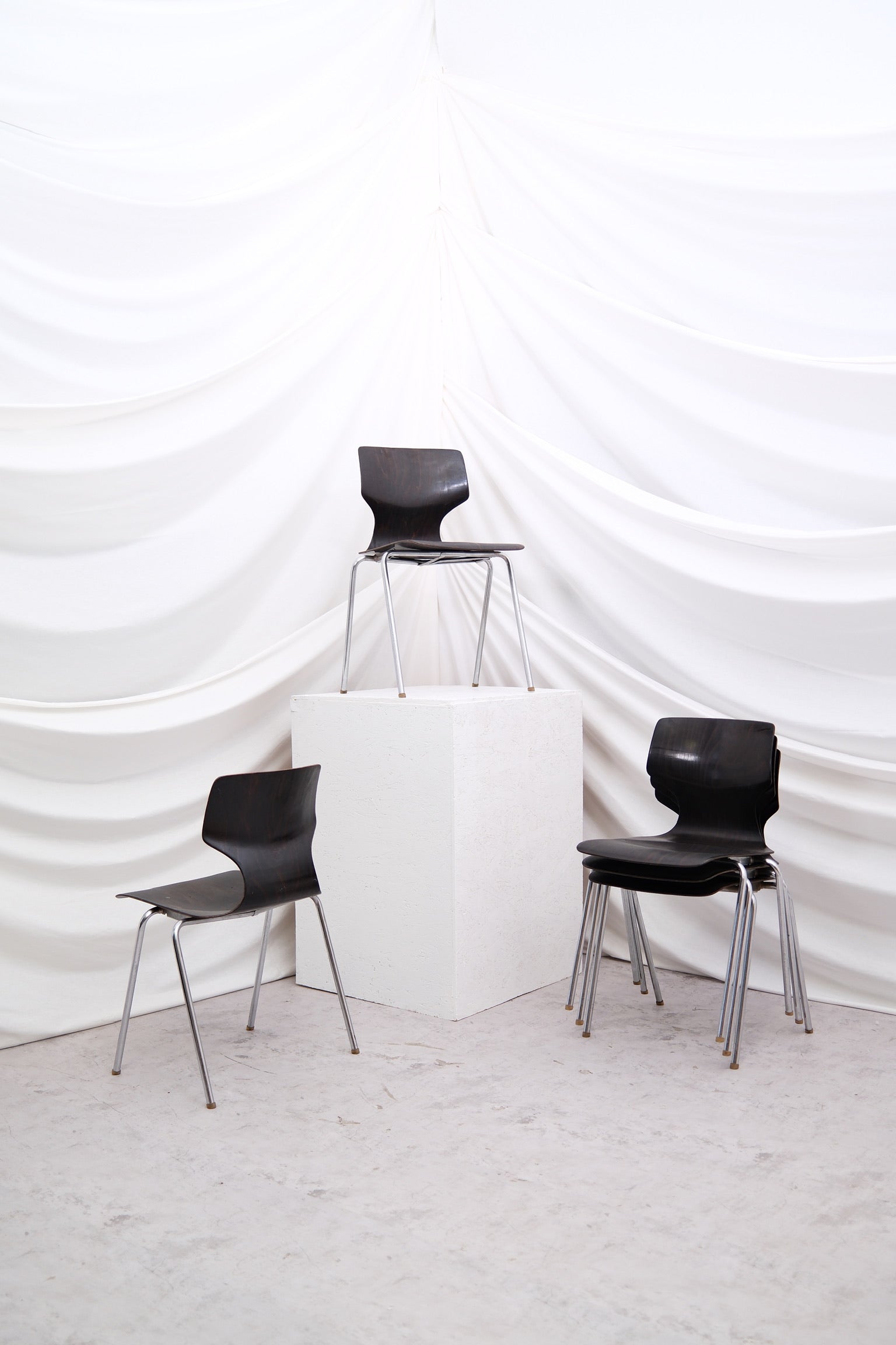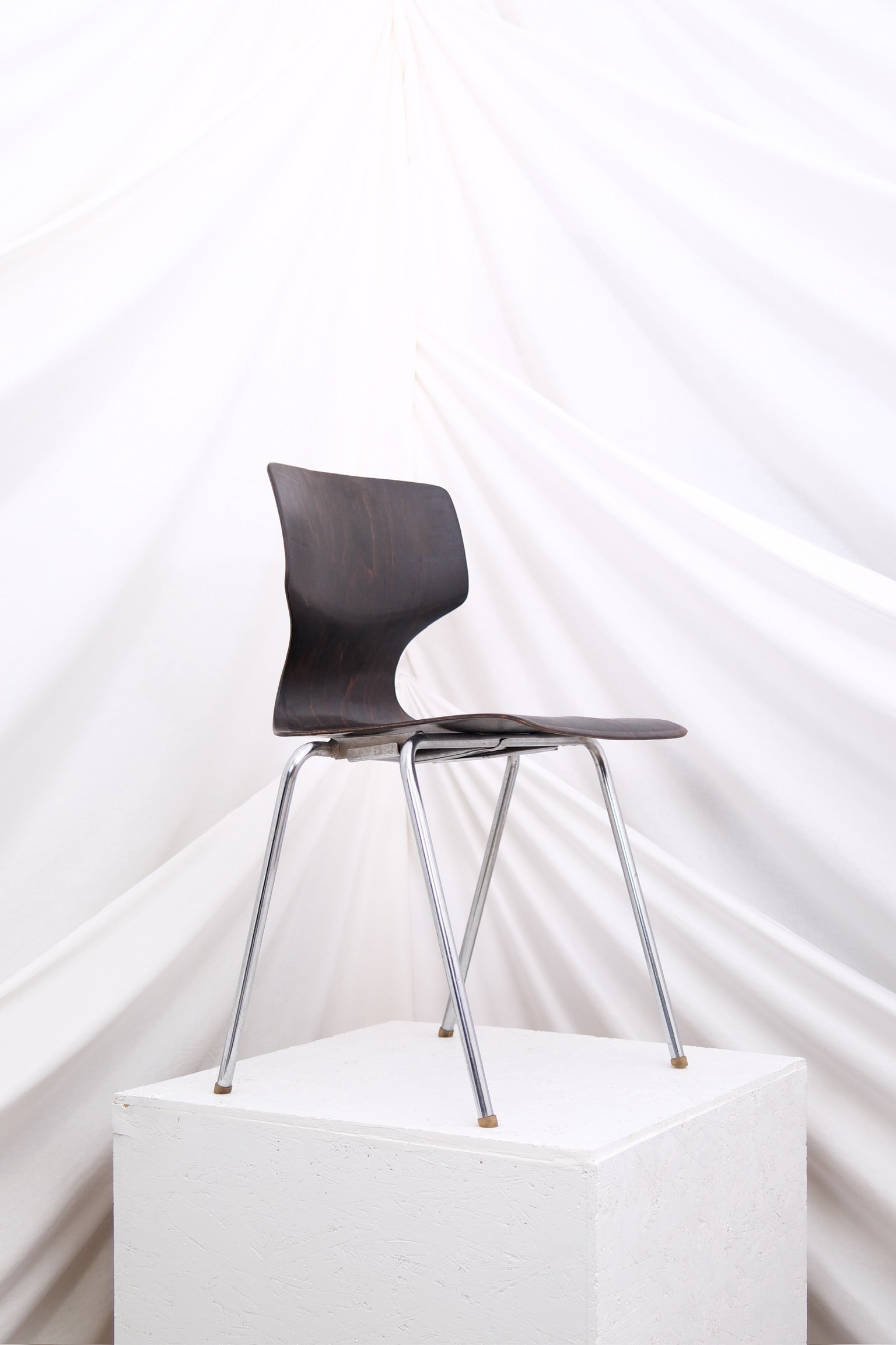 Classic German design from the 1970s. These Flötotto chairs are made from molded Pagholz plywood with a rich dark tone and chrome tubular legs. They’re sturdy, comfortable and easy to stack, which made them popular in schools, cafés and meeting spaces across Europe. Today they bring a clean, sculptural look to dining rooms, studios or workspaces.
