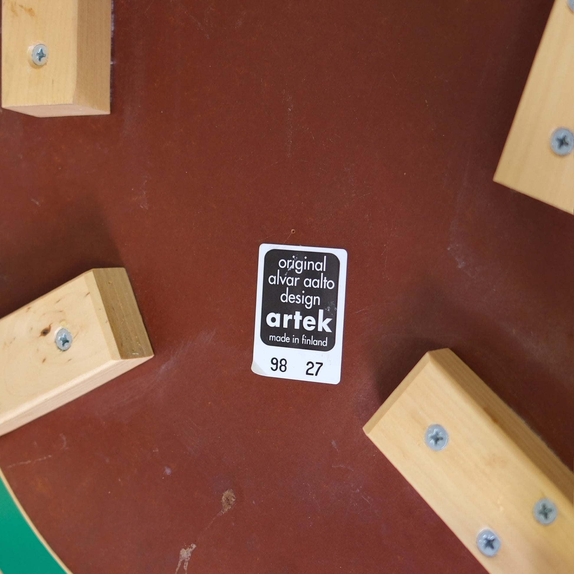 This set was produced by Artek in 1998. The chairs have natural birch frames with green linoleum seats, giving the classic model a calm and slightly more distinctive look. Suitable for dining, office or project use.