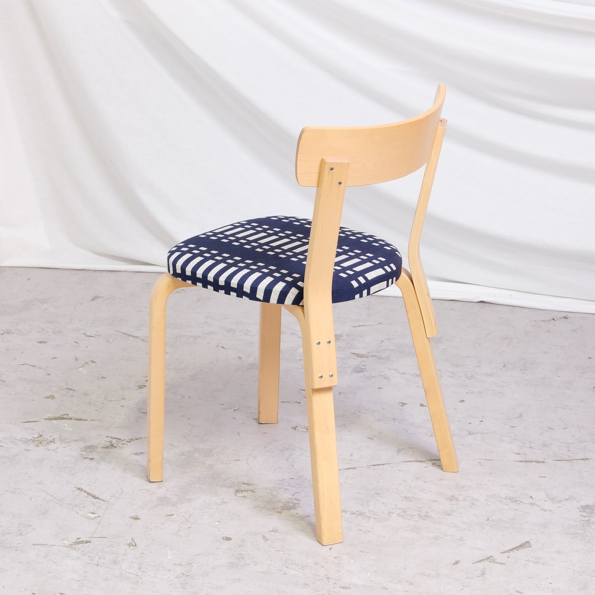 These chairs have birch frames and newly upholstered seats in dark blue and white Johanna Gullichsen fabric. The fresh upholstery gives the chairs a clean updated look while still fitting well with the classic Aalto design. They work well around a dining table, in a kitchen, or as extra seating.