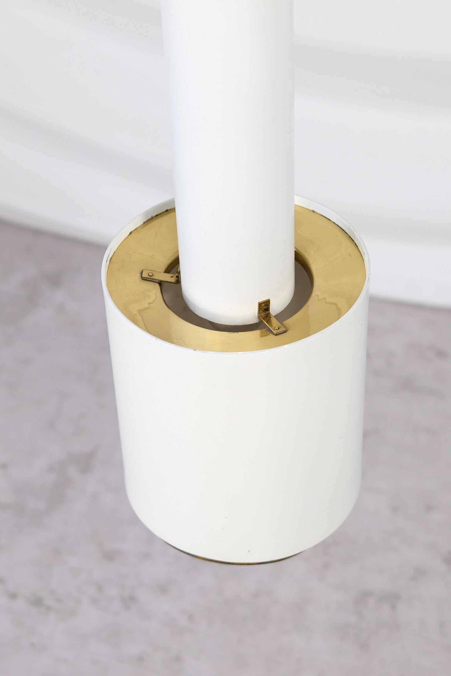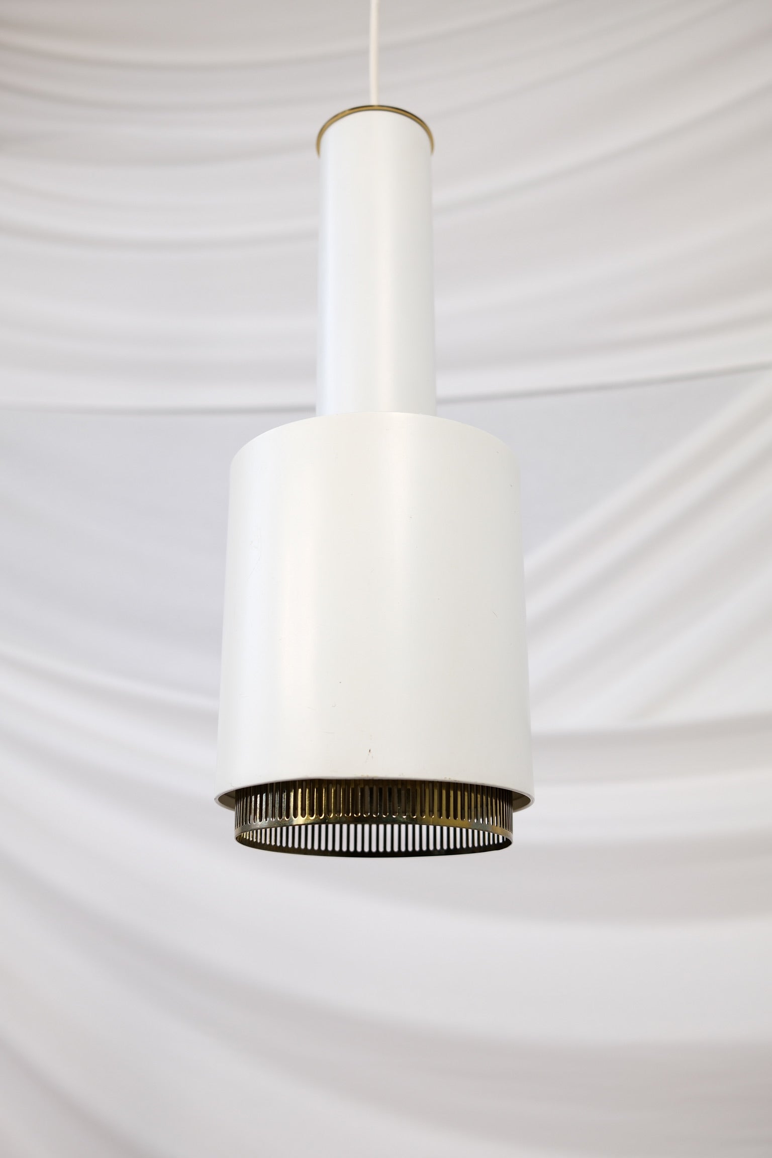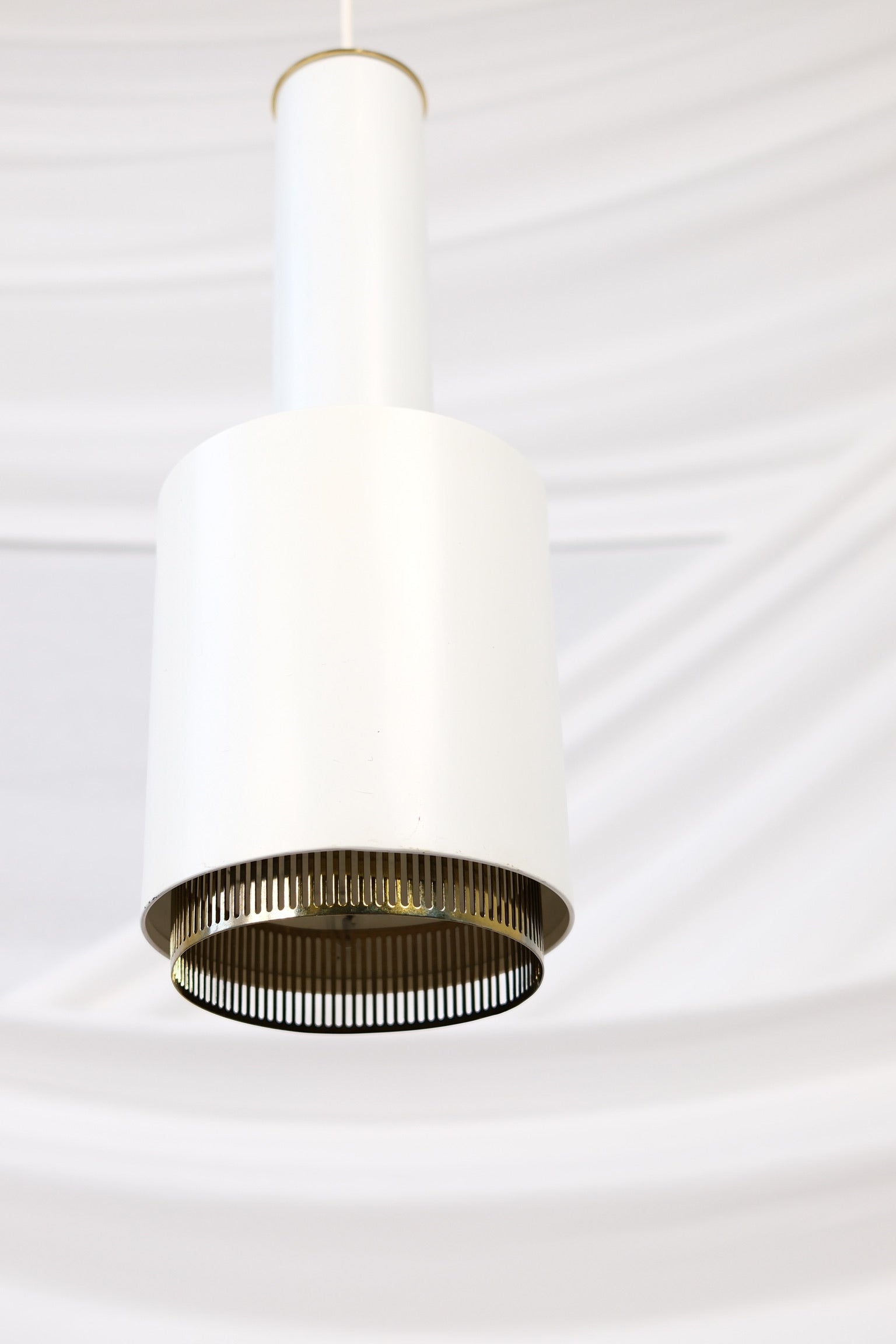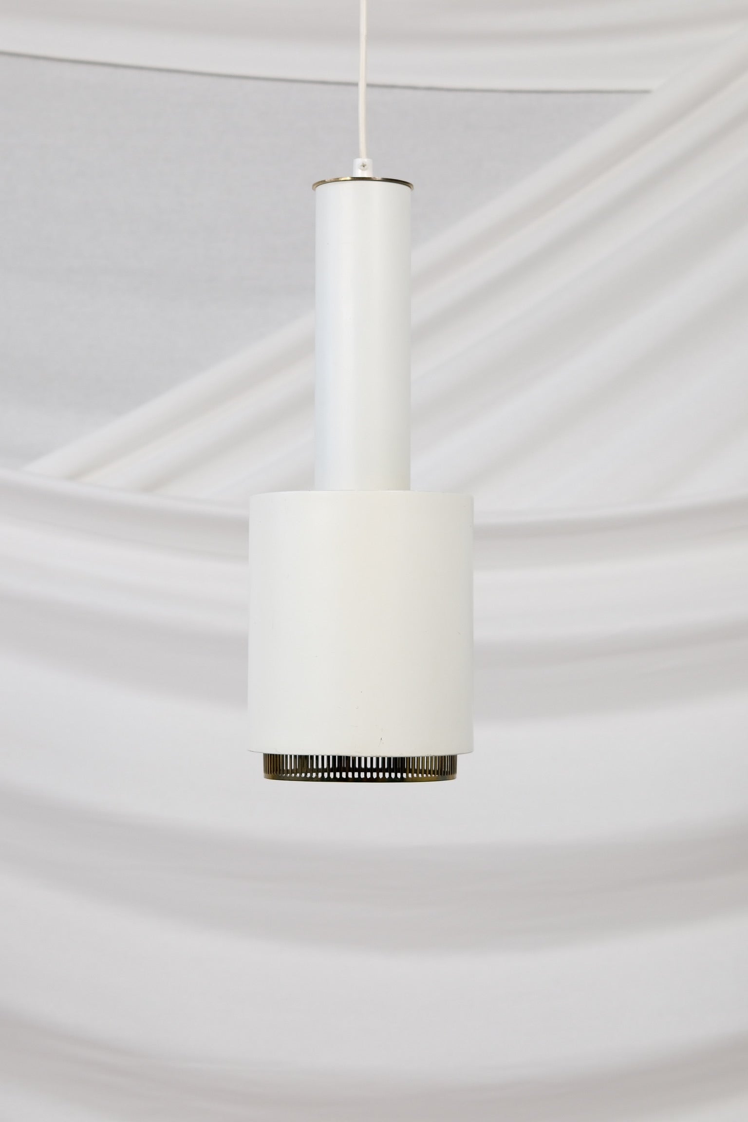 Crafted in white-painted metal with elegant brass detailing, the pendant’s bold cylindrical form embodies both functional clarity and refined design. The perforated brass rim diffuses light with a soft, atmospheric glow, highlighting Aalto’s genius for combining technical precision with architectural beauty.
