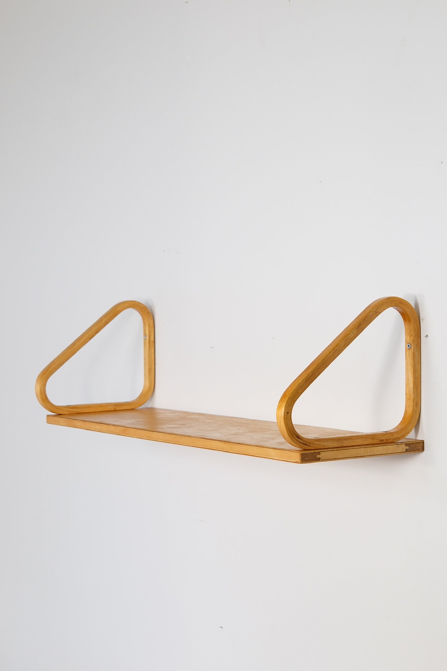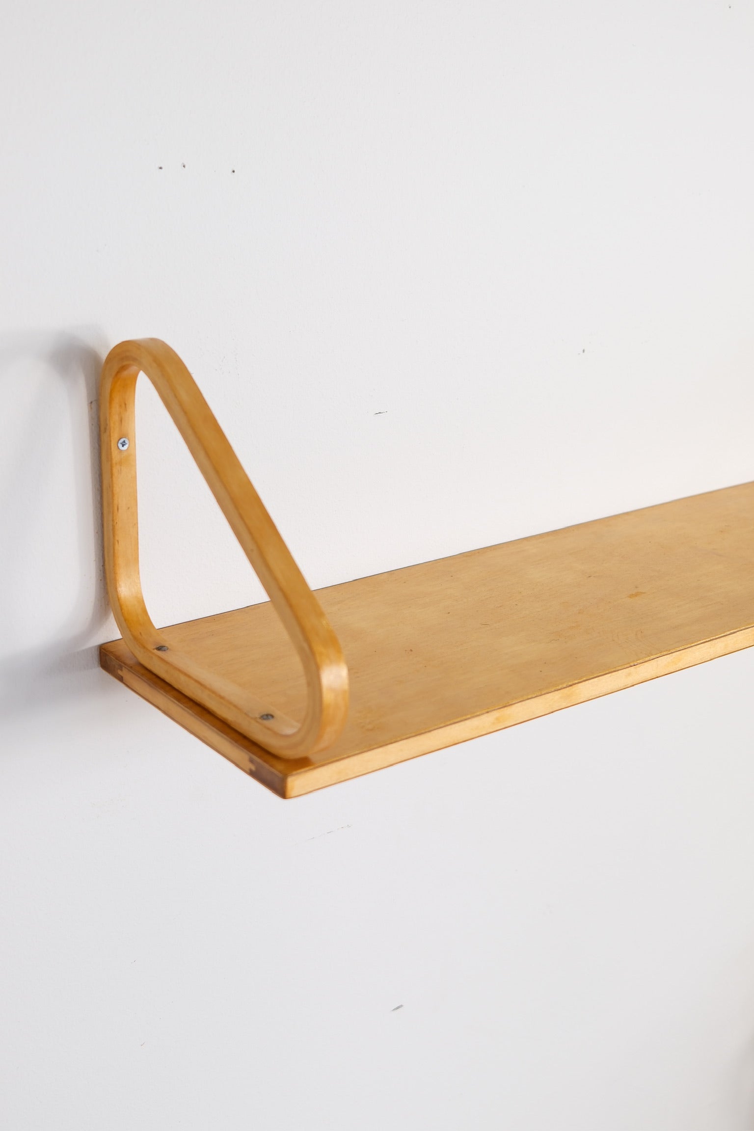 Original Alvar Aalto 112B wall shelf, designed for Artek in the 1930s and produced in the 1950s. This version features Aalto’s signature bent birch brackets and birch veneer shelve with beautiful warm patina. Notable construction details include finger-jointed shelve and original flat-head screws, highlighting Artek’s refined mid-century craftsmanship.