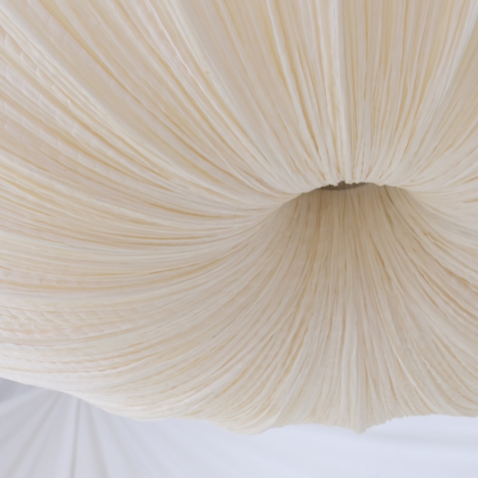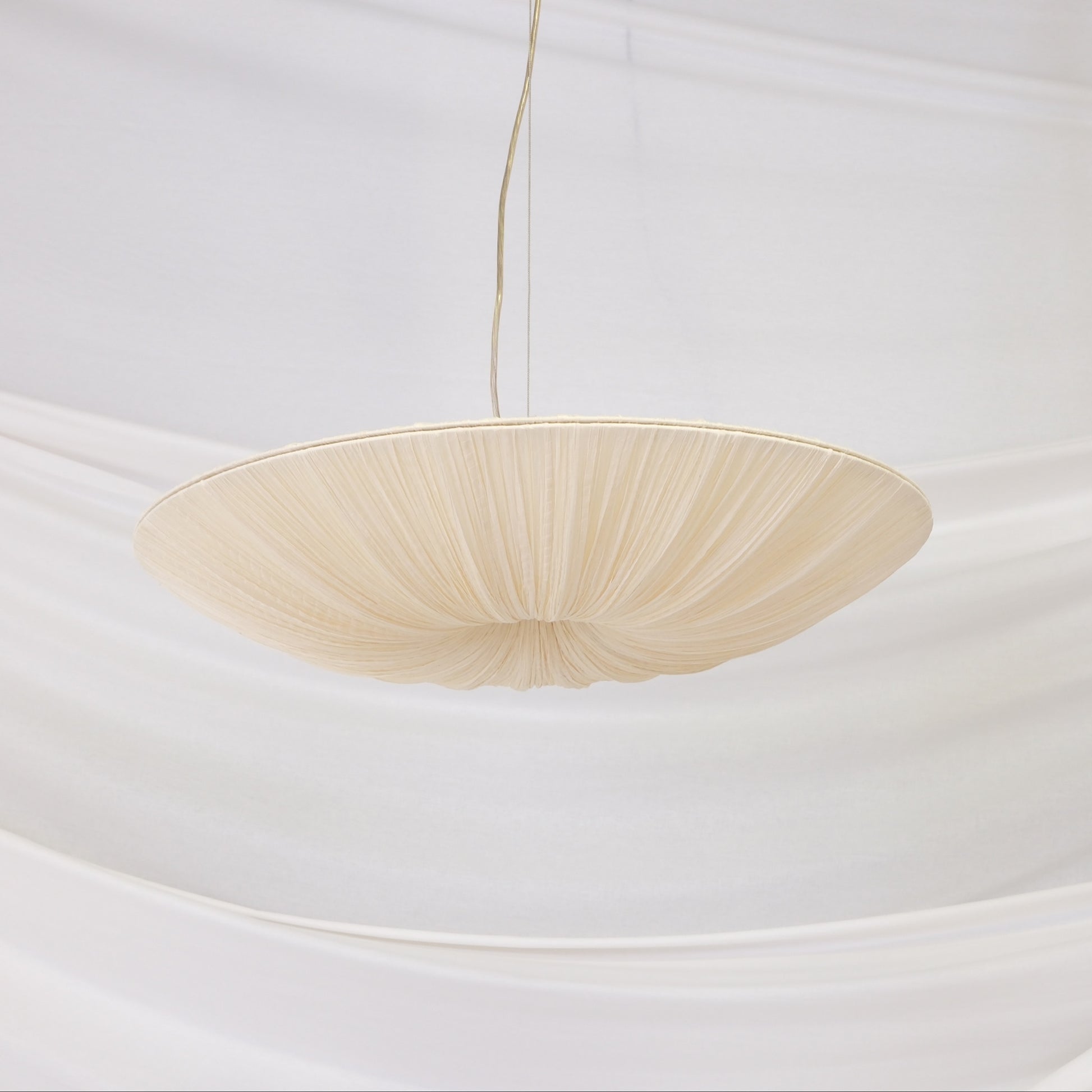 Aqua Creations is known for combining traditional handcraft with contemporary forms, and this piece sits right in that space. The flat disc shape feels architectural and calm, while the silk adds a subtle texture that changes depending on the light and viewing angle. It works as a central light source but also as a visual anchor in the room.