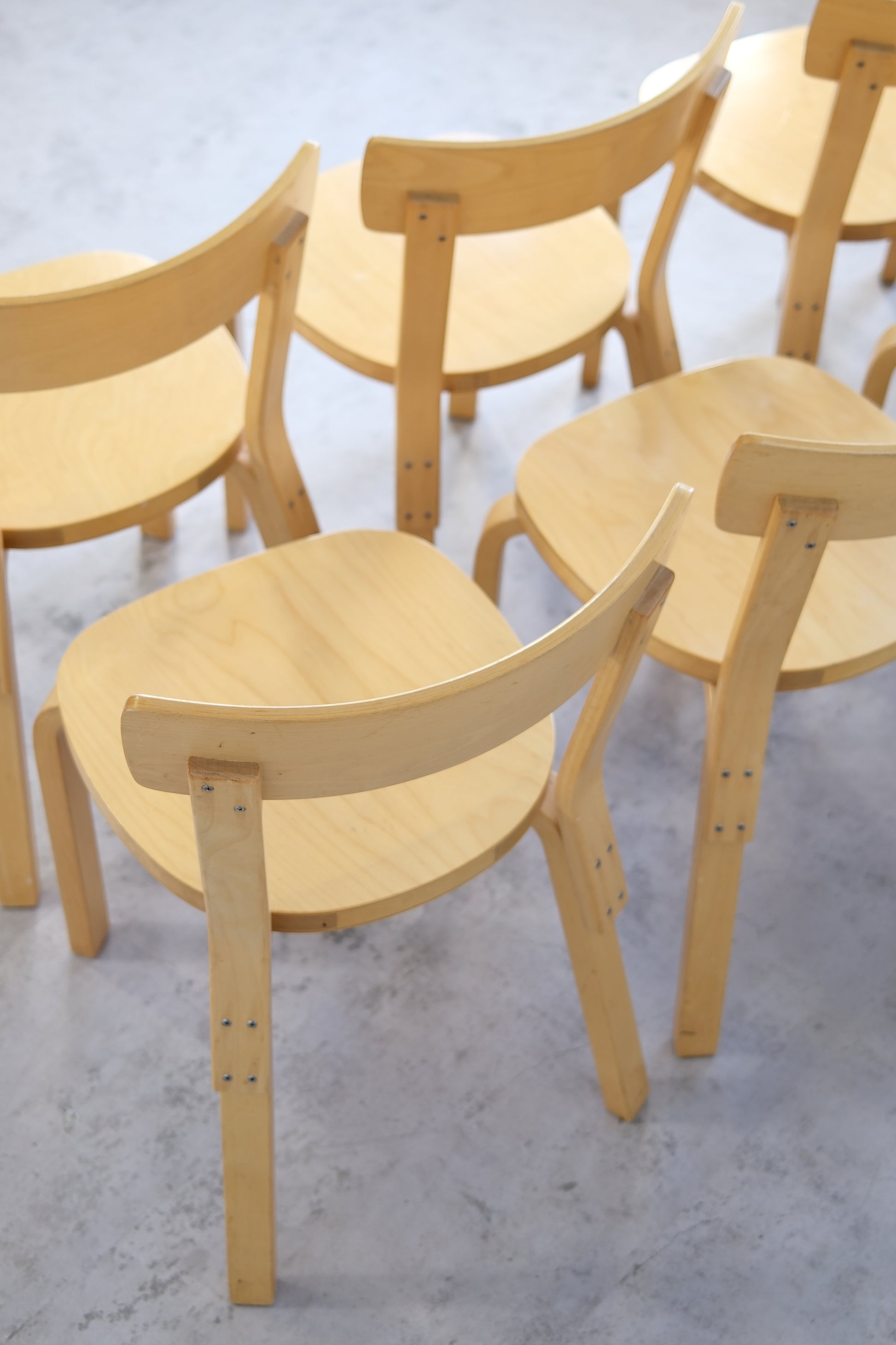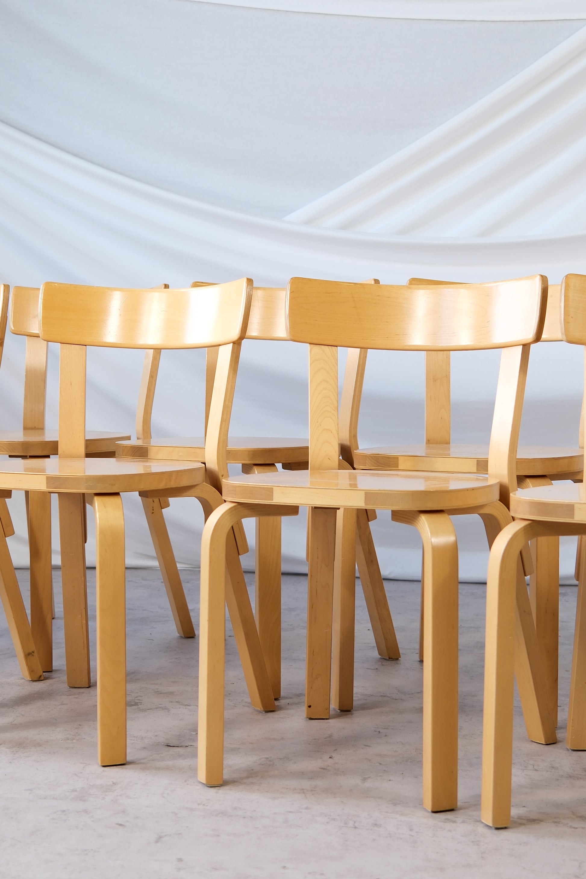 Set of eight original Artek 69 chairs in birch, designed by Alvar Aalto in 1935. With their sturdy construction, clean lines, and timeless form, the 69 chairs are among Aalto’s most enduring and versatile designs.