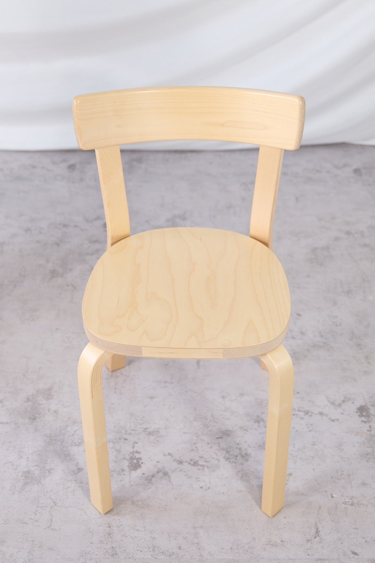 Set of four original Artek 69 chairs in birch, designed by Alvar Aalto in 1935. With their sturdy construction, clean lines, and timeless form, the 69 chairs are among Aalto’s most enduring and versatile designs.