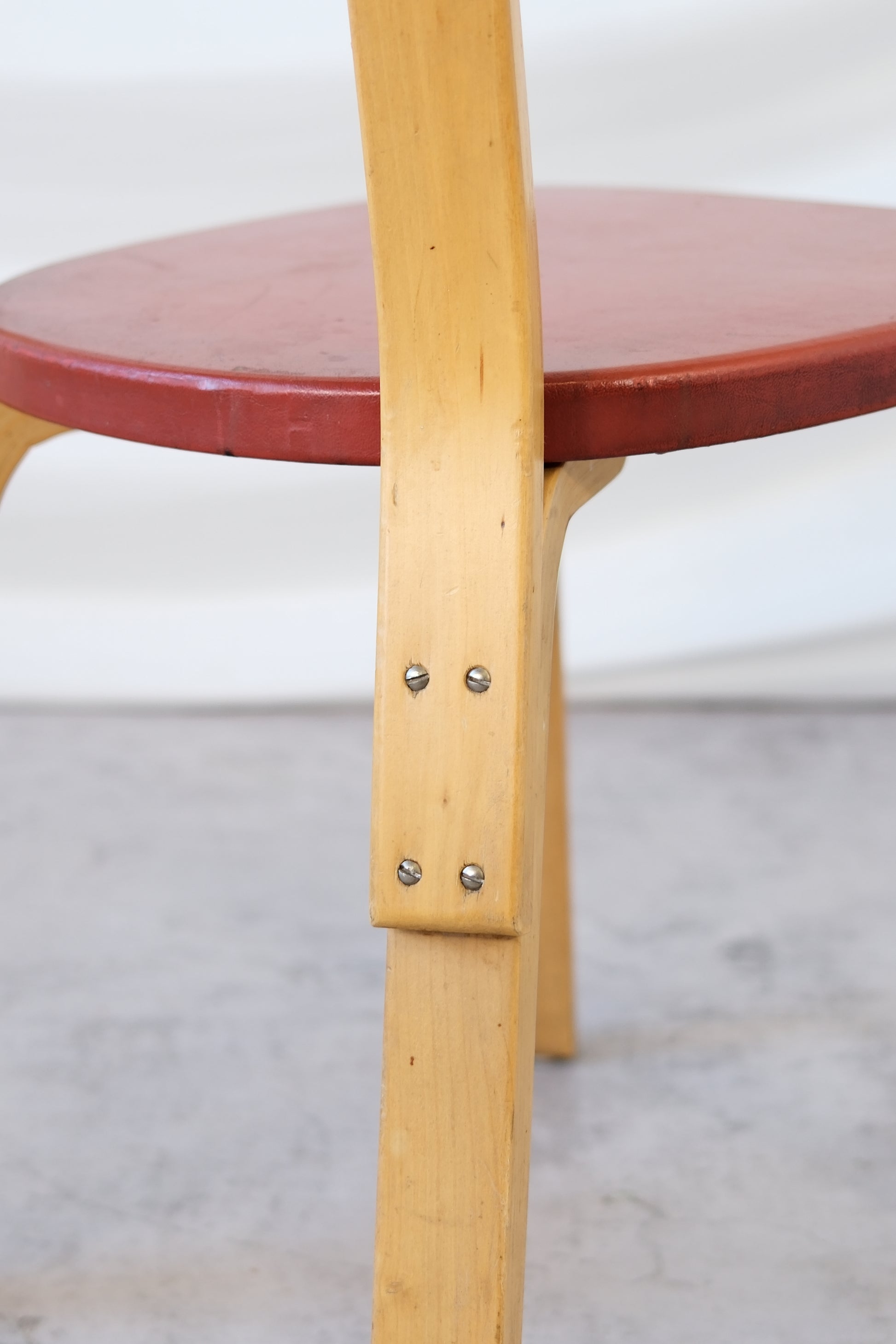 A set of three vintage Artek 69 chairs, designed by Alvar Aalto in the 1930s. These classic Finnish chairs feature a birch frame combined with rare red leather upholstered seats, giving them both warmth and character.