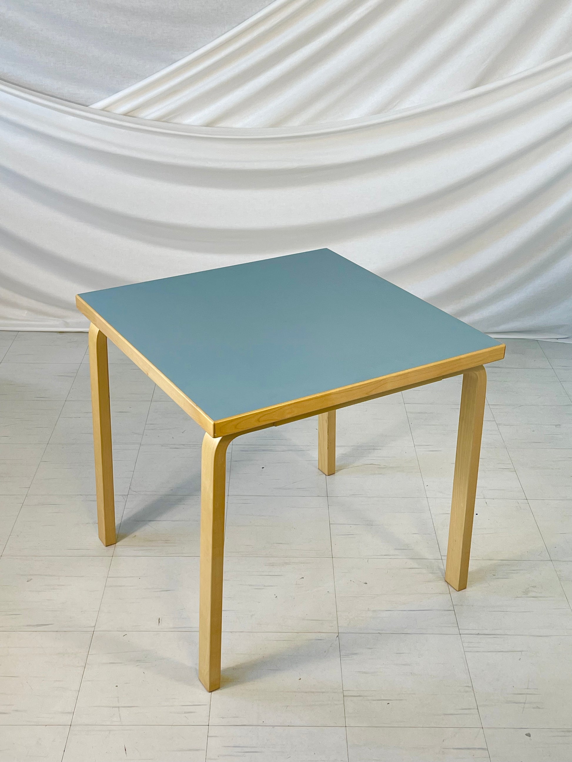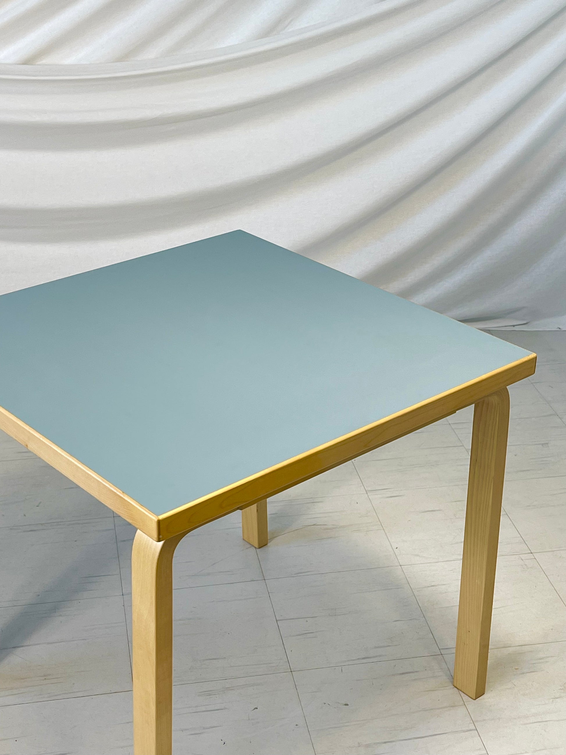 A compact and charming square table by Artek, model 81C, featuring a baby blue laminate top. Designed with Alvar Aalto’s signature L-leg construction, the piece combines clean lines with a soft pop of color. Originally introduced in the 1930s, the 81 series remains a versatile classic—ideal as a dining table for two, a kitchen side table, or a minimalistic desk.