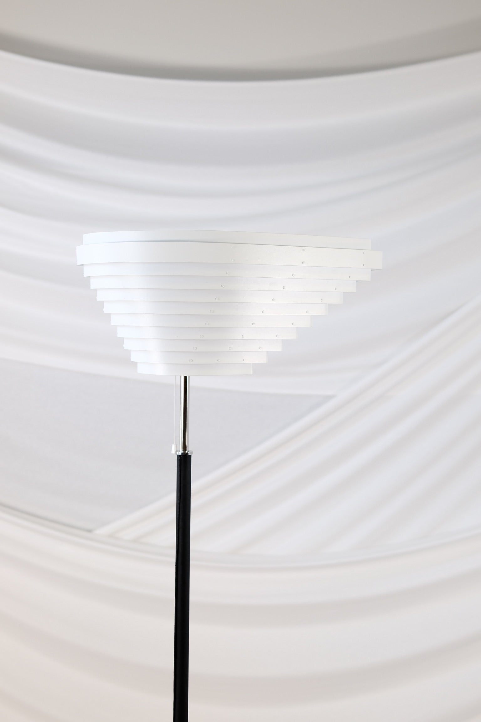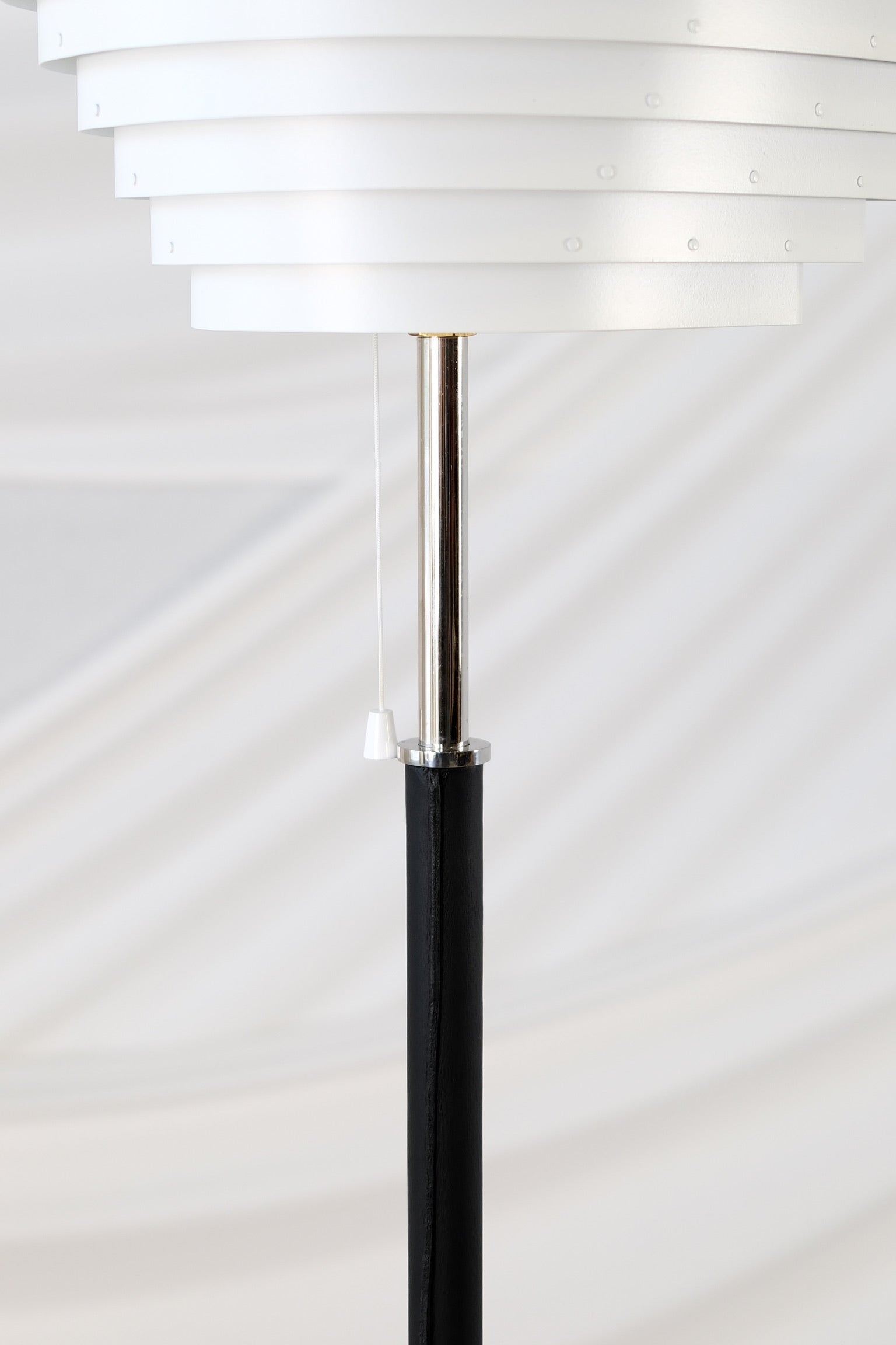 This version features a black leather-covered stand with chrome details, combining warmth and elegance in true Aalto style. A refined Scandinavian design classic that works beautifully as a reading lamp or an atmospheric floor light.