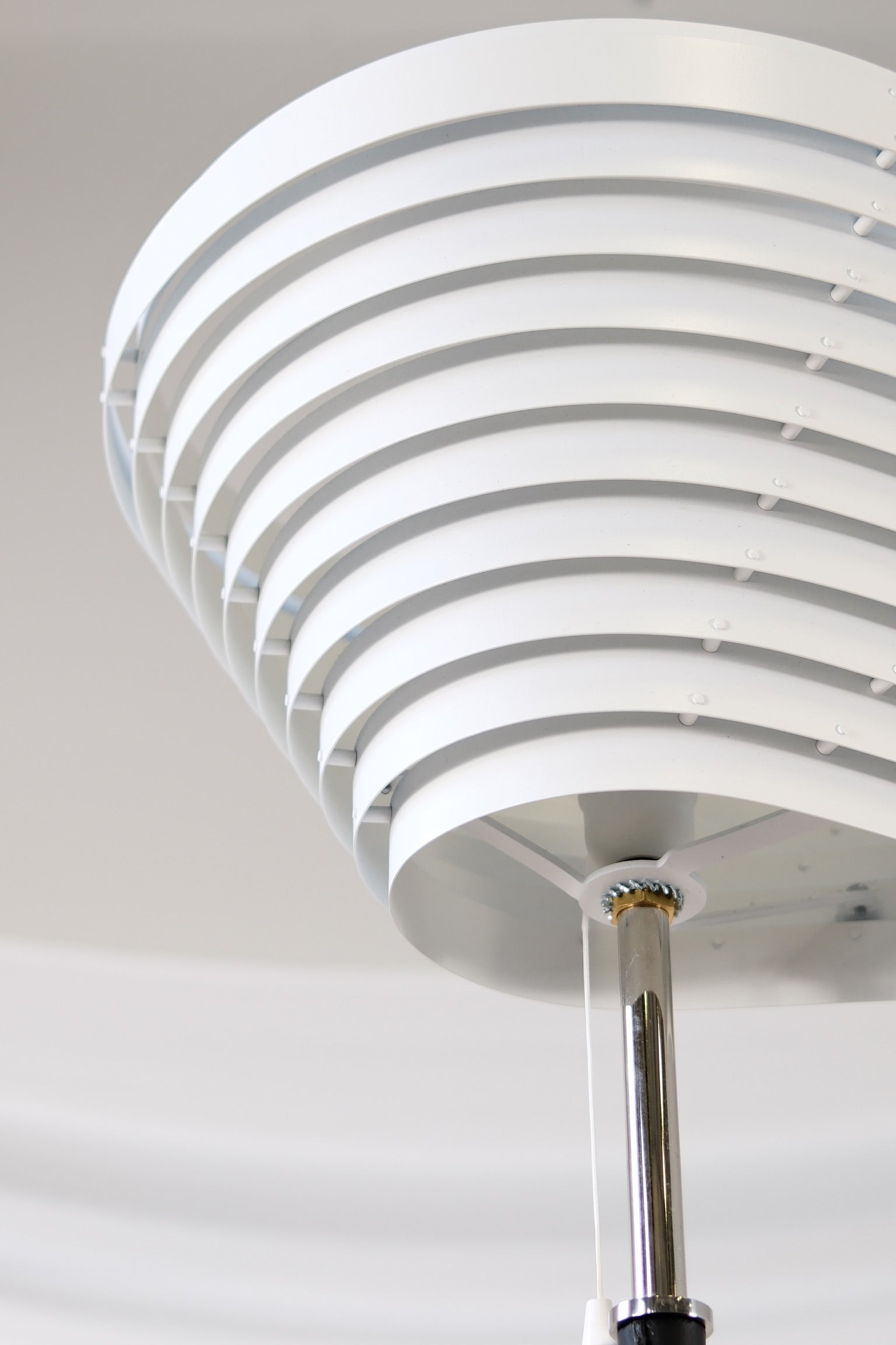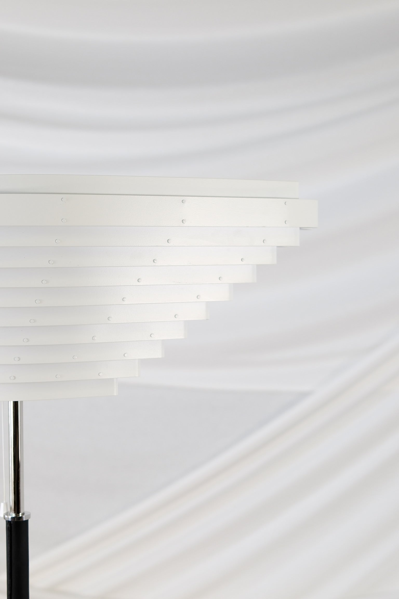 The A805 floor lamp, designed by Alvar Aalto in 1954, is one of his most iconic lighting designs. Sometimes called the “Angel Wing” lamp, the shade is formed from overlapping white painted metal strips, creating a sculptural silhouette that diffuses light softly and evenly.