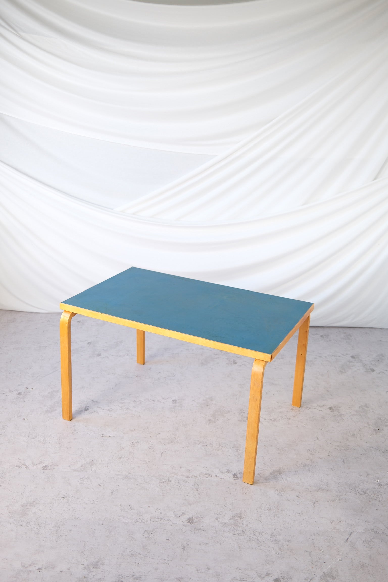 A vintage Artek dining table from the 1950s, featuring Alvar Aalto’s iconic bent birch legs and a striking blue linoleum top. The clean lines and practical materials make it a timeless piece that works beautifully as a dining table, desk, or work surface.