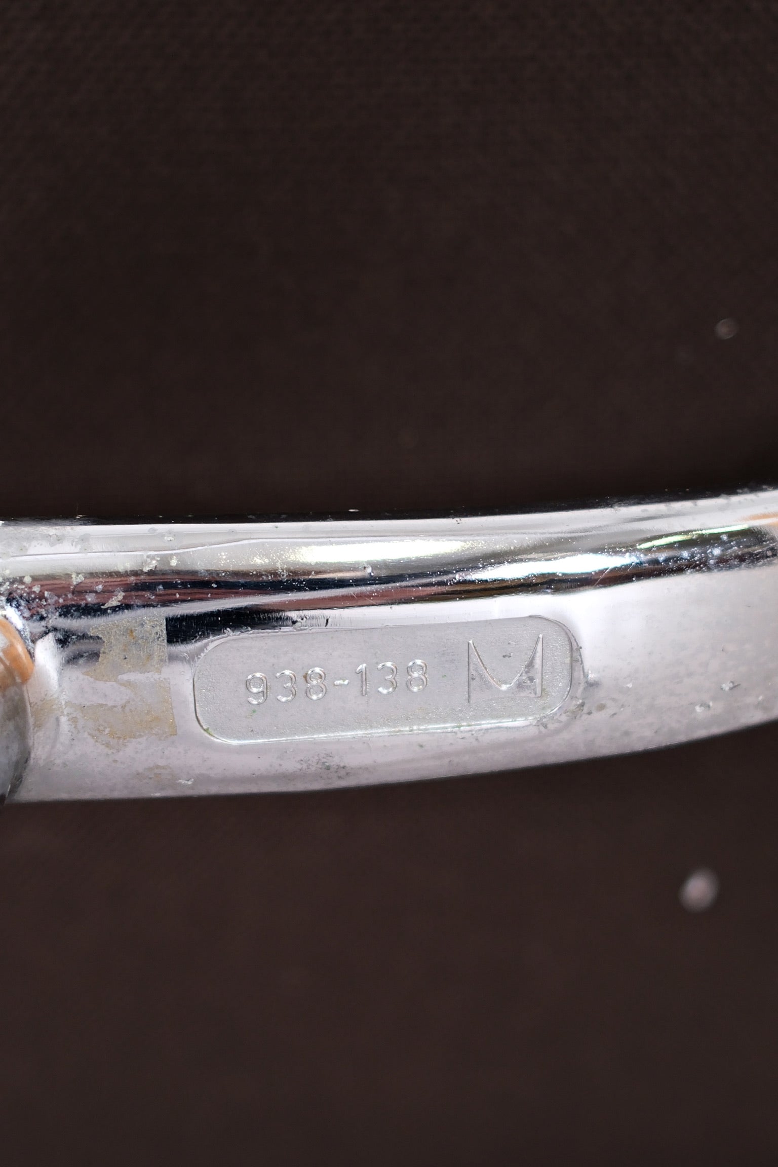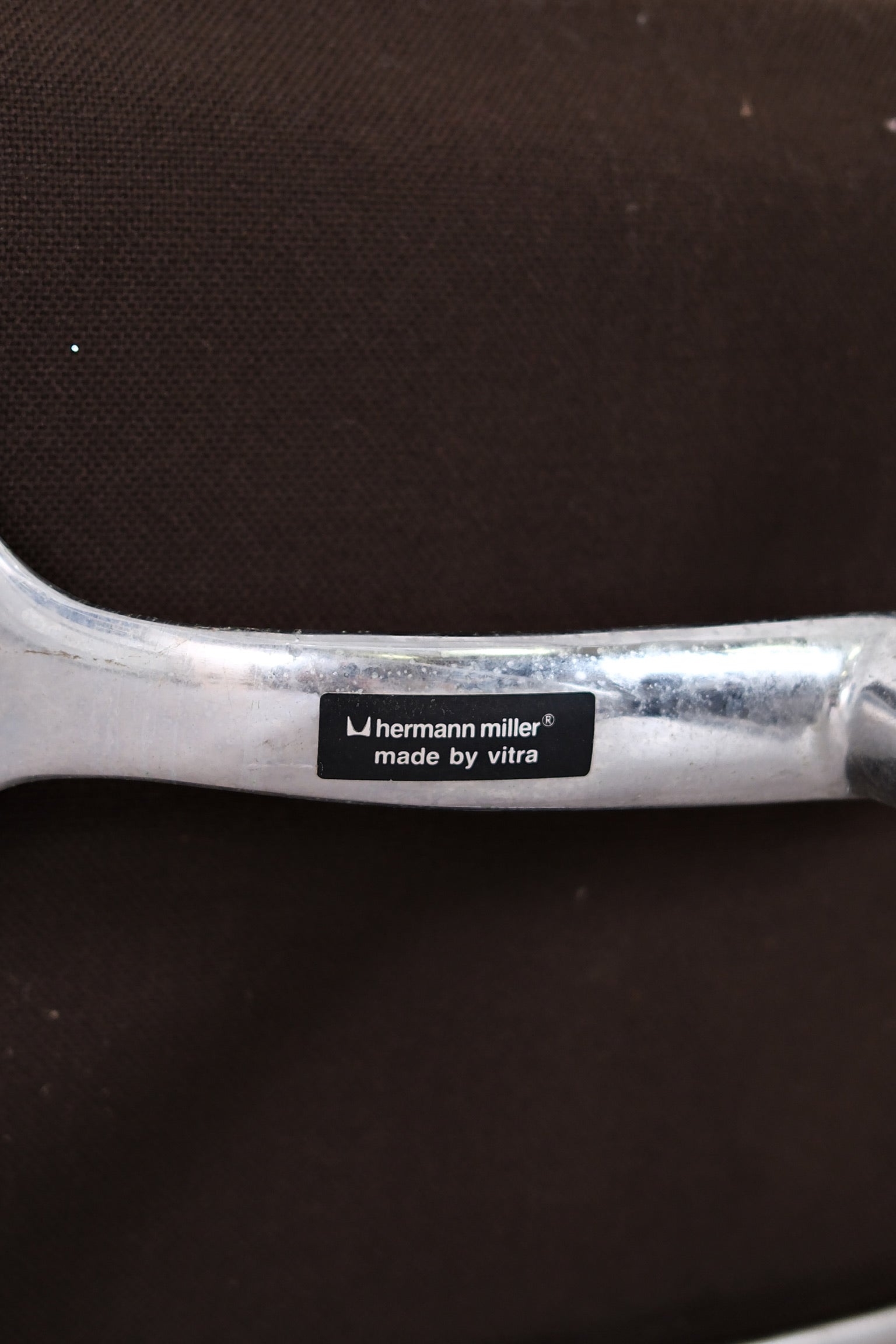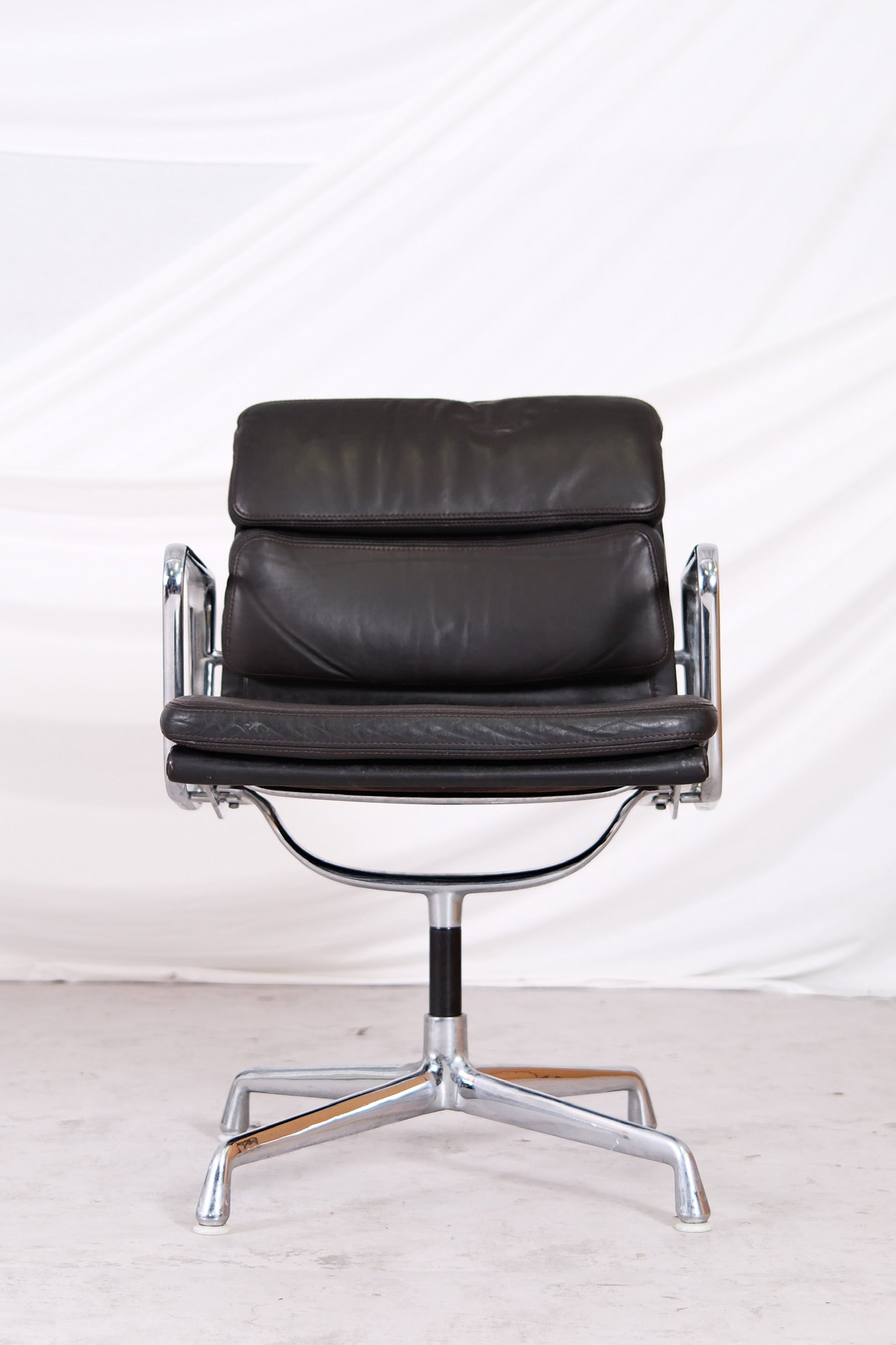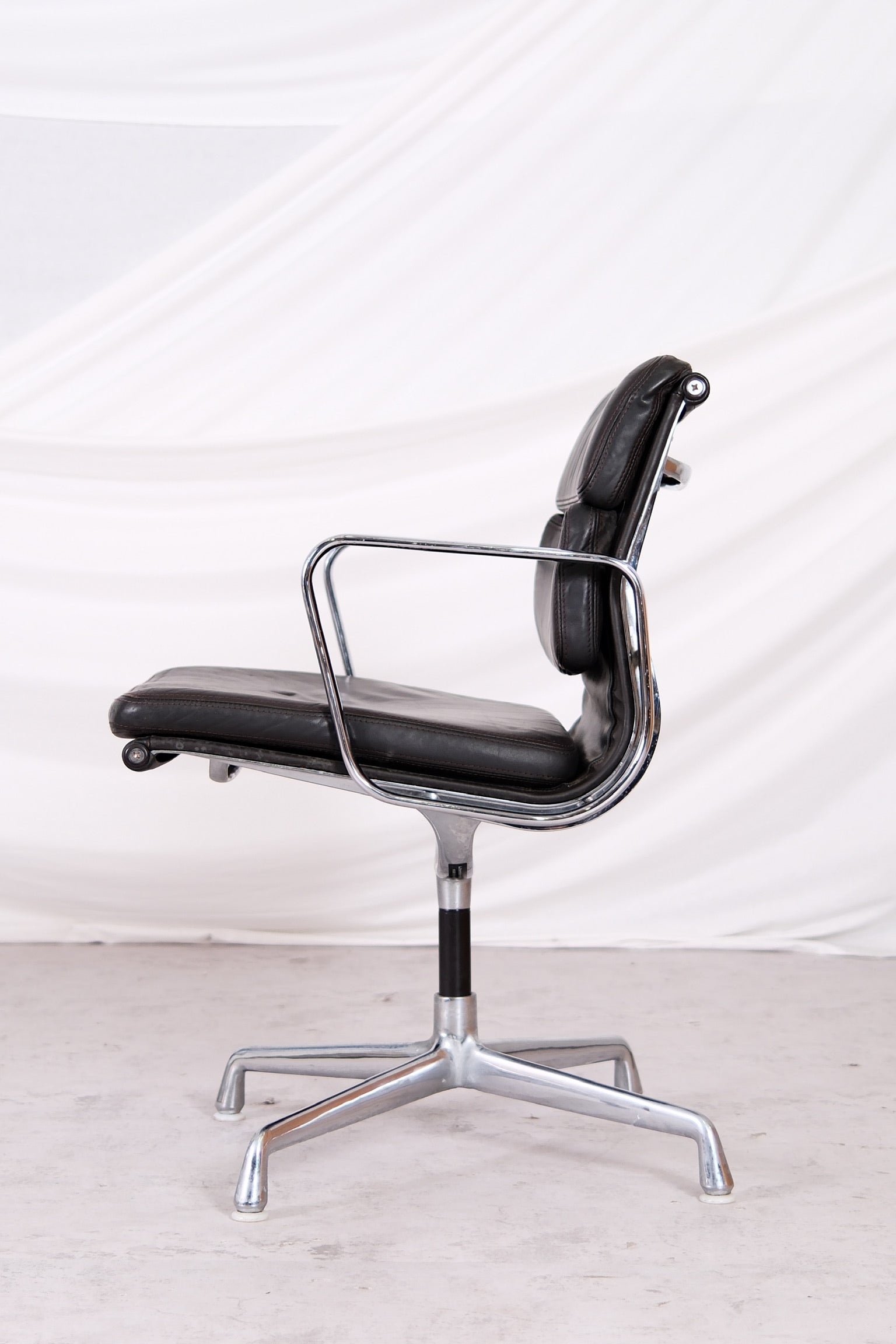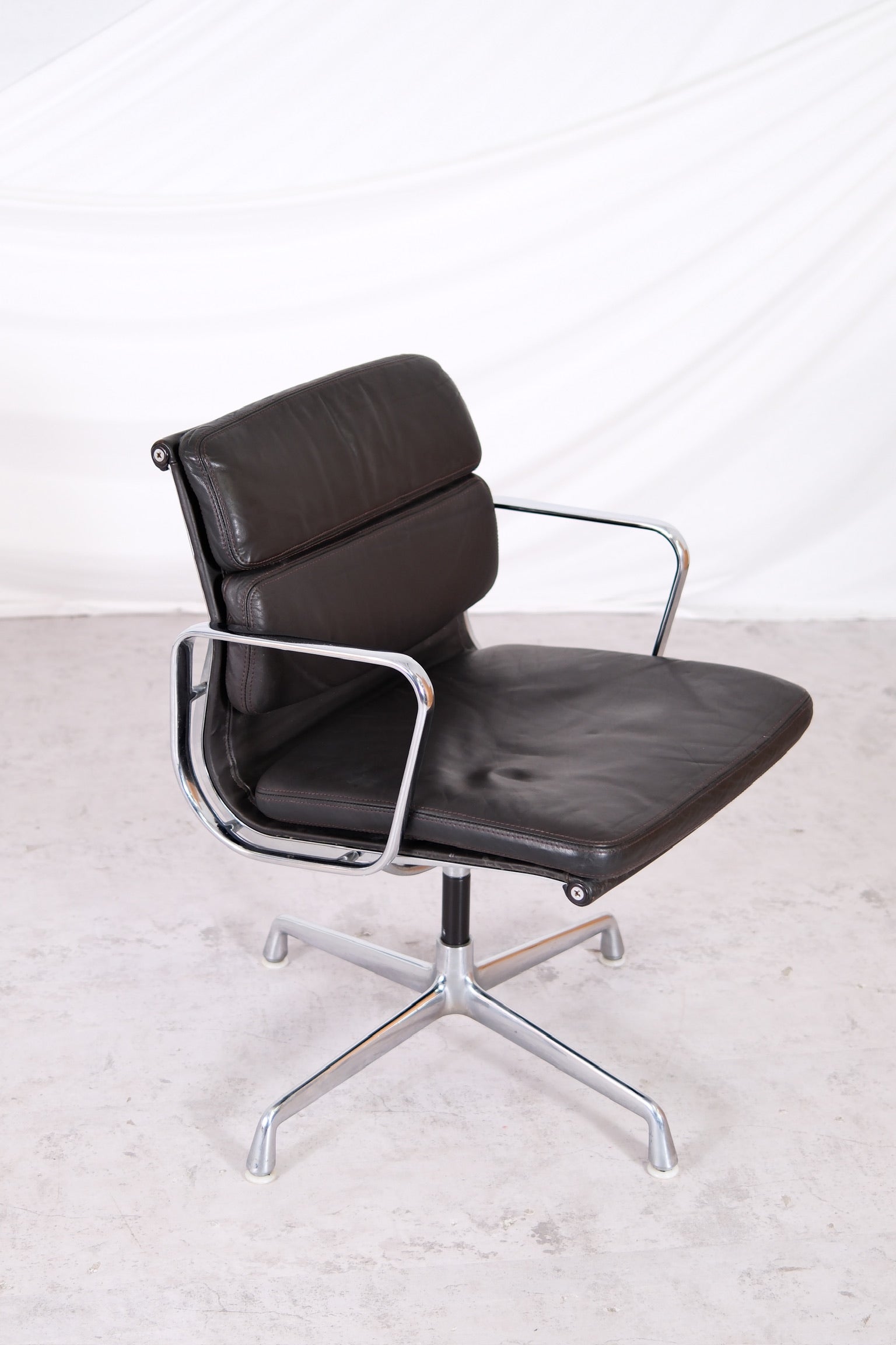Iconic EA208 Soft Pad chair designed by Charles and Ray Eames for Herman Miller. This version features a polished aluminum frame with Brown leather upholstery, offering a perfect balance of comfort and precision. A timeless piece that works equally well in office, lounge, or meeting spaces.