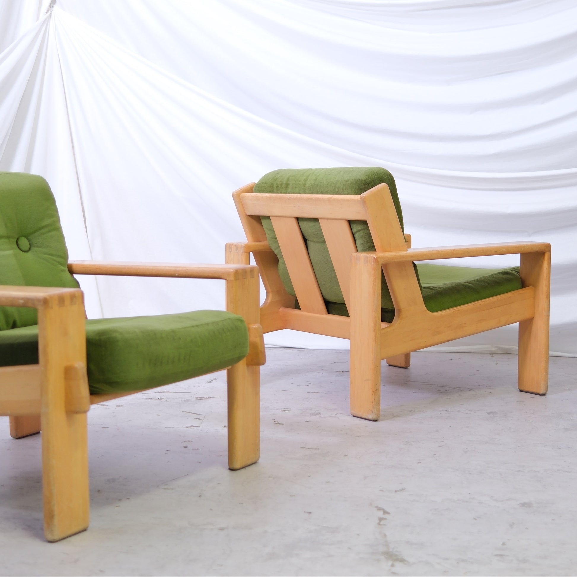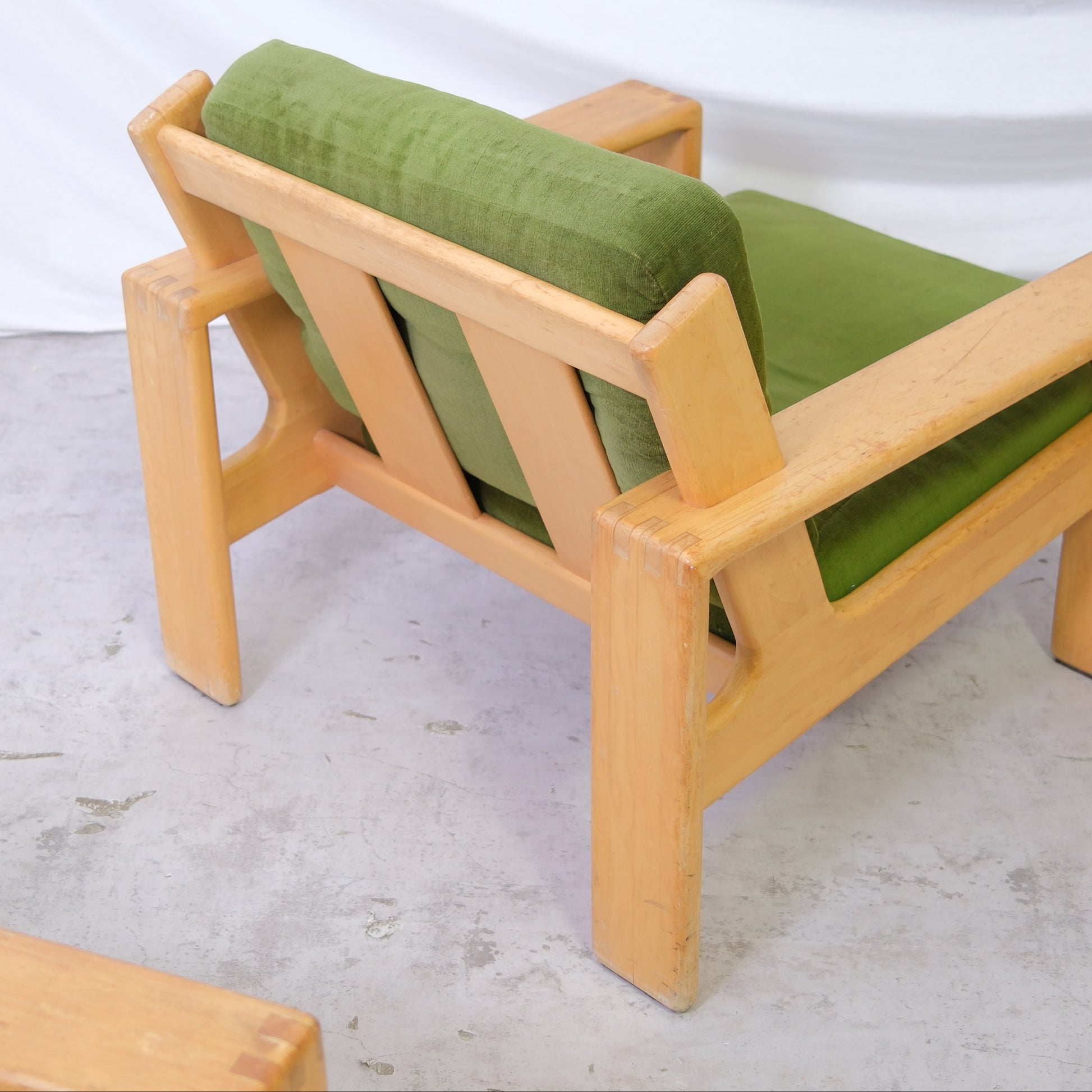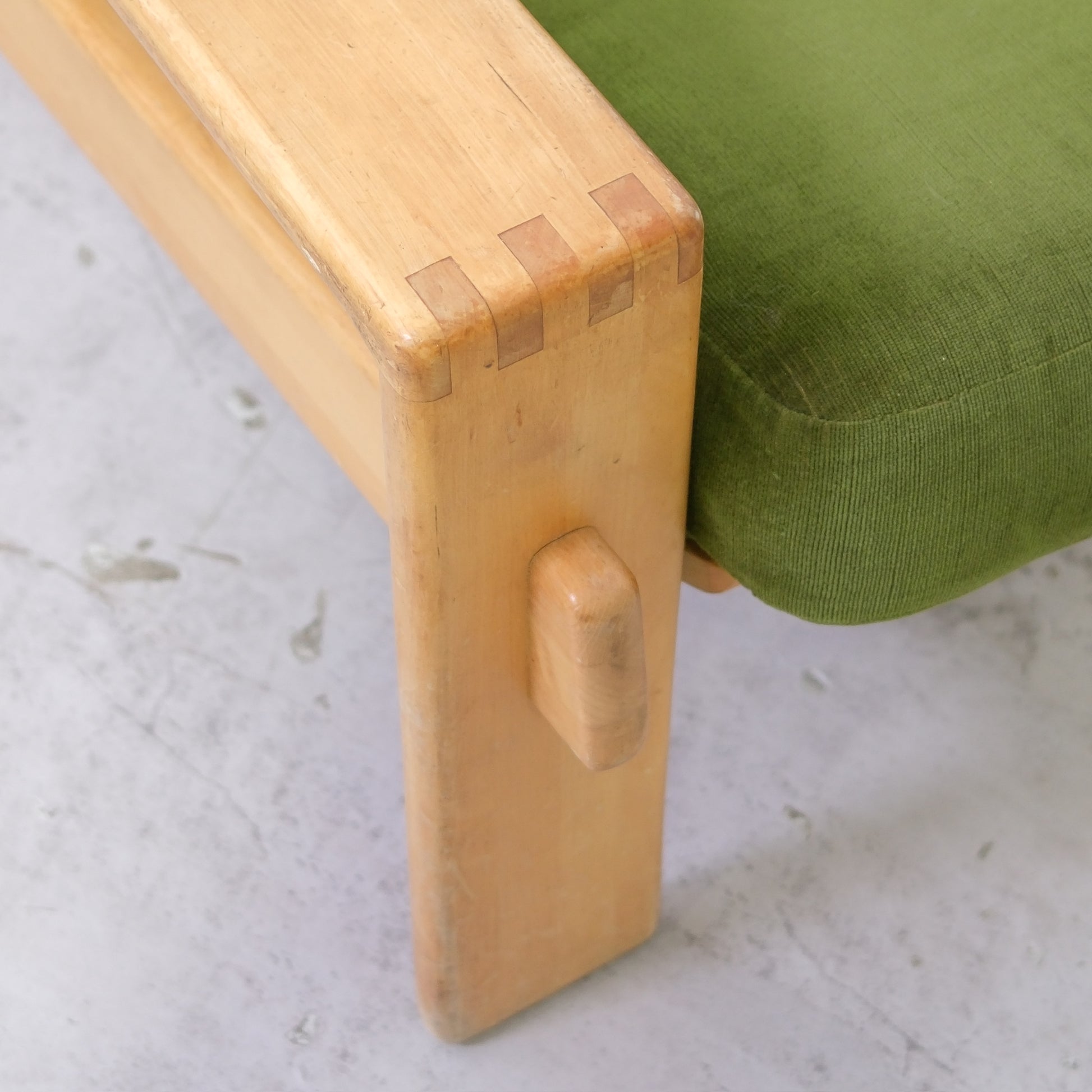 Esko Pajamies’ Bonanza armchair is a true Finnish design staple. Manufactured by Asko, it features the same strong wooden frame and generous cushions that make the series so recognizable. The green velvet upholstery adds warmth and depth to the clean, architectural lines.