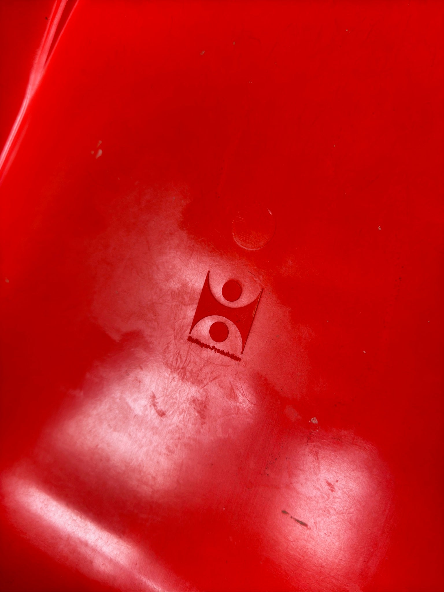 This set of red chairs is in good vintage condition. The fiberglass shells are structurally intact with light surface wear and minor scratches typical of age; no cracks or repairs noted. The original stamped maker’s mark is present. Please request detailed photos for specifics.