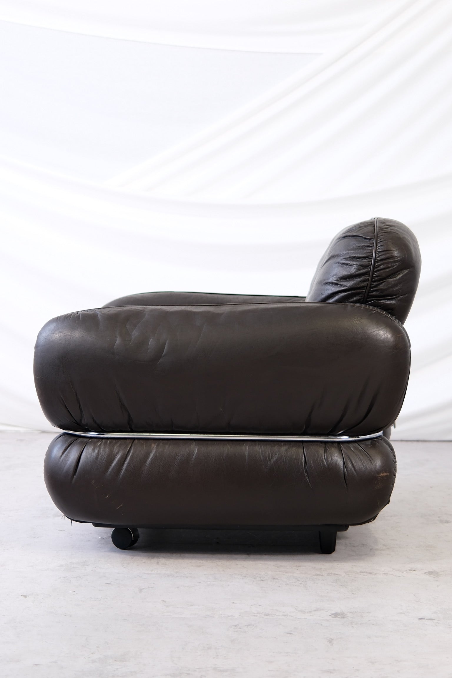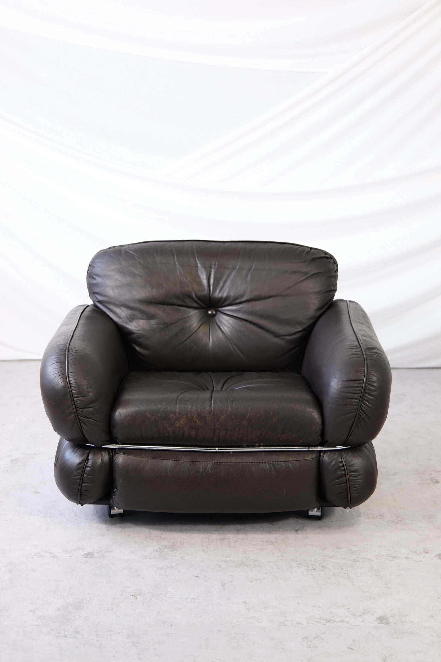 The chair features Brown leather upholstery and a distinctive tubular chrome frame wrapping around the seat, combining sculptural form with deep comfort. Perfect as a stand-alone statement piece or paired with the sofa for a complete set.