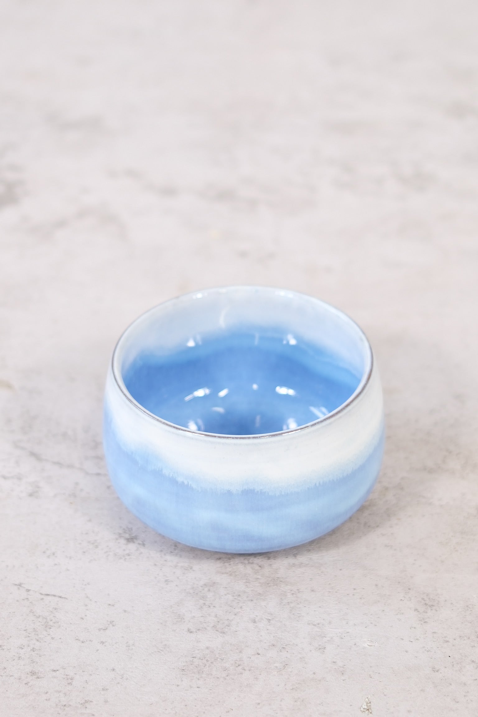 Vintage Japanese ceramic bowl featuring a soft blue gradient glaze that fades gently toward white, resembling the tones of a clear sky. The form is simple and balanced, highlighting the natural elegance of Japanese craftsmanship. Suitable for everyday use or display.