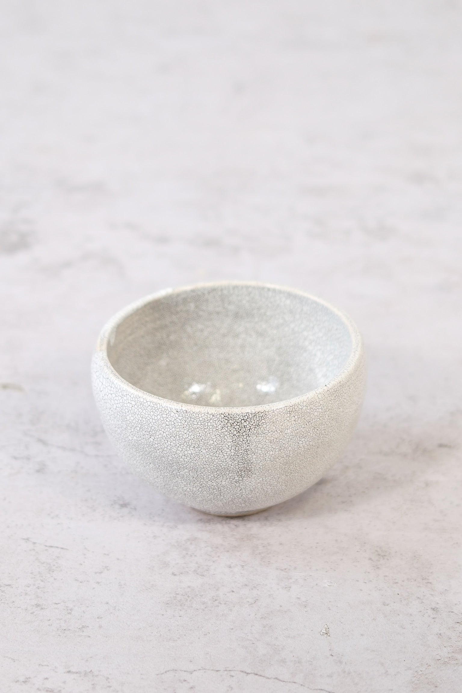 Vintage Japanese ceramic bowl with a refined white crackle glaze and rounded form. The fine surface pattern creates a quiet depth and texture, giving the piece an understated elegance typical of Japanese craftsmanship. Signed Tojiki Tonya on the base.