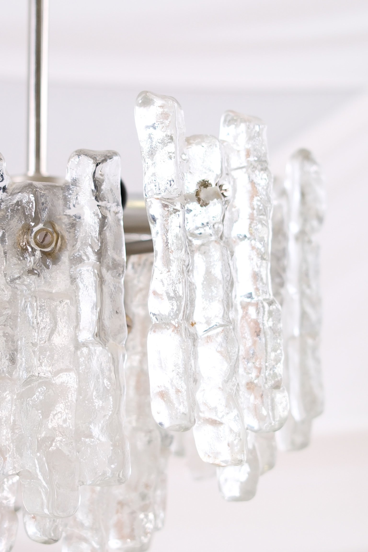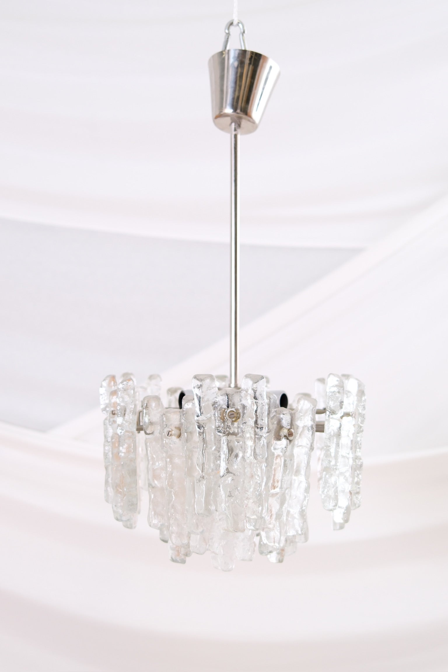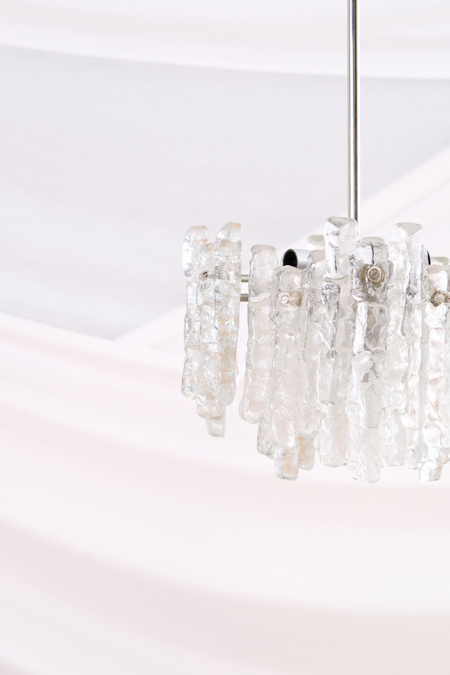 Original “Ice Block” chandelier designed and produced by JT Kalmar in Austria during the 1960s–1970s. The lamp features a chrome-plated frame with sculptural molded glass elements that beautifully resemble blocks of ice. The design captures light in a striking way, creating a soft, shimmering glow characteristic of Kalmar’s mid-century lighting.