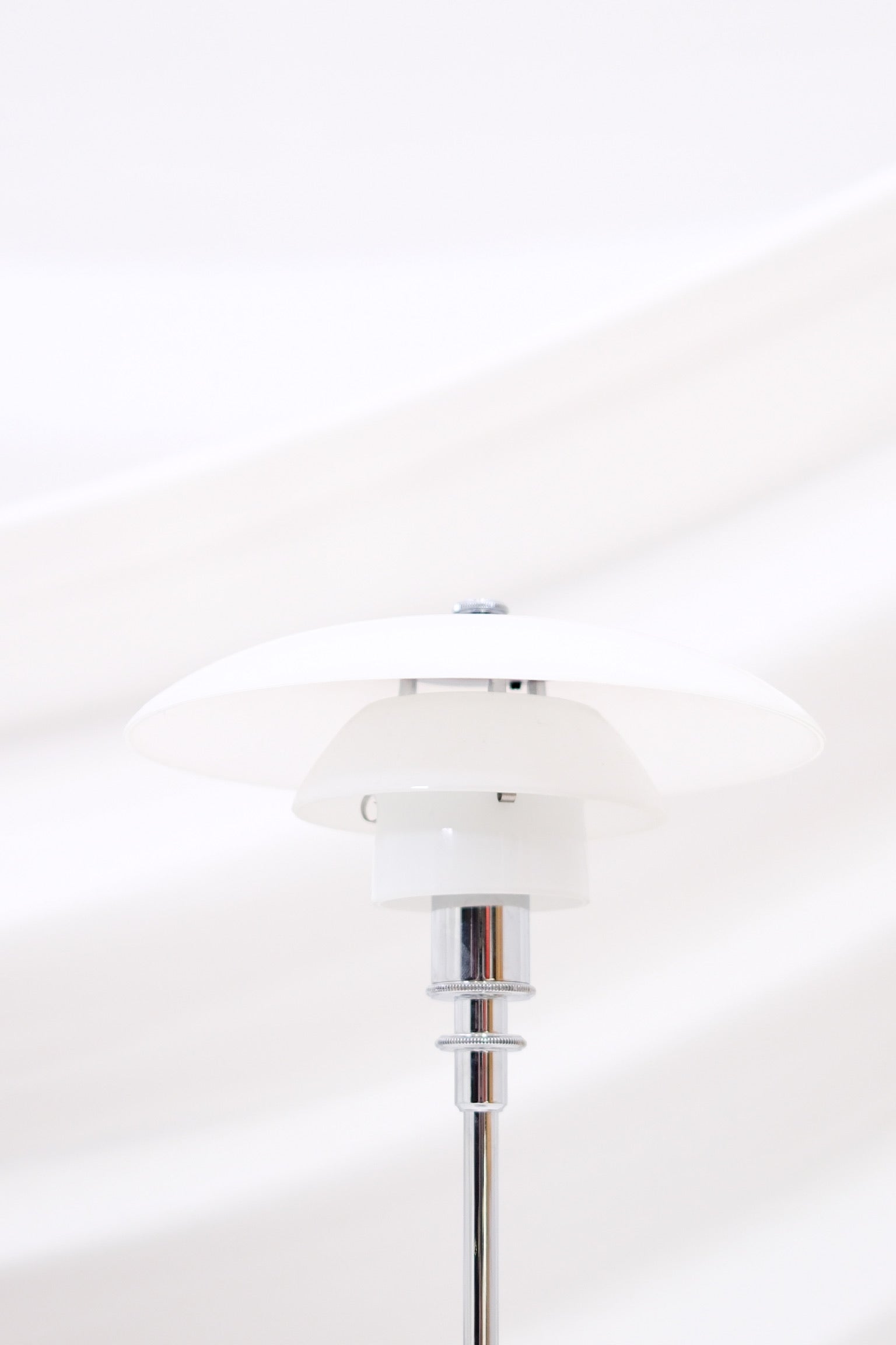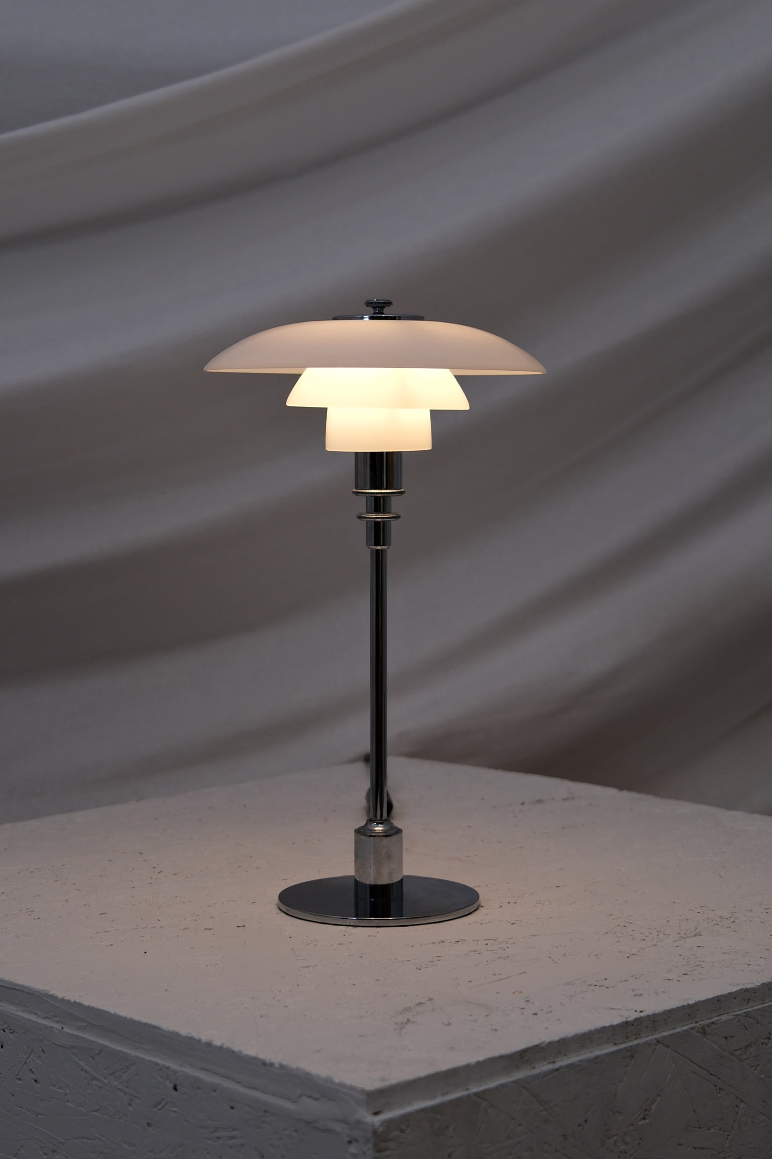 The PH 2/1 table lamp uses Poul Henningsen’s famous three-shade system, designed to soften glare and spread light evenly downward and outward.