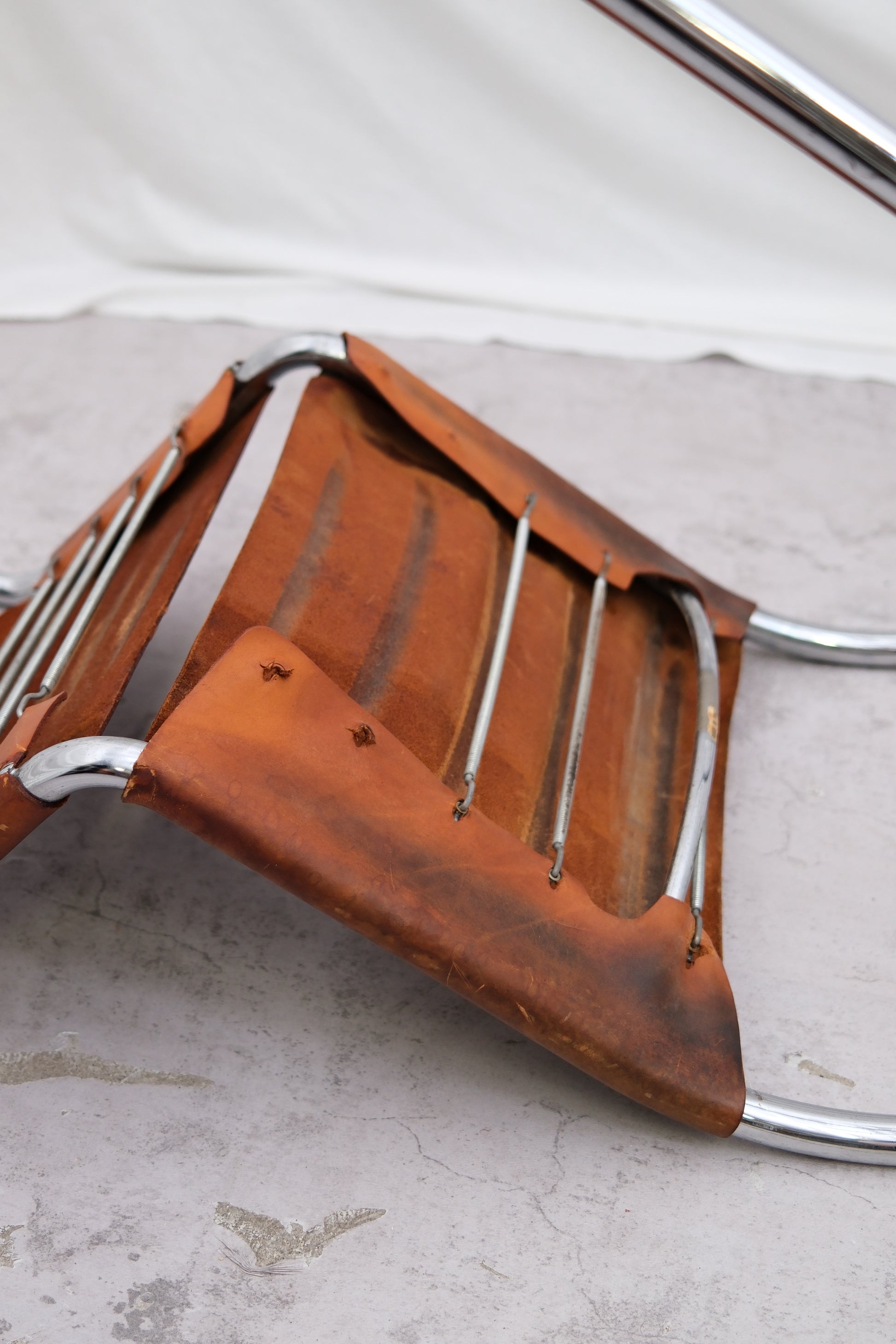 Good vintage condition. The leather shows natural wear and patina consistent with age. Two springs are missing from the underside, but the chair remains sturdy and comfortable to sit on. The chrome frame is clean and solid. Please see photos for details.