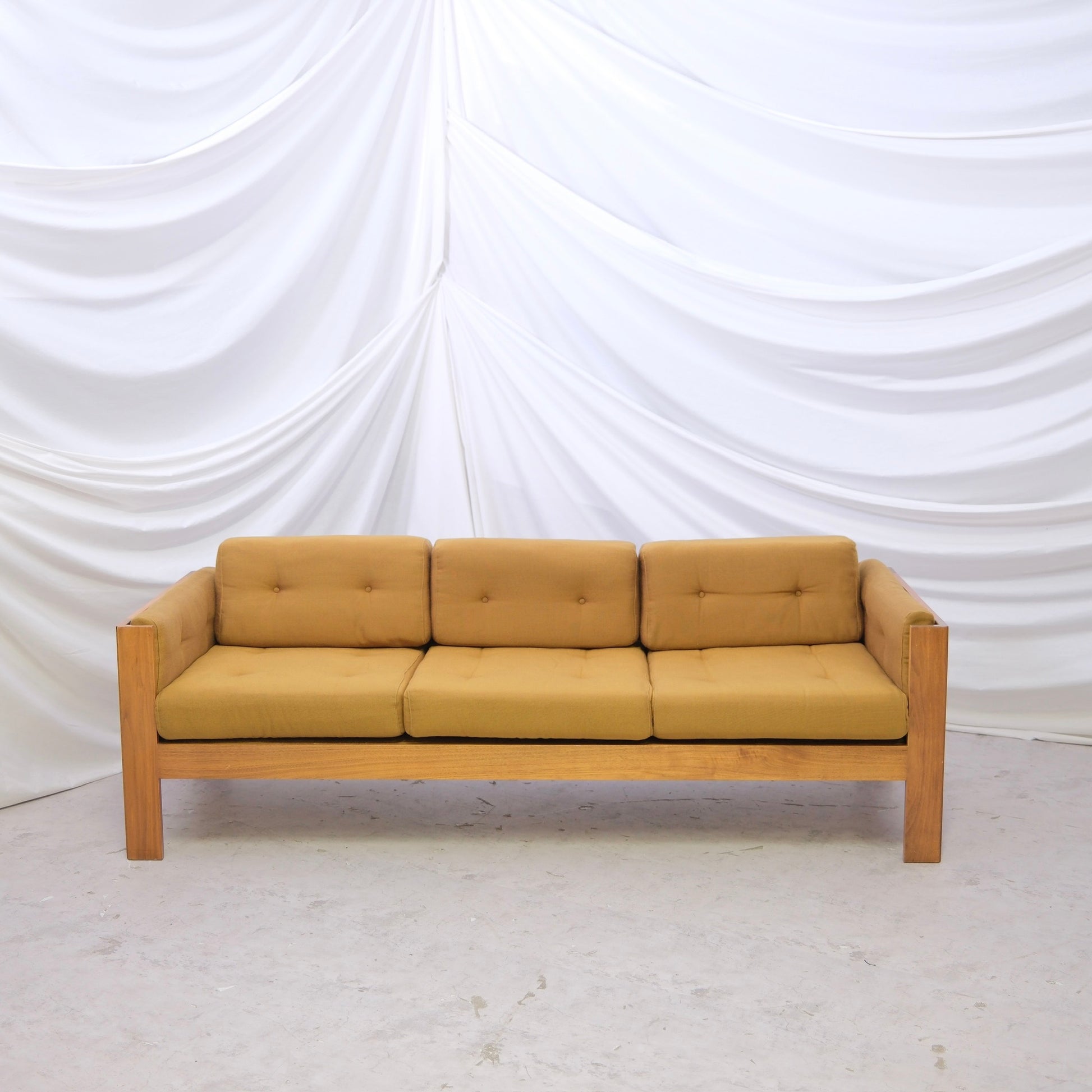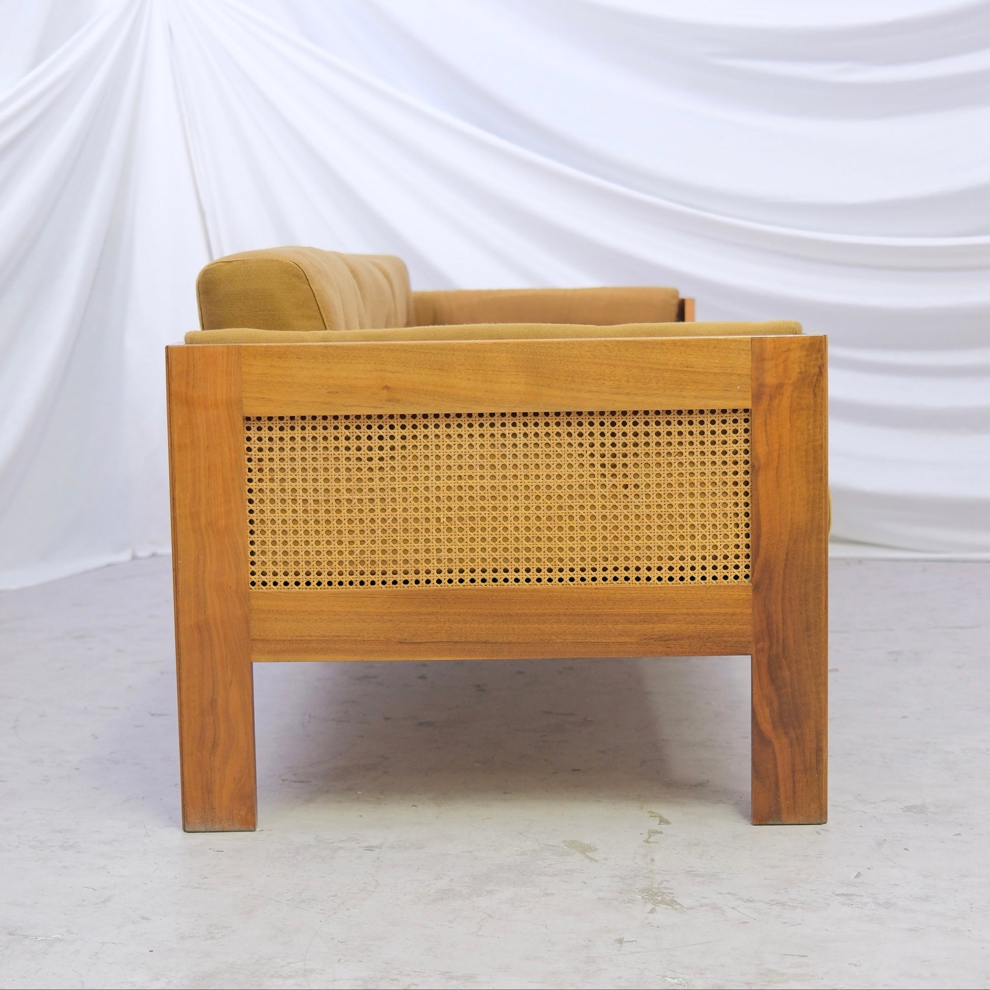 The sofa features mustard toned upholstery paired with warm wood and rattan side panels. The combination of materials gives the piece a calm and natural feel typical of Finnish furniture from the period. With its wide seat and structured frame, the sofa works well in a living room or lounge setting.