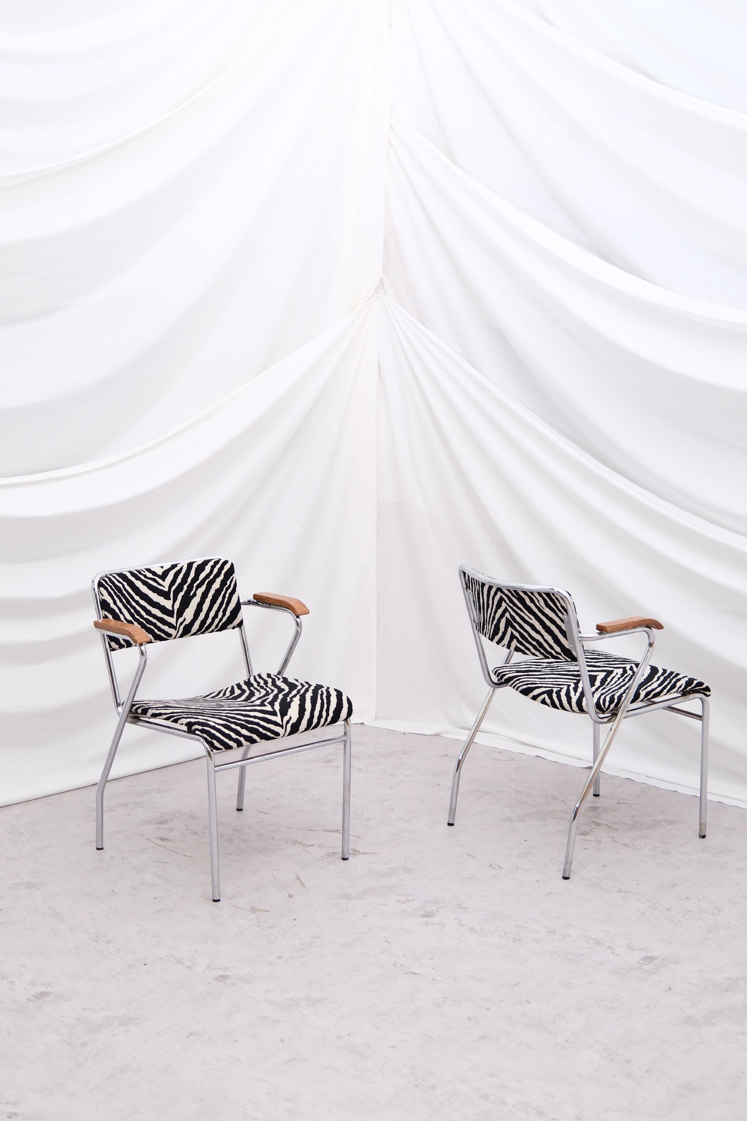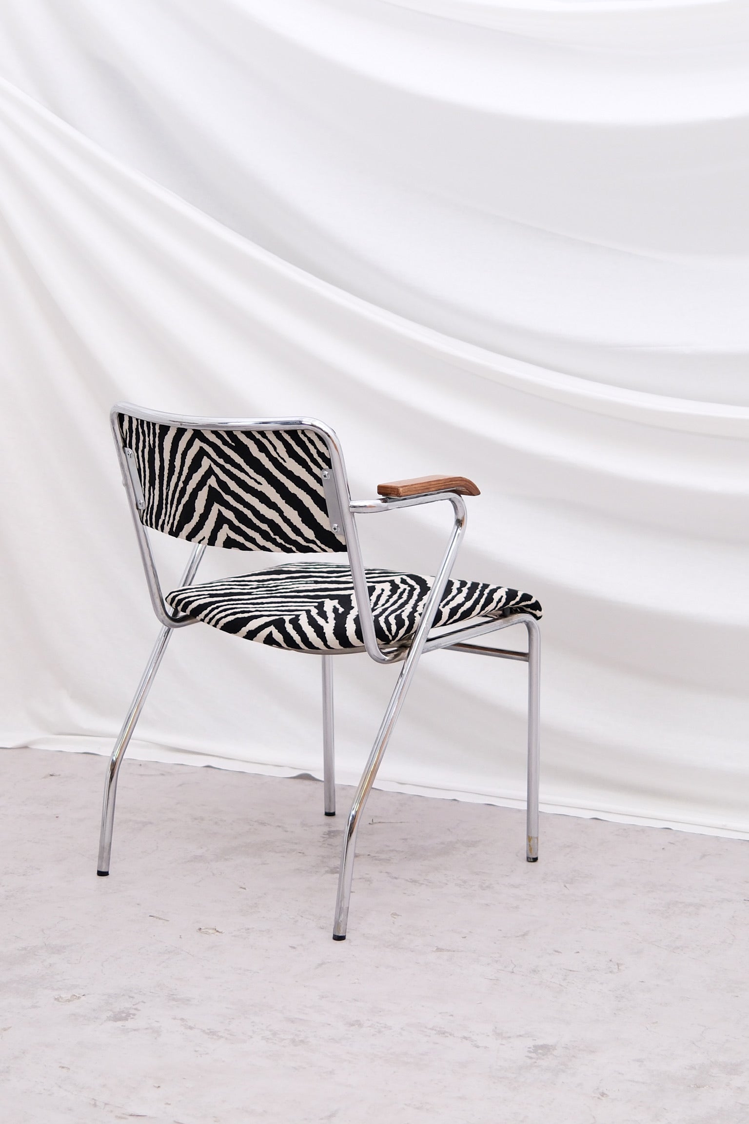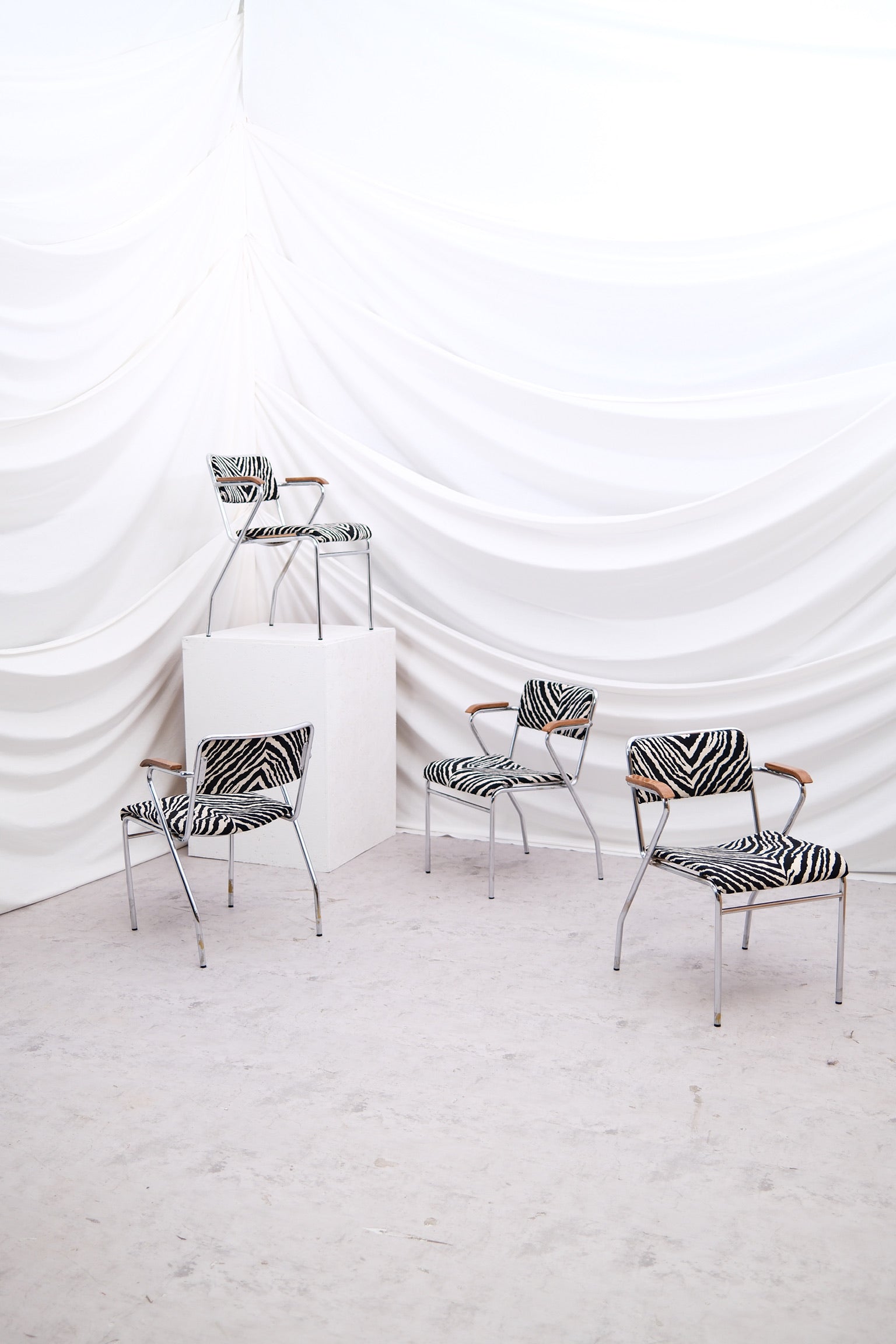 A striking set of 10 vintage chairs with polished tubular steel frames, sculpted wooden armrests, and bold zebra-patterned upholstery. The dynamic contrast of natural wood, chrome, and graphic fabric gives these chairs a unique character—equal parts playful and refined.