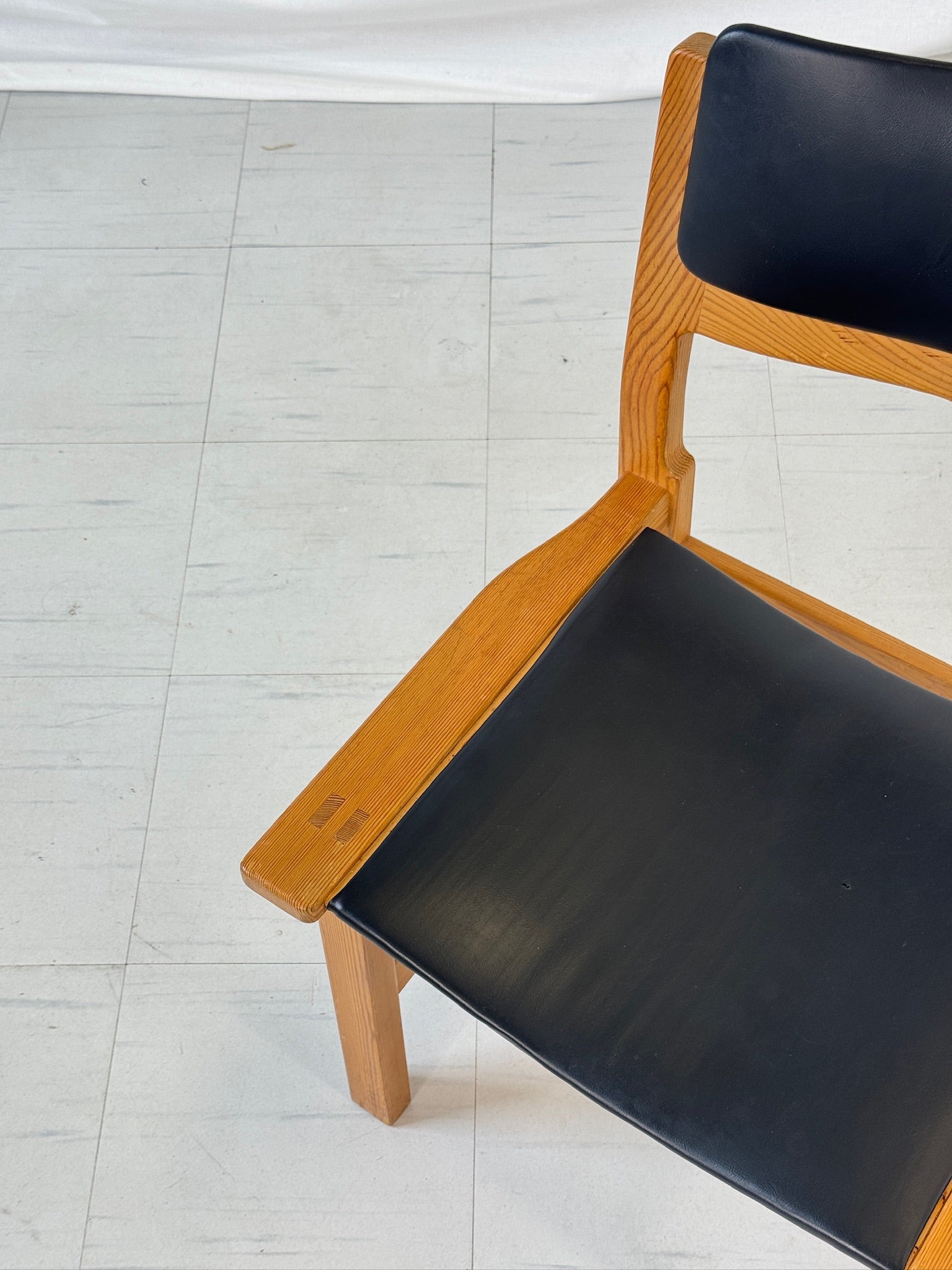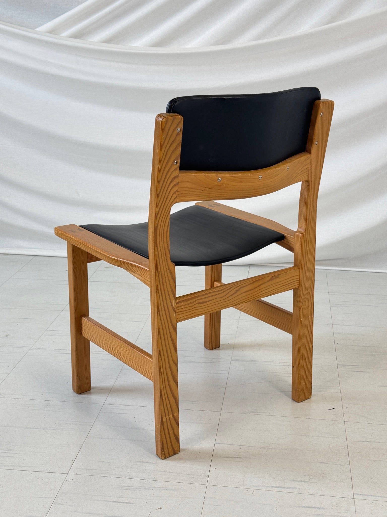 Each chair features a warm pine frame paired with black faux leather upholstery on the seat and backrest — a striking contrast that balances rustic materiality with clean, modern lines.