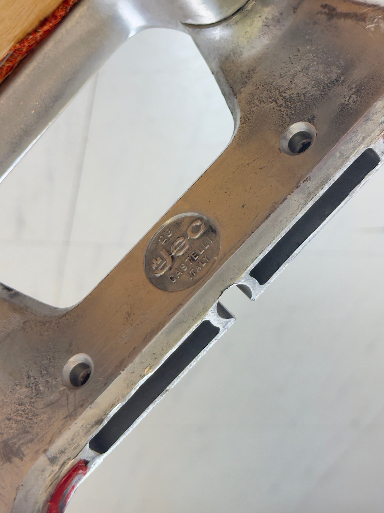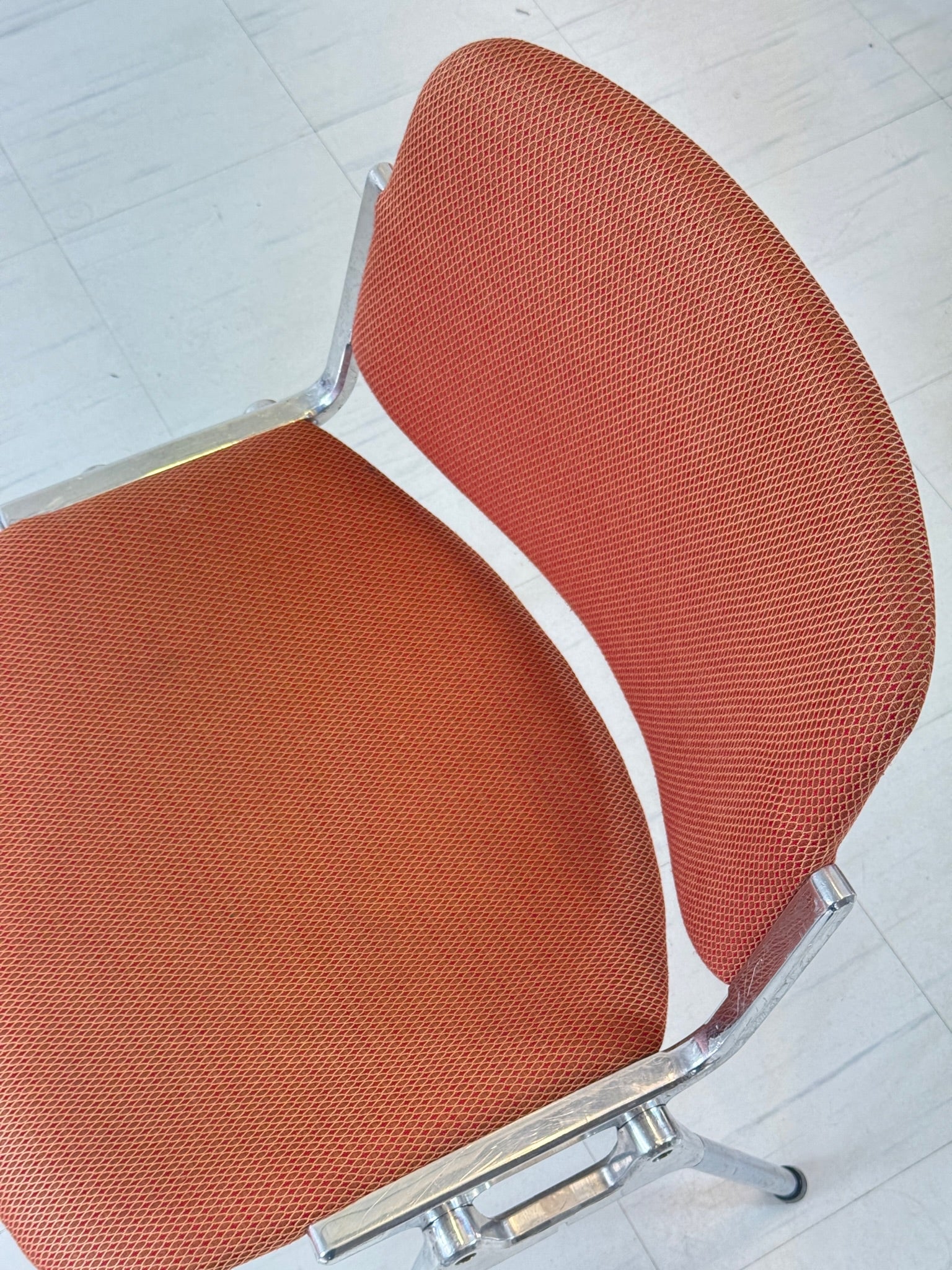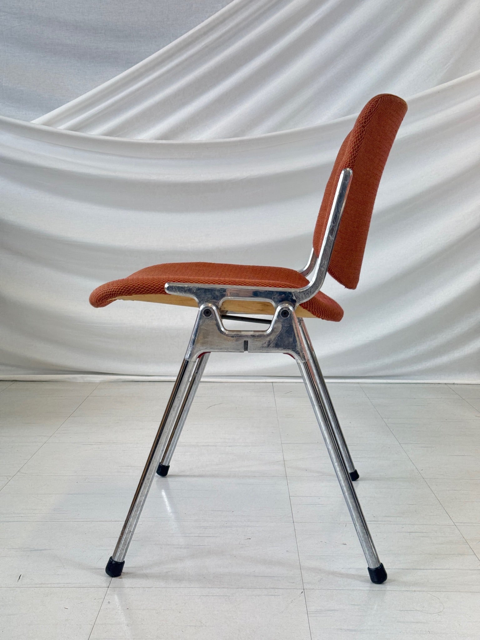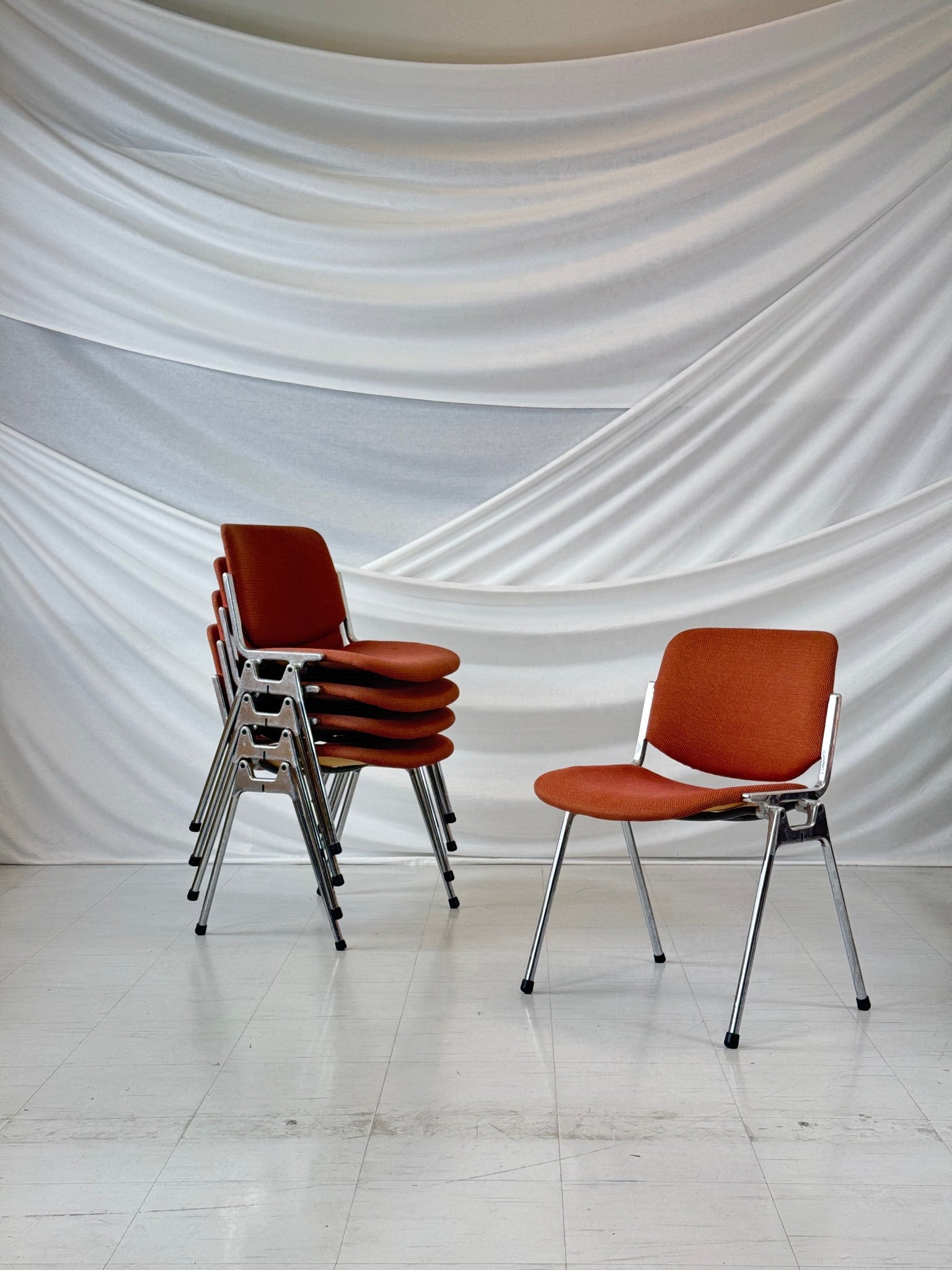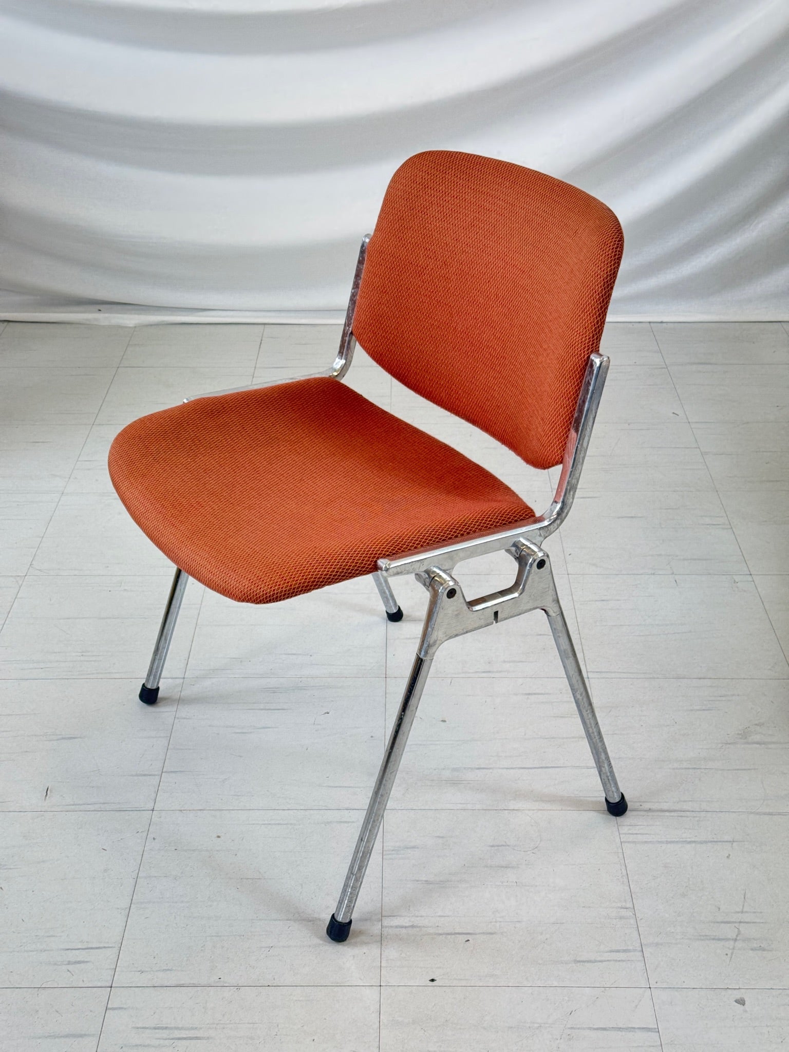 Designed by Giancarlo Piretti for Anonima Castelli, the DSC 106 chair is a functional and stylish classic of Italian modern design. These vintage stackable chairs feature chrome-plated steel frames and ergonomic seats upholstered in a rich burnt orange fabric, offering both comfort and visual warmth.