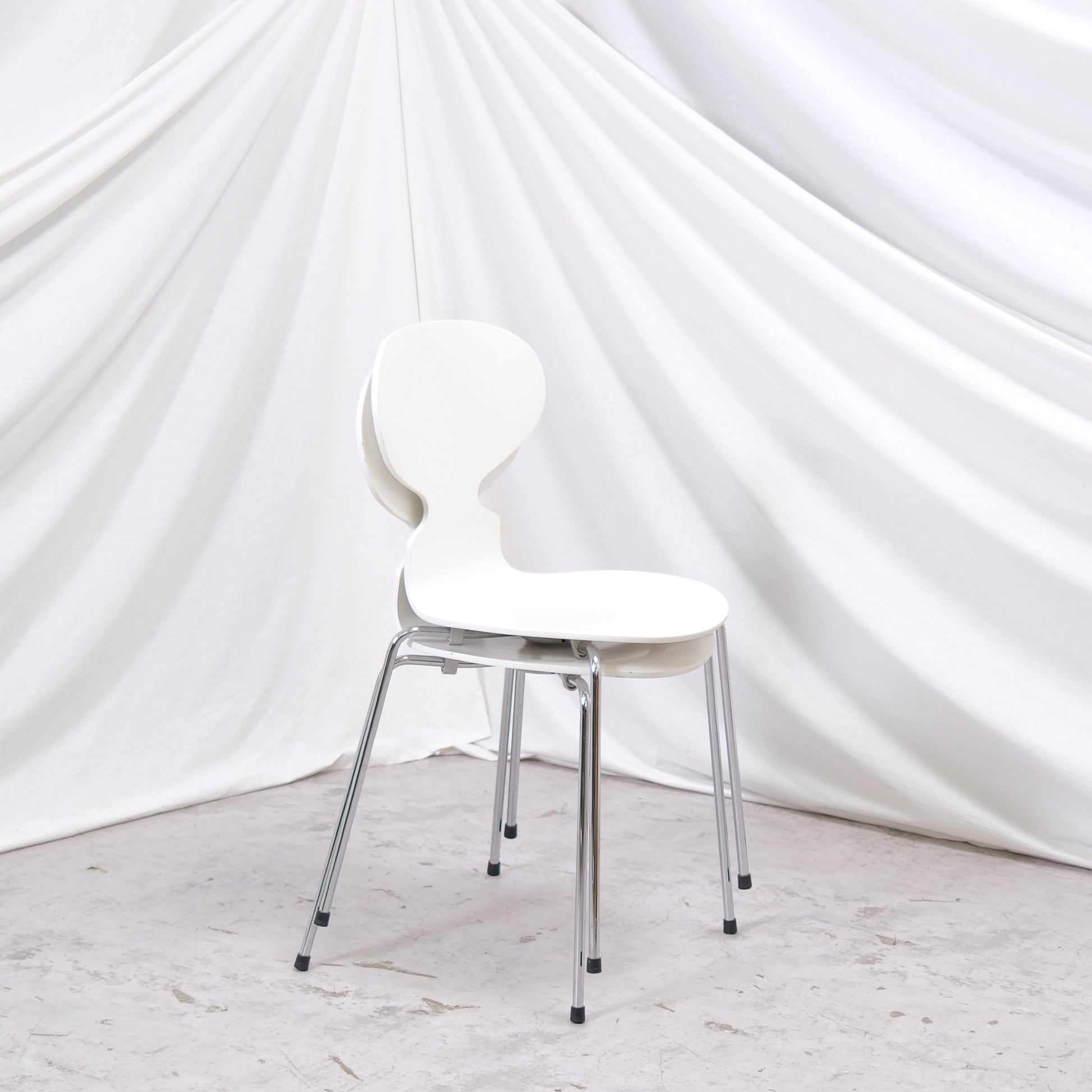 These chairs feature white molded plywood seats paired with chrome-plated steel legs. The form is slim and elegant, yet surprisingly comfortable, making them easy to place around a dining table, desk, or as occasional chairs. The white finish keeps the look clean and timeless, fitting both modern and more eclectic interiors.