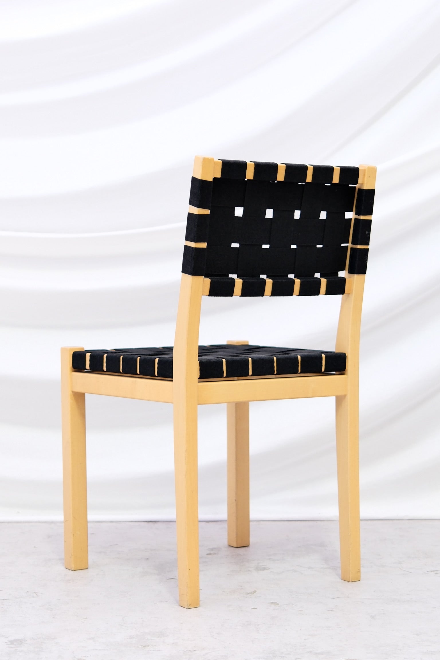 This set includes six birch chairs with black woven webbing on both the seat and backrest. The contrast between warm wood and graphic weave gives them a strong presence while staying easy and neutral. These work beautifully around a dining table or in a café or studio setting. The chairs can also be purchased individually.