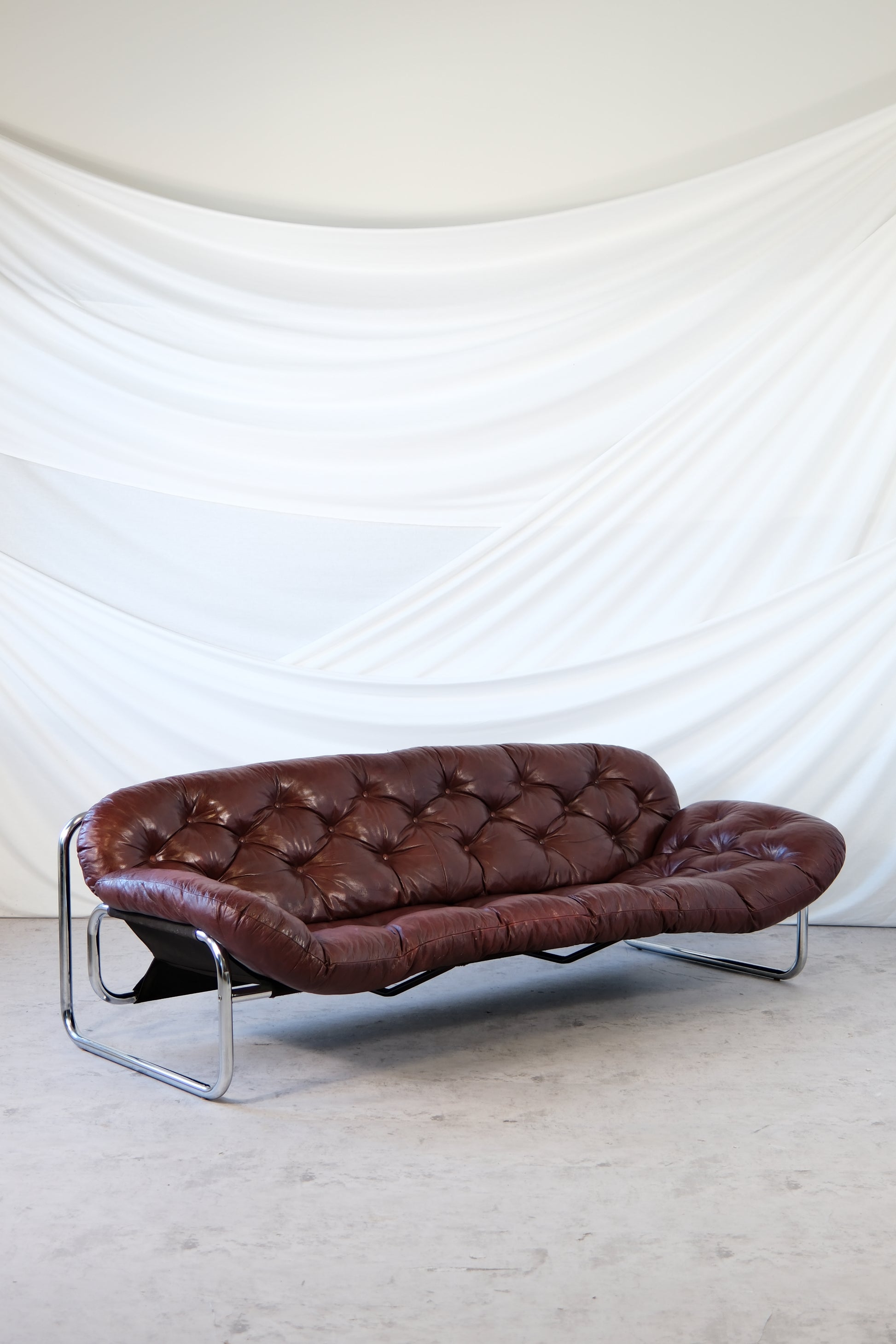 Designed by Johan Bertil Häggström for IKEA in the 1970s, this rare 3-seater sofa is a striking example of the brand’s bold design era. Upholstered in deep dark red leather with a distinctive tufted finish, the sofa combines comfort with an expressive sculptural form. The tubular chrome frame provides a modernist contrast, giving the piece both elegance and durability.