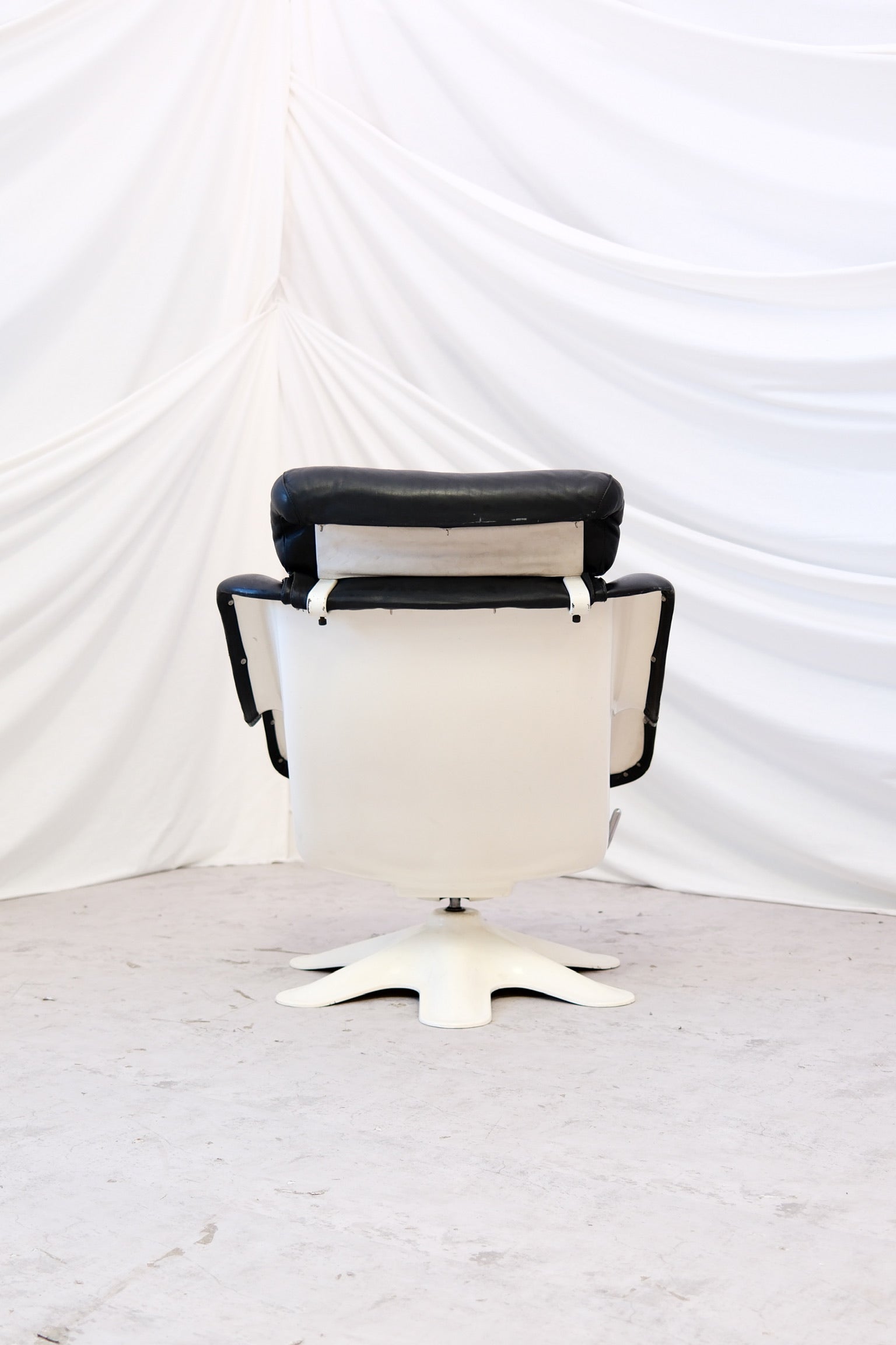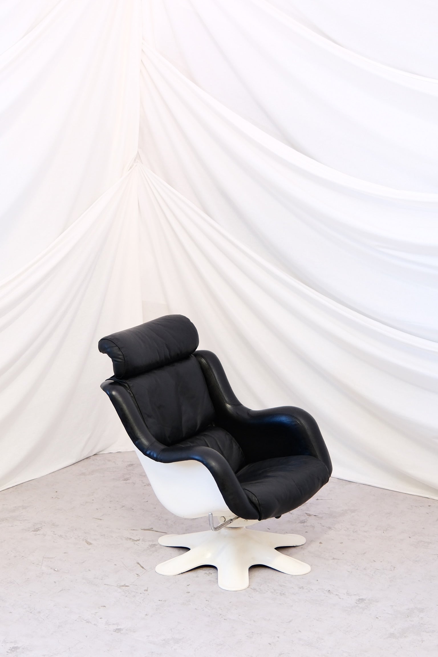 This example comes in black leather with a white shell and features the original adjustable reclining mechanism with three positions. The detachable headrest adds comfort and makes the chair easy to adapt for different users. A refined and functional piece of Finnish modern design.