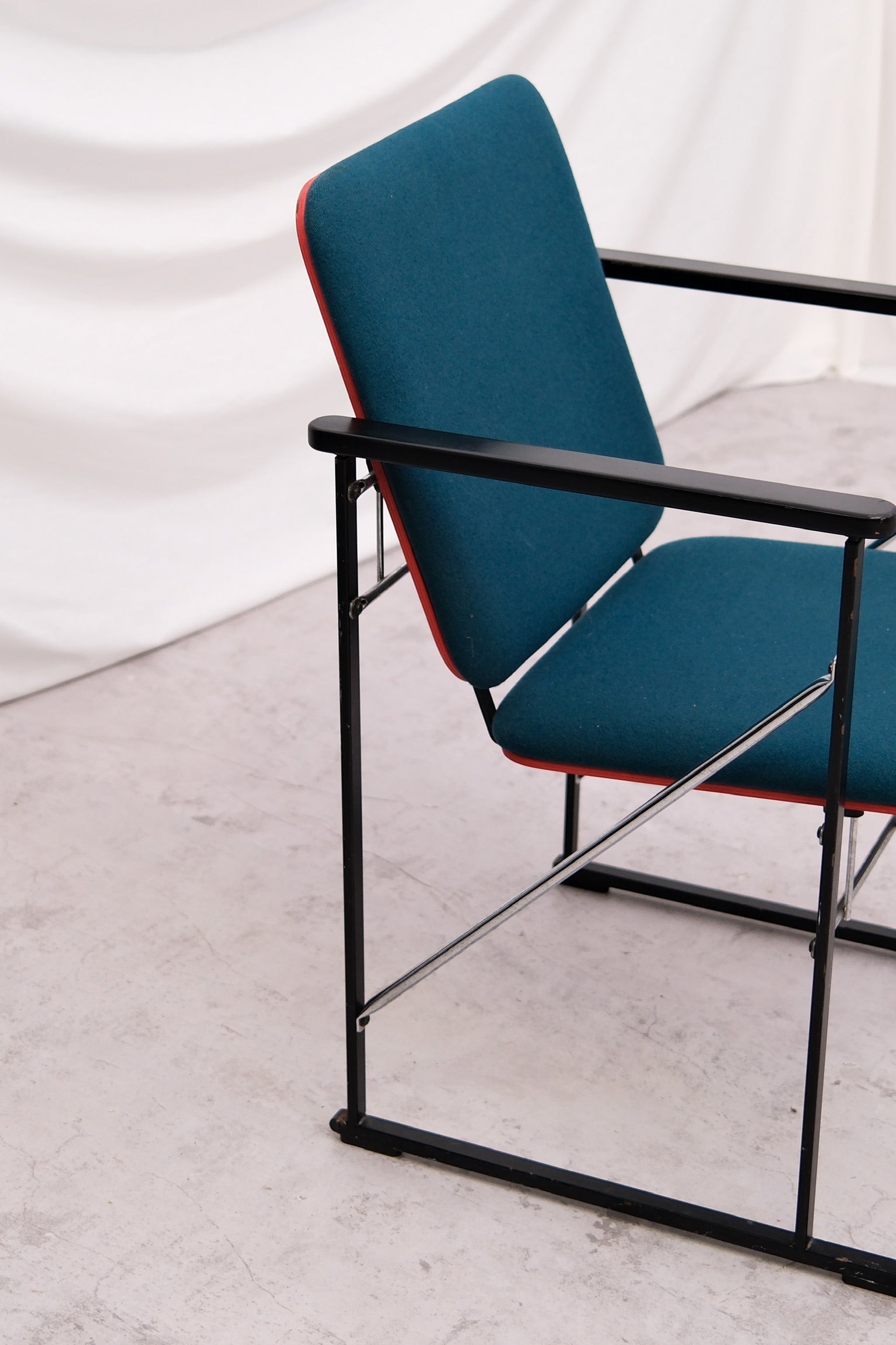 Yrjö Kukkapuro A-502 chair with petrol blue canvas upholstery and red detailing on the seat and backrest. The black steel frame gives it a graphic, architectural look that highlights Kukkapuro’s playful use of color and form.