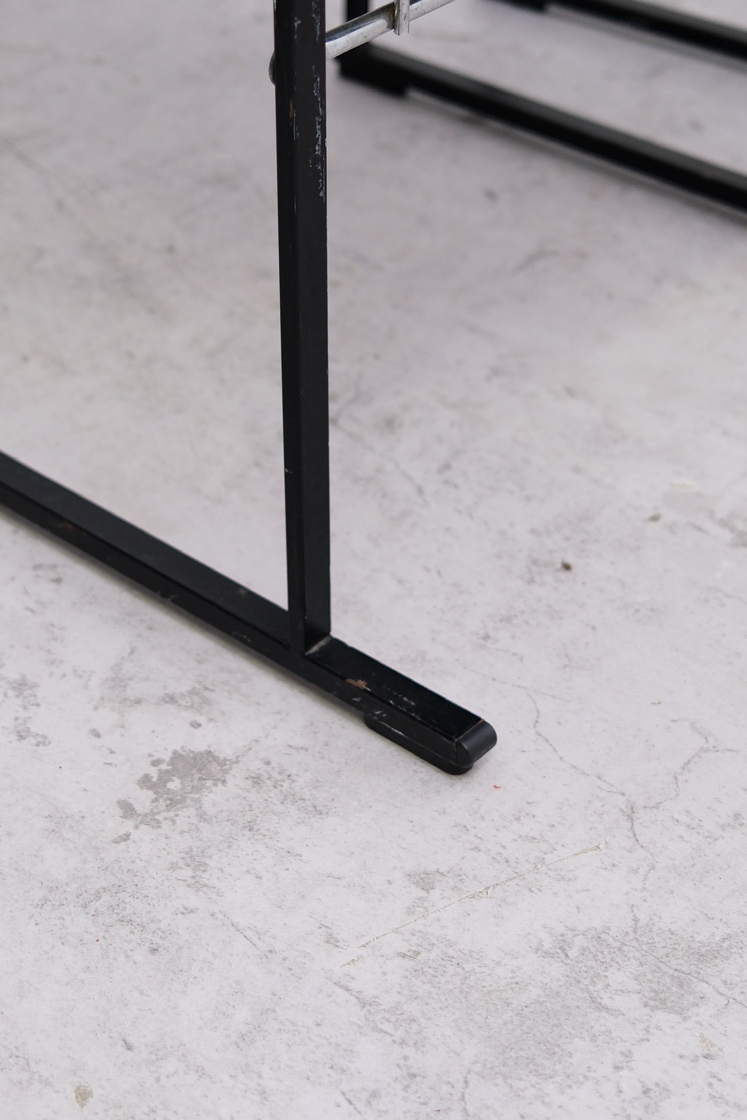 Yrjö Kukkapuro A-502 chair with petrol blue canvas upholstery and red detailing on the seat and backrest. The black steel frame gives it a graphic, architectural look that highlights Kukkapuro’s playful use of color and form. A strong example of...