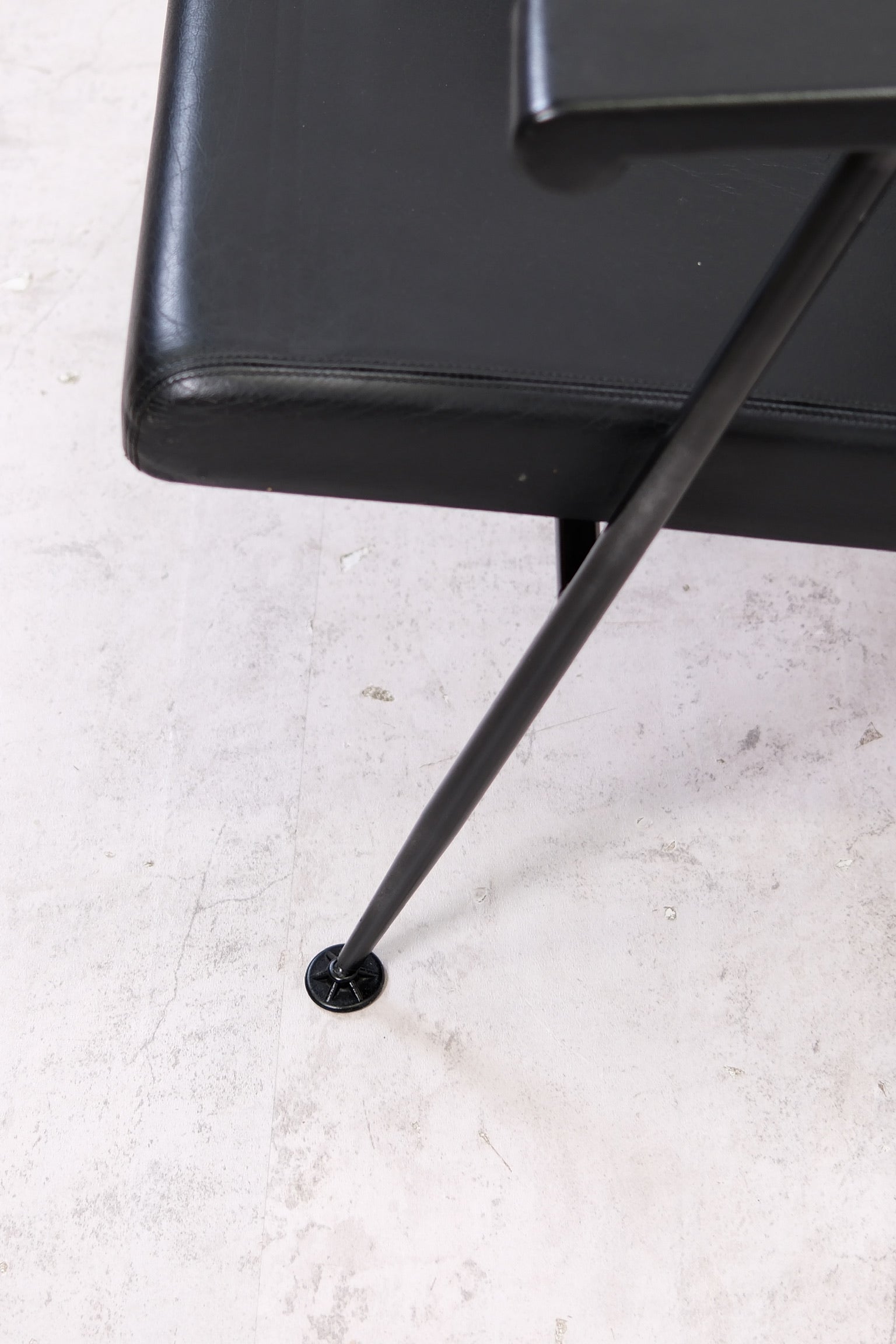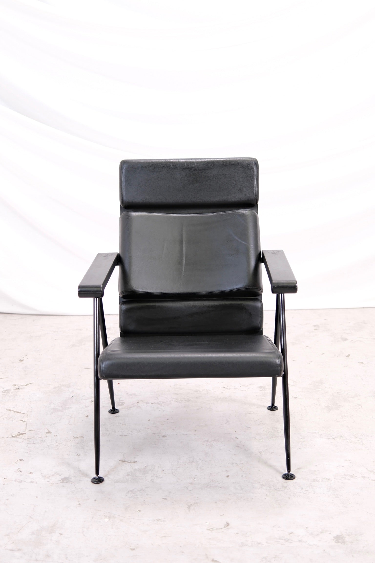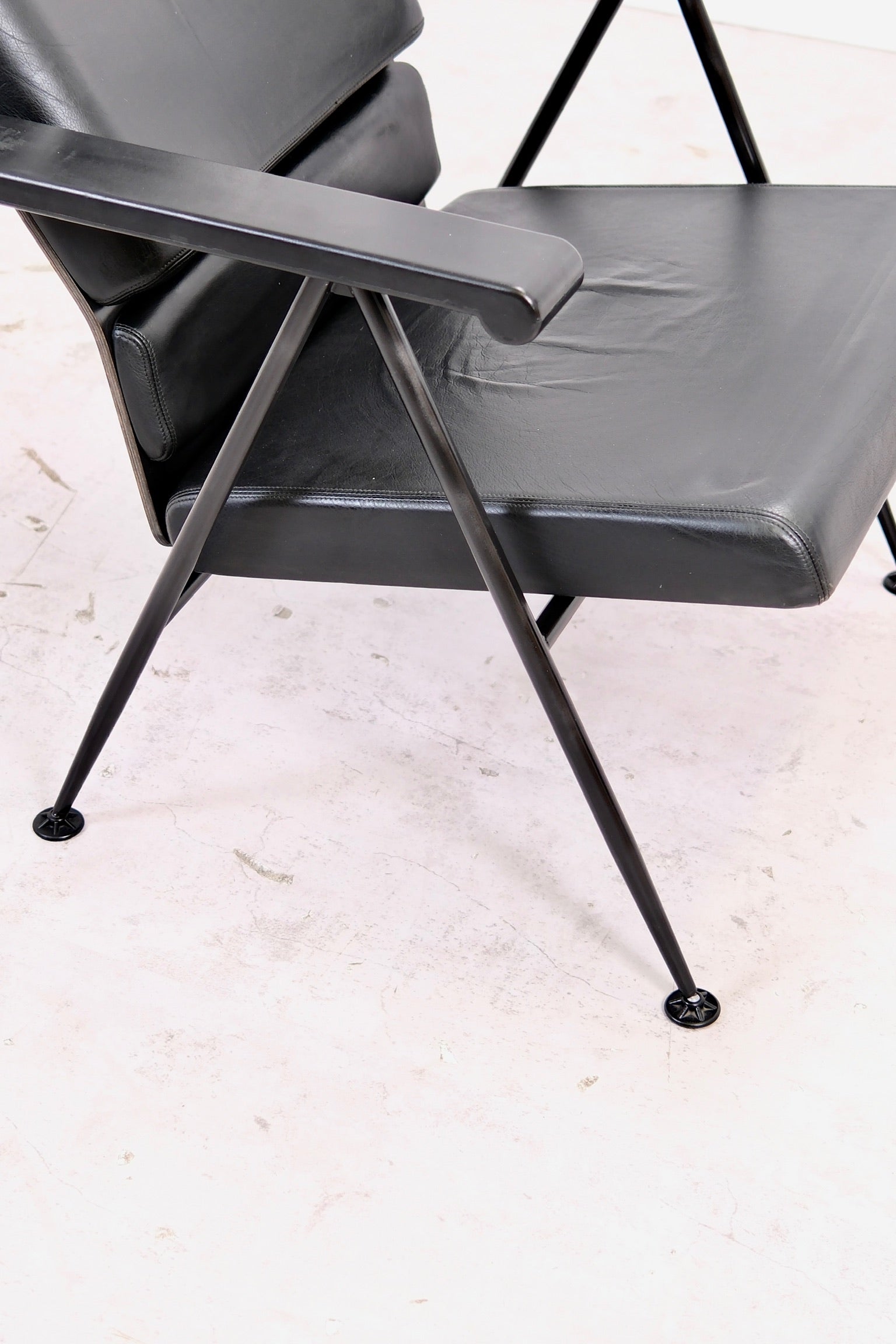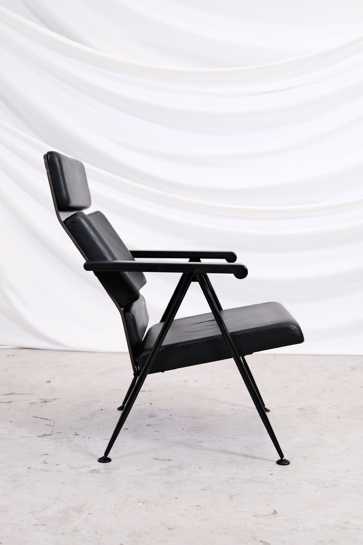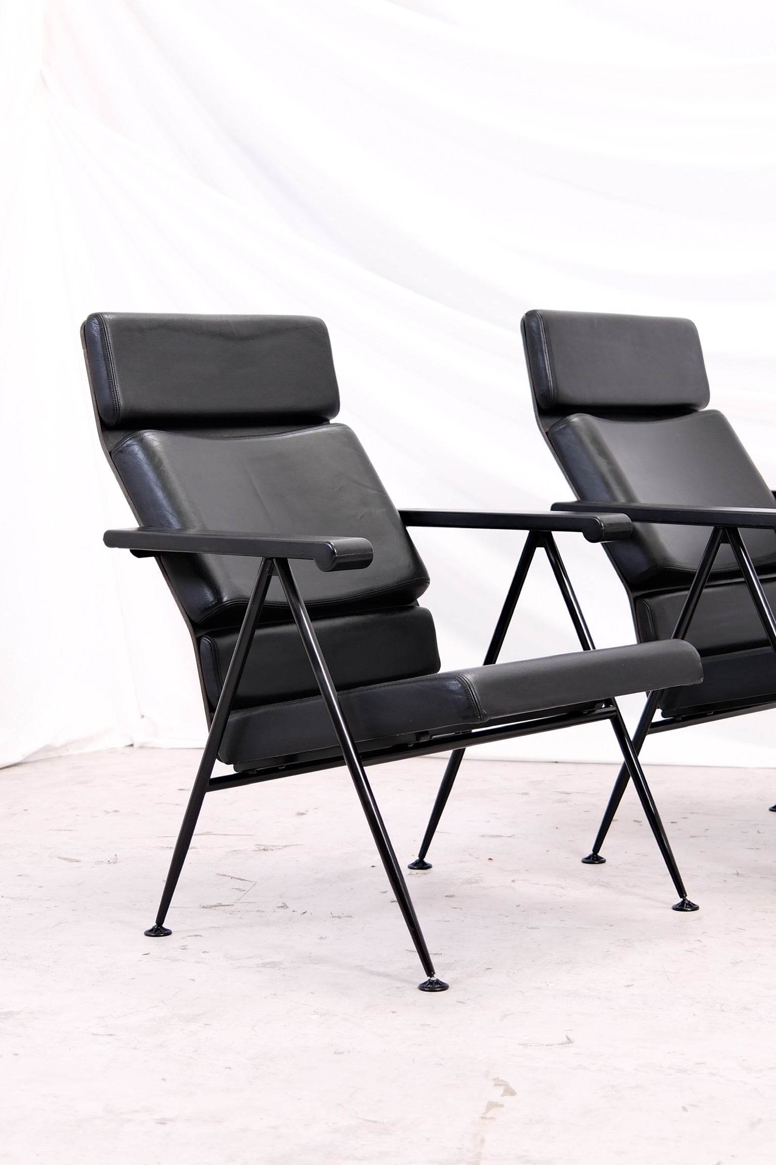 The chairs feature a black lacquered steel frame paired with black leather upholstery. The slightly reclined seat, supportive backrest, and integrated armrests create a comfortable and balanced sitting position. Visually light yet sturdy in construction, Funktus works beautifully as a lounge chair in living rooms, studios, or public interiors.